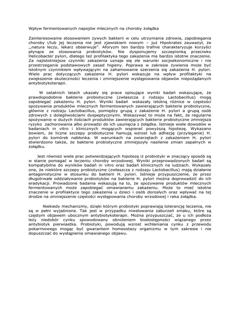 Wpływ fermentowanych napojów mlecznych na choroby żołądka Zainteresowanie stosowaniem żywych bakterii w celu utrzymania zdrowia, zapobiegania choroby i/lub jej leczenia nie jest zjawiskiem nowym – już Hipokrates zauważył, że ,,natura leczy, lekarz obserwuje”. Aforyzm ten bardzo trafnie charakteryzuje korzyści płynące ze stosowania probiotyków. Nie dysponujemy szczepionką przeciwko Helicobacter pylori, dlatego też profilaktyka tego zakażenia ma bardzo istotne znaczenie. Za najistotniejsze czynniki zakażenia uznaje się złe warunki socjoekonomiczne i nie przestrzeganie podstawowych zasad higieny. Poprawa w zakresie żywienia może być istotnym czynnikiem wpływającym na zahamowanie szerzenia się zakażenia H. pylori. Wiele prac dotyczących zakażenia H. pylori wskazuje na wpływ profilaktyki na zwiększenie skuteczności leczenia i zmniejszenie występowania objawów niepożądanych antybiotykoterapii. W ostatnich latach ukazały się prace opisujące wyniki badań wskazujące, że prawdopodobnie bakterie probiotyczne (zwłaszcza z rodzaju Lactobacillus) mogą zapobiegać zakażeniu H. pylori. Wyniki badań wskazały istotną różnice w częstości spożywania produktów mlecznych fermentowanych zawierających bakterie probiotyczne, głównie z rodzaju Lactobacillus, pomiędzy grupą z zakażenie H. pylori a grupą osób zdrowych z dolegliwościami dyspeptycznymi. Wskazywać to może na fakt, że regularne spożywanie w dużych ilościach produktów zawierających bakterie probiotyczne zmniejsza ryzyko zachorowania albo prowadzi do ich usunięcia z żołądka. Istnieje wiele dowodów w badaniach in vitro i klinicznych mogących wspierać powyższą hipotezę. Wykazano bowiem, że liczne szczepy probiotyczne hamują wzrost lub adhezję (przyleganie) H. pylori do komórek nabłonka. W warunkach na zwierzętach z zakażeniem H. pylori stwierdzono także, że bakterie probiotyczne zmniejszyły nasilenie zmian zapalnych w żołądku. Jest również wiele prac potwierdzających hipotezę iż probiotyki w znaczący sposób są w stanie pomagać w leczeniu choroby wrzodowej. Wyniki przeprowadzonych badań są kompatybilne do wyników badań in vitro oraz badań klinicznych na ludziach. Wykazały one, że niektóre szczepy probiotyczne (zwłaszcza z rodzaju Lactobacillus) mają działanie antagonistyczne w stosunku do bakterii H. pylori. Istnieje przypuszczenie, że przez długotrwałe oddziaływanie probiotyków na bakterie H. pylori można doprowadzić do ich eradykacji. Prowadzone badania wskazują na to, że spożywanie produktów mlecznych fermentowanych może zapobiegać omawianemu zakażeniu. Może to mieć istotne znaczenie w profilaktyce tego zakażenia u dzieci i osób dorosłych oraz wpływać na tej drodze na zmniejszenie częstości występowania choroby wrzodowej i raka żołądka. Niekiedy mechanizmy, dzięki którym probiotyki poprawiają tolerancję leczenia, nie są w pełni wyjaśnione. Tak jest w przypadku niwelowania zaburzeń smaku, które są częstym objawem ubocznym antybiotykoterapii. Można przypuszczać, że u ich podłoża leży niedobór cynku spowodowany obniżeniem biodostępności wiązanego przez antybiotyk pierwiastka. Probiotyki, powodują wzrost wchłaniania cynku z przewodu pokarmowego mogąc być gwarantem homeostazy organizmu w tym zakresie i nie dopuszczać do wystąpienia omawianego objawu.