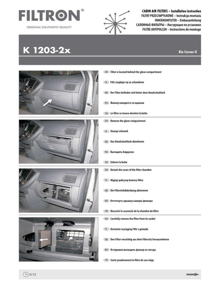 CABIN AIR FILTERS – Installation instruction FILTRY PRZECIWPYŁKOWE – Instrukcja montażu INNERAUMFILTER – Einbauanleitung САЛОННЫЕ ФИЛЬТРЫ – Инструкция по установке FILTRE ANTIPOLLEN – Instructions de montage K 1203-2x Kia Carens II Filter is located behind the glove compartment Filtr znajduje się za schowkiem Der Filter befindet sich hinter dem Handschuhfach Фильтр находится за ящиком Le filtre se trouve derrière la boîte Remove the glove compartment Usunąć schowek Das Handschuhfach abnehmen Вытащить бардачок Enlever la boîte Detach the cover of the filter chamber Wypiąć pokrywę komory filtra Die Filterteilabdeckung abtrennen Отстегнуть крышку камеры фильтра Ressortir le couvercle de la chambre du filtre Carefully remove the filter from its socket Ostrożnie wyciągnąć filtr z gniazda Den Filter vorsichtig aus dem Filtersitz herausnehmen Осторожно вытащить фильтр из гнезда Sortir prudemment le filtre de son siège 0:15 CABIN AIR FILTERS – Installation instruction FILTRY PRZECIWPYŁKOWE – Instrukcja montażu · INNERAUMFILTER – Einbauanleitung · САЛОННЫЕ ФИЛЬТРЫ – Инструкция по установке · FILTRE ANTIPOLLEN – Instructions de montage K 1203-2x 1165-2x K 1165A-2x Carefully remove the second filter, install the new one and perform the previous actions in the opposite order Ostrożnie usunąć drugi filtr, następnie zamontować nowe oraz wykonać powyższe czynności w kolejności odwrotnej Die verschmutzten Filter vorsichtig entfernen, gegen neue ersetzen und die o.g. Schritte in umgekehrter Reihenfolge durchführen Осторожно удалить второй фильтр, затем смонтировать новые и проделать вышеописанные действия в обратной очередности Ressortir le second filtre, placer des nouveaux filtres et réaliser les opérations énumérées ci-dessus dans l’ordre inverse WIX-FILTRON SP. Z O.O. UL. WROCŁAWSKA 145, 63-800 GOSTYŃ, POLAND TEL.:+48 65 572 89 00 FAX: +48 65 572 89 22 www.filtron.eu e-mail: [email protected]
