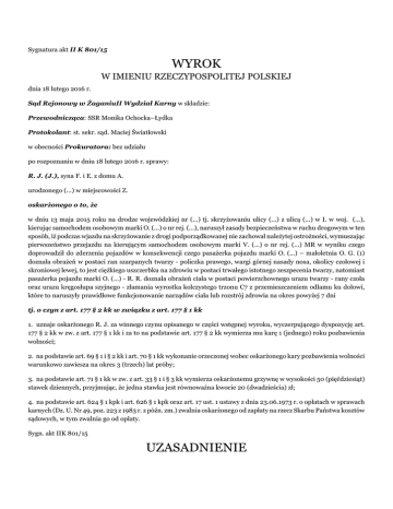 Sygnatura akt II K 801/15 WYROK W IMIENIU RZECZYPOSPOLITEJ POLSKIEJ dnia 18 lutego 2016 r. Sąd Rejonowy w ŻaganiuII Wydział Karny w składzie: Przewodnicząca: SSR Monika Ochocka–Łydka Protokolant: st. sekr. sąd. Maciej Światłowski w obecności Prokuratora: bez udziału po rozpoznaniu w dniu 18 lutego 2016 r. sprawy: R. J. (J.), syna F. i E. z domu A. urodzonego (...) w miejscowości Z. oskarżonego o to, że w dniu 13 maja 2015 roku na drodze wojewódzkiej nr (...) tj. skrzyżowaniu ulicy (...) z ulicą (...) w I. w woj. (...), kierując samochodem osobowym marki O. (...) o nr rej. (...), naruszył zasady bezpieczeństwa w ruchu drogowym w ten sposób, iż podczas wjazdu na skrzyżowanie z drogi podporządkowanej nie zachował należytej ostrożności, wymuszając pierwszeństwo przejazdu na kierującym samochodem osobowym marki V. (...) o nr rej. (...) MR w wyniku czego doprowadził do zderzenia pojazdów w konsekwencji czego pasażerka pojazdu marki O. (...) – małoletnia O. G. (1) doznała obrażeń w postaci ran szarpanych twarzy - policzka prawego, wargi górnej nasady nosa, okolicy czołowej i skroniowej lewej, to jest ciężkiego uszczerbku na zdrowiu w postaci trwałego istotnego zeszpecenia twarzy, natomiast pasażerka pojazdu marki O. (...) - R. R. doznała obrażeń ciała w postaci powierzchownego urazu twarzy - rany czoła oraz urazu kręgosłupa szyjnego - złamania wyrostka kolczystego trzonu C7 z przemieszczeniem odłamu ku dołowi, które to naruszyły prawidłowe funkcjonowanie narządów ciała lub rozstrój zdrowia na okres powyżej 7 dni tj. o czyn z art. 177 § 2 kk w związku z art. 177 § 1 kk 1. uznaje oskarżonego R. J. za winnego czynu opisanego w części wstępnej wyroku, wyczerpującego dyspozycję art. 177 § 2 kk w zw. z art. 177 § 1 kk i za to na podstawie art. 177 § 2 kk wymierza mu karę 1 (jednego) roku pozbawienia wolności; 2. na podstawie art. 69 § 1 i § 2 kk i art. 70 § 1 kk wykonanie orzeczonej wobec oskarżonego kary pozbawienia wolności warunkowo zawiesza na okres 3 (trzech) lat próby; 3. na podstawie art. 71 § 1 kk w zw. z art. 33 § 1 i § 3 kk wymierza oskarżonemu grzywnę w wysokości 50 (pięćdziesiąt) stawek dziennych, przyjmując, że jedna stawka jest równoważna kwocie 20 (dwadzieścia) zł; 4. na podstawie art. 624 § 1 kpk i art. 626 § 1 kpk oraz art. 17 ust. 1 ustawy z dnia 23.06.1973 r. o opłatach w sprawach karnych (Dz. U. Nr 49, poz. 223 z 1983 r. z późn. zm.) zwalnia oskarżonego od zapłaty na rzecz Skarbu Państwa kosztów sądowych, w tym zwalnia go od opłaty. Sygn. akt IIK 801/15 UZASADNIENIE W miejscowości I. woj. (...) znajduje się skrzyżowanie dróg, z których jedna – ul. (...) jest ulicą nadrzędną, zaś ulica (...) – podporządkowaną. Powyższe oznaczone jest oznakowaniem pionowym w postaci znaków A-7 – ustąp pierwszeństwa przejazdu na ul. (...) oraz D-1 – droga z pierwszeństwem na ulicy (...). Drogi krzyżują się pod kątem prostym. W dniu 13 maja 2015r. ok. godz. 12.00 R. J. wybrał się wraz ze swoją dziewczyną A. R., jej córką O. G. (1), siostrą A. R. R. oraz jej matką M. R. z K. do I. na zakupy. R. J. kierował samochodem marki O. (...) nr rej. (...), obok niego jako pasażer siedziała A. R., pozostałe osoby siedziały z tyłu pojazdu. Ok. godziny 12.20 R. J. jechał ulicą (...). W tym samym czasie drogą nadrzędną – ulicą (...) - jechał samochodem marki O. (...) nr rej. (...) M. S., który poruszał się z prędkością dopuszczalną w tym miejscu – 48 km/h. R. J. zbliżając się do skrzyżowania nie zachował wymaganej szczególnej ostrożności, nie zredukował prędkości jadąc z prędkością 55 km/h przy dopuszczalnej w tym miejscu 50 km/h, nie zatrzymał się przed skrzyżowaniem i nie ustąpił pierwszeństwa przejazdu jadącemu ulicą (...). W wyniku powyższego doszło do zderzenia obu pojazdów – samochód kierowany przez M. S. uderzył czołową częścią w prawy bok O. (...) na wysokości przednich i tylnych drzwi prawego boku pojazdu. W konsekwencji pasażerka O. (...) małoletnia O. G. (2) doznała obrażeń w postaci ran szarpanych twarzy – policzka prawego, wargi górnej nasady nosa, okolicy czołowej i skroniowej lewej, to jest ciężkiego uszczerbku na zdrowiu w postaci trwałego istotnego zeszpecenia twarzy, natomiast pasażerka tergo pojazdu R. R. doznała obrażeń ciała w postaci powierzchownego urazu twarzy – rany czoła oraz urazu kręgosłupa szyjnego – złamania wyrostka kolczystego trzonu C7 z przemieszczeniem odłamu ku dołowi, które to naruszyły prawidłowe funkcjonowanie narządów ciała lub rozstrój zdrowia na okres powyżej 7 dni. dowód: wyjaśnienia oskarżonego R. J. – k. 163 – 164 akt zeznania świadka M. S. – k. 22 – 23 zbioru dokumentów zeznania świadka M. R. – k. 33 zbioru dokumentów zeznania świadka R. R. – k. 39 – 40 zbioru dokumentów zeznania świadka A. R. – k. 51 – 52, 91 - 92 zbioru dokumentów opinia biegłego Z. T. – k. 126 – 150 akt orzeczenie sądowo – lekarskie – k. 109, 74 akt notatka urzędowa – k. 1-2 akt notatka o wypadku drogowym – k. 3 akt protokół badań – k. 5, 15 akt protokół oględzin pojazdu – k. 6-7, 8-9 akt protokół oględzin miejsca – k. 16 -18 akt dokumentacja medyczna – k. 59, 65 akt Oskarżony R. J. w postępowaniu przygotowawczym przyznał się do popełnienia zarzucanego mu czynu wyjaśniając, że nie zna miejscowości I., pierwszy raz jechał tamtą drogą, nie zna topografii miasta i nie zauważył, że na ulicy (...) znajdował się znak nakazujący ustąpienie pierwszeństwa przejazdu. Jednocześnie wyraził wolę dobrowolnego poddania się karze. Wyjaśnienia oskarżonego odnośnie przebiegu wypadku znalazły pełne potwierdzenie w zeznaniach świadków A. R., R. R., M. R. oraz M. S., jak i w pozostałych dokumentach. Powołany w sprawie biegły z zakresu badania wypadków drogowych Z. T. (2) przeanalizował pr