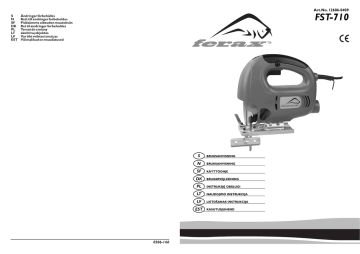 Art.No. 12606-0409 S N SF DK PL LT LV EST FST-710 Ändringar förbehålles Rett till endringer forbeholdes Pidätämme oikeuden muutoksiin Ret til ændringer forbeholdes Temat do zmiany akeitimų objektas Var tikt veiktas izmai¿as Võimalikud on muudatused S BRUKSANVISNING N BRUKSANVISNING SF KÄYTTÖOHJE DK BRUGERVEJLEDNING PL INSTRUKSJĘ OBSŁUGI LT NAUDOJIMO INSTRUKCIJA LV LIETOŠANAS INSTRUKCIJA EST 0506-14A KASUTUSJUHEND ALLMÄNT Grattis! Genom att köpa det här högkvalitativa verktyget från Ferax har du gjort ett utmärkt val. Ferax produkter är robusta, säkra och lätta att använda. Det är mycket viktigt att verktyget hanteras omsorgsfullt och att det regelbundet underhålls enligt instruktionerna.Av denna anledning ber vi dig läsa igenom dessa instruktioner noggrant. Du kommer att ha glädje av ditt verktyg från Ferax i många år. Specifikationer Spänning Frekvens Strömförbrukning Slagtal i tomgång Max.materialtjocklek (trä) Slaglängder Max.slaglängd Fasvinkel Vikt Lpa (ljudtryck) Lwa (ljudnivå) Vibrationsnivå 230V~ 50 Hz 710W 800-3000/min 70 mm 1 fast,3 justerbara 18 mm 0-45° 2,3 kg 81,1 dB(A) 92,1 dB(A) 2,09 m/s2 Förpackningens innehåll • • • • • • • • Sticksåg 3 sågblad 1 sexkantsnyckel 1 parallell sågskena 1 adapter för dammutsugning Bruksanvisning Garantikort Säkerhetsinstruktioner Apparaten är elektriskt isolerad i överensstämmelse med EN50144 och måste därför inte jordas. Säkerhetsföreskrifter Följande symboler används i denna bruksanvisning: Varning: Om dessa instruktioner inte åtföljs kan det medföra risk för allvarliga eller livshotande kroppsskador,eller risk för skada på maskinen. Varning:elektrisk ström Kontrollera alltid att spänningen i elnätet motsvarar spänningsspecifikationerna för apparaten. Produktinformation Siktkontroll före arbete påbörjas Hårda material som exempelvis stål, aluminium,plast Mjuka material som exempelvis trä Precisionsarbete Sexkantsnyckel Smörjning Återvinning 1. Hastighetsjustering 2. Låsknapp för avtryckare 3. Avtryckare 4. Dammtömning 5. Fotplatta 2 6. Sågbladshållare 7. Slaglängdsjustering 8. Säkerhetsskydd Låsa upp/låsa Skadade och/eller kasserade elektriska och elektroniska apparater ska lämnas in enligt gällande miljöregler. Ferax Ferax 51 ALLMÄNNA SÄKERHETSINSTRUKTIONER OBS! När elektriska apparater används måste alltid grundläggande regler för säkerhet iakttas, inklusive de föreskrifter som beskrivs nedan,för att förhindra risk för elektrisk stöt,brand och kroppsskada. Före produkten används ber vi dig läsa igenom dessa instruktioner noggrant och förvara dem på en säker plats för senare referens. Tips för säker användning: 1 Håll arbetsområdet rent och snyggt • Största risken för att olyckor sker är i oordentliga arbetsområden och bänkar. 2 Ta hänsyn till omgivningsvillkor • Utsätt inte elektriska verktyg för regnvatten. • Använd aldrig elektriska verktyg under fuktiga eller blöta omständigheter. • Se till att arbetsområdet är väl upplyst. • Använd aldrig elektriska verktyg där det finns risk för förbränning eller explosion. 3 Skydda dig själv mot elektriska stötar • Undvik kroppskontakt med jordade föremål som exempelvis ledningsrör,element,värmekroppar och/eller kylskåp. 4 Håll barn på avstånd • Låt inga andra personer mixtra med den elektriska apparaten eller nätsladden. • Håll alla andra personer på avstånd från arbetsområdet. 5 Förvara elektriska verktyg på en säker plats • När de inte används ska elektriska verktyg förvaras på en låst,torrt och inte utsatt plats som är utom räckhåll för barn. 6 Undvik att överbelasta det elektriska verktyget • Du kommer att arbeta på ett säkrare och effektivare sätt om du håller dig till verktygets specifikationer. 7 Använd rätt verktyg för jobbet • Använd inte elektriska verktyg eller tillbehör med för låg effekt för tungt arbete. • Använd inte elektriska verktyg för arbeten som de inte är avsedda att utföra. 8 Bär lämplig arbetsklädsel • Använd inte löst sittande kläder, slipsar eller smycken som skulle kunna fastna i maskinens rörliga delar. • När du arbetar utomhus rekommenderar vi starkt att handskar och halkfria skor används. • Använd ett hårnät om du har långt hår. 9 Använd säkerhetsglasögon • Använd ett dammskydd om arbetet genererar damm. 50 Ferax Ferax 10 Anslut en dammutsugningsanordning • Om apparaten monteras med en adapter för anslutning till en dammutsugningsanordning, se till att den är ansluten och fungerar på ett riktigt sätt. 11 Ta hand om nätsladden och undvik missbruk • Bär inte den elektriska apparaten genom att hålla i nätsladden och dra aldrig i nätsladden när du tar ut kontakten ur vägguttaget. • Skydda nätsladden från värme,olja och vassa objekt. 12 Ha ett fast grepp om arbetstycket • Använd klämmor eller ett skruvstycke så att arbetsstycket sitter stadigt när du arbetar. Det här är ett säkrare sätt att hålla i det än att hålla det i handen,och håller båda händerna fria till att manövrera maskinen. 13 Undvik onormala arbetspositioner • Se alltid till att du står stadigt och att du inte kan tappa balansen. 14 Se till att ditt elektriska verktyg underhålls på ett korrekt sätt • Håll skärverktyg vassa och rena så att du kan arbeta på ett säkert och snyggt sätt. • Observera instruktionerna för smörjning och byte av verktyg. • Kontrollera regelbundet nätsladden och vägguttaget och låt nödvändiga byten göras av en officiell reparatör. • Kontrollera förlängningssladdar regelbundet och byt ut dem om de är skadade. • Håll handtag torra och rena från smörjfett och olja. 15 Ta ut kontakten ur vägguttaget • När verktyget inte används, före underhåll utförs och när skärtillbehör byts ut,till exempel sågblad. 16 Lämna aldrig skruvmejslar eller justeringsverktyg i maskinen 