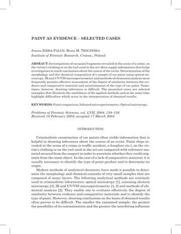PAINT AS EVIDENCE – SELECTED CASES Janina ZIÊBA-PALUS, Beata M. TRZCIÑSKA Institute of Forensic Research, Cracow, Poland ABSRACT: Investigations of car paint fragments revealed at the scene of a crime, on the victim’s clothing or on the tool used in the act often supply information that helps investigators to reach conclusions about the course of the event. Determination of the morphology and the chemical composition of a sample of car paint using optical microscopy, IR and UV/VIS microspectrometry and methods of elemental analysis most frequently permits effective assessment of the degree of similarity between the evidence and comparative material and ascertainment of the type of car paint. Sometimes, however, drawing inferences is difficult. The presented cases are selected examples that illustrate the usefulness of the applied methods and at the same time highlight difficulties which occur in the interpretation of obtained results. KEY WORDS: Paint comparison; Infrared microspectrometry; Optical microscopy. Problems of Forensic Sciences, vol. LVII, 2004, 124–138 Received 10 February 2004; accepted 17 March 2004 INTRODUCTION Criminalistic examination of car paints often yields information that is helpful in drawing inferences about the course of an event. Paint chips revealed at the scene of a crime (a traffic accident, a burglary etc.), on the victim’s clothing or on the tool used in the act are compared with reference material secured from the suspect in order to ascertain whether they could originate from the same object. In the case of a lack of comparative material, it is usually necessary to identify the type of paint product and to determine its origin. Modern methods of analytical chemistry have made it possible to determine the morphology and chemical contents of very small samples that are composed of many layers. The following analytical methods are routinely used in criminalistic laboratories: optical microscopy [1], scanning electron microscopy [3], IR and UV/VIS microspectrometry [4, 5] and methods of elemental analysis [2]. They enable one to evaluate effectively the degree of similarity between evidence and comparative materials and to identify the type of paint. However, drawing conclusions on the basis of obtained results often proves to be difficult. The smaller the examined sample, the greater the possibility of its contamination and the greater the interfering influence 125 Paint as evidence – selected cases of the substrate. Knowledge of how widely a given type of paint is used in the area also plays a significant role. When preparing an expert report, one should always take into account, apart from the results of examinations, such factors as the influence of the circumstances of the event, the state of the submitted samples and their change with time. These factors play a decisive role in the conclusions reached in criminalistic expert reports. The presented cases are selected examples that illustrate both the usefulness of the applied methods and at the same time the difficulties encountered in interpretation of the obtained results. METHODS OF RESEARCH The morphological structure of samples of paints was studied using optical microscopy with the use of a SMZ-U (Nikon) stereoscopic microscope, a Biolar (PZO) polarisation microscope and a Labophot 2 (Nikon) fluorescence microscope. The chemical composition of layers visible in a cross-section of the examined fragments of car paints was determined by IR spectrometry using an FTS 40A spectrometer with a UMA 500, Digilab/BioRad microscope and a JSM-5800 scanning electron microscope (Jeol) with a Link ISIS 300 energy dispersive X-ray spectrometer (Oxford Instruments). THE CASE REPORTS Case 1 In summer, the partly undressed body of a man was found by chance in a shallow pond situated next to a fairly quiet local road. An undamaged bicycle was also found in a ditch by the side of the road. The autopsy performed showed that the direct cause of the death of the man was drowning and that the body had lain in the water for about 48 hours. Inspection of the victim’s clothing revealed microfragments of green paint on the surface of the clothing, which suggested that the man could have been the victim of a traffic accident. During a detailed inspection of the scene of the event, fragments of green paint were found on the road. During the investigation, a witness was found who testified that two days before the body was discovered, he had seen a man late in the evening walking along the road, pushing a bicycle. He also noticed a car passing by at the same time, probably a Fiat 126p of a dark colour. It was established that a green Fiat 126p belonging to a resident of a nearby housing estate could have been involved in the incident. The car, however, had already been sold for parts and it was impossible to take 126 J. Ziêba-Palus, B. M. Trzciñska samples of the paint for comparative study. The investigation, however, was continued and three years after the incident, a fragment of a car body with an identifying mark, originating from this vehicle, was found. The following were submitted for physical and chemical examination: the victim’s clothing, car paint chips collected from the clothing and from the road and a fragment of the body of the suspected vehicle. The aim of the examinations was to determine whether the paint revealed on the victim’s clothing, the paint at the scene of the event and that originating from the car body were of the same type. A positive answer would confirm the hypothesis that the car belonging to the suspect had taken part in the event, as a result of which the cyclist was hit. During optical examinations of the submitted clothing, several additional green paint fragments were found on its surface – a cross section revealed many layers visible, hence originating from a repainted, repaired paint coat. However, the presence of other traces that usually accompany these types of eve