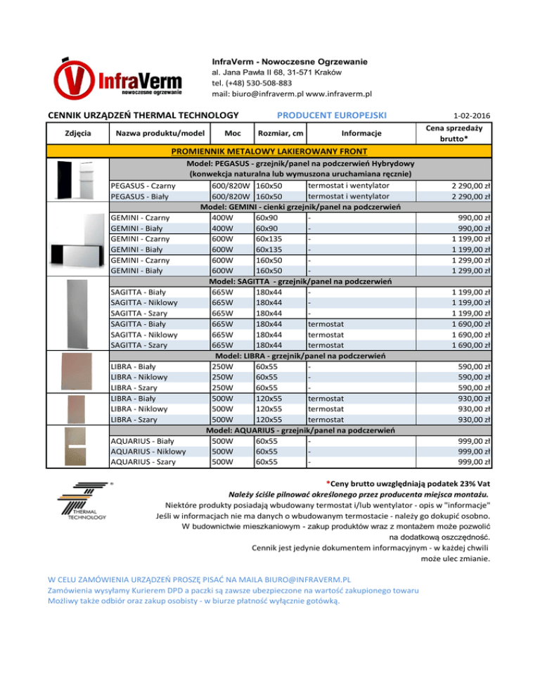 InfraVerm - Nowoczesne Ogrzewanie al. Jana Pawła II 68, 31-571 Kraków tel. (+48) 530-508-883 mail: [email protected] www.infraverm.pl CENNIK URZĄDZEŃ THERMAL TECHNOLOGY Zdjęcia Nazwa produktu/model Moc PRODUCENT EUROPEJSKI Rozmiar, cm Informacje 1-02-2016 Cena sprzedaży brutto* PROMIENNIK METALOWY LAKIEROWANY FRONT Model: PEGASUS - grzejnik/panel na podczerwień Hybrydowy (konwekcja naturalna lub wymuszona uruchamiana ręcznie) termostat i wentylator PEGASUS - Czarny 600/820W 160x50 termostat i wentylator PEGASUS - Biały 600/820W 160x50 Model: GEMINI - cienki grzejnik/panel na podczerwień GEMINI - Czarny 400W 60x90 GEMINI - Biały 400W 60x90 GEMINI - Czarny 600W 60x135 GEMINI - Biały 600W 60x135 GEMINI - Czarny 600W 160x50 GEMINI - Biały 600W 160x50 Model: SAGITTA - grzejnik/panel na podczerwień SAGITTA - Biały 665W 180x44 SAGITTA - Niklowy 665W 180x44 SAGITTA - Szary 665W 180x44 SAGITTA - Biały 665W 180x44 termostat SAGITTA - Niklowy 665W 180x44 termostat SAGITTA - Szary 665W 180x44 termostat Model: LIBRA - grzejnik/panel na podczerwień LIBRA - Biały 250W 60x55 LIBRA - Niklowy 250W 60x55 LIBRA - Szary 250W 60x55 LIBRA - Biały 500W 120x55 termostat LIBRA - Niklowy 500W 120x55 termostat LIBRA - Szary 500W 120x55 termostat Model: AQUARIUS - grzejnik/panel na podczerwień AQUARIUS - Biały 500W 60x55 AQUARIUS - Niklowy 500W 60x55 AQUARIUS - Szary 500W 60x55 - 2 290,00 zł 2 290,00 zł 990,00 zł 990,00 zł 1 199,00 zł 1 199,00 zł 1 299,00 zł 1 299,00 zł 1 199,00 zł 1 199,00 zł 1 199,00 zł 1 690,00 zł 1 690,00 zł 1 690,00 zł 590,00 zł 590,00 zł 590,00 zł 930,00 zł 930,00 zł 930,00 zł 999,00 zł 999,00 zł 999,00 zł *Ceny brutto uwzględniają podatek 23% Vat Należy ściśle pilnować określonego przez producenta miejsca montażu. Niektóre produkty posiadają wbudowany termostat i/lub wentylator - opis w "informacje" Jeśli w informacjach nie ma danych o wbudowanym termostacie - należy go dokupić osobno. W budownictwie mieszkaniowym - zakup produktów wraz z montażem może pozwolić na dodatkową oszczędność. Cennik jest jedynie dokumentem informacyjnym - w każdej chwili może ulec zmianie. W CELU ZAMÓWIENIA URZĄDZEŃ PROSZĘ PISAĆ NA MAILA [email protected] Zamówienia wysyłamy Kurierem DPD a paczki są zawsze ubezpieczone na wartość zakupionego towaru Możliwy także odbiór oraz zakup osobisty - w biurze płatność wyłącznie gotówką.