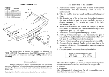 FITTING INSTRUCTION Clamp mark in acc. with ISO PN 1 L 2 + 3 31 4 R 5 58R 6 54 7 58L The instruction of the assembly Cables joining A Left directional lights Rear fog lights Ground Right directional lights Right side parking lights Stoplights Left side parking lights 10 4 7 7 A 7 7 1 6 5 4 3 2 This towing hitch is designed to assembly in following car: FORD MONDEO, 5 door, produced since 03.2007, catalogue no. C54A and is prepared to tow trailers max total weight 2120 kg and max vertical mass 80 kg. 1. Disassemble bumper together with its metal reinforcrment (reinforcement will not reinstall). Screw in bolts of reinforcement. 2. Take of a muffler from last handle and disassemble heatproof plate. 3. Slip in main bar of the towbar (pos. 1) to chassis mamber that way, so holes of main bar agree with holes prepared in chassis members . Fix loosely at points A by bolts M10x40mm (pos. 7). 4. Inside chassis members put nuts on the jib (pos. 4) and fix using bolts M10x40mm (pos. 7) as shown in the figure. Use big washers (pos. 10) – see figure. 5. Reassemble heatproof plate and hang up a muffler. 6. Fix body of the automat (pos. 5) and the socket plate (pos. 3) using bolts M12x25mm (pos. 6) from accessories. Place towball (pos. 2) according to supplied instruction. 7. Tighten all bolts according to the torque shown in the table. 8. Connect electric wires of 7-poles socket according to the instruction of the car. (Recommend to make at authorized service station). 9. Complete paint layer damaged during installation. Torque settings for nuts and bolts (8,8): M 8 - 25 Nm M 10 - 55 Nm M 12 - 85 Nm M 14 - 135 Nm NOTE From manufacturer Thank you for buying our product. Their reliability has been confirmed in many tests. Reliability of towing hitch depends also on correct assembly and right operation. For this reasons we kindly ask to read carefully this instruction and apply to hints. The towing hitch should be install in points described by a car producer. After install the towing hitch you should get adequate note in registration book (at authorised service station). The car should be equipped with: • Indicators • Tow mirrors After 1000km check all bolts and nuts. The ball of towing hitch must be always kept clear and conserve with a grease. PPUH AUTO-HAK S.J. Towing hitch accessories: Produkcja Zaczepów Kulowych Henryk & Zbigniew Nejman 76-200 SŁUPSK ul. Słoneczna 16K tel/fax (059) 8-414-414; 8-414-413 E-mail: [email protected] www.autohak.com.pl Towing hitch (without electrical set) Class: A50-X Cat. no. C54A Technical data: D-value: 11,6 kN maximum trailer weight: 2120 kg maximum vertical cup mass: 80 kg Designed for: Manufacturer: FORD Model: MONDEO Type: 5 door produced since 03.2007 Approval number according to Directive 94/20/EC: e20*94/20*0736*00 Foreword This towing hitch is designed according to rules of safety traffic regulations. The towing hitch is a safety component and can be install only by qualified personnel. Any alteration or conversion of the towing hitch is prohibited and would lead to cancellation of design certification. Remove insulating compound and underseal from vehicle (if present) in the area of the matting surfaces of the towing hitch. The vehicle manufacturer’s specifications regarding trailer mass and max. vertical cup mass are decisive for driving whereat values for the towing hitch cannot be exceeded. D-value formula: Max trailer weight [kg] x Max vehicle weight [kg] Max trailer weight [kg] + Max vehicle weight [kg] X 9,81 = 1000 D [kN] INSTRUKCJA MontaŜu i eksploatacji zaczepu kulowego Oznaczenie zacisku wg ISO PN 1 L 2 + 3 31 4 R 5 58R 6 54 7 58L Kolejność czynności przy montaŜu 1. Zdemontować zderzak wraz z metalowym wzmocnieniem (wzmocnienie nie będzie ponownie montowane). Wkręcić ponownie śruby mocujące wzmocnienie. 2. Opuścić tłumik z tylnego zawiesia i zdemontować blachę Ŝarową. 3. Wsunąć belkę główną zaczepu (poz. 1) w podłuŜnice tak, aby otwory belki pokryły się z otworami w podłuŜnicach. Przykręcić luźno w punktach A śrubami M10x40mm (poz. 7). 4. Do podłuŜnic wsunąć nakrętki na wysięgnikach (poz. 4) i skręcić jak pokazano na rysunku śrubami M10x40mm (poz. 7). Wykorzystać duŜe podkładki (poz. 10) – patrz rysunek. 5. Zamontować blachę Ŝarową oraz podwiesić tłumik. 6. Przykręcić korpus automatu (poz. 5) śrubami M12x25mm (poz. 6) wraz z blachą pod gniazdo (poz. 3). Zamocować kulę zgodnie z instrukcją dołączaną do zaczepu z końcówką szybkodemontowalną. 7. Dokręcić wszystkie śruby z momentem jak pokazano w tabeli. 8. Podłączyć przewody gniazdka 7 – bieg. do instalacji elektrycznej zgodnie z instrukcją fabryczną samochodu (zaleca się wykonanie w ASO). 9. Uzupełnić ewentualne ubytki powłoki malarskiej zaczepu powstałe w trakcie montaŜu. A Łączenie przewodów 10 Kierunkowskazy lewe Tylne światła przeciwmgłowe Masa Kierunkowskazy prawe Światła pozycyjne prawe Światła hamowania Światła pozycyjne lewe 4 7 7 A 7 7 1 6 5 4 3 2 Zaczep kulowy przeznaczony jest do zamontowania w samochodzie: FORD MONDEO, 5 drz., produkowanym od 03.2007r., nr katalogowy C54A i słuŜy do ciągnięcia przyczep o masie całkowitej 2120 kg i nacisku na kulę max 80 kg. OD PRODUCENTA Dziękujemy za wybór produkowanego przez naszą firmę zaczepu kulowego. Jego niezawodność została potwierdzona licznymi testami oraz opiniami zadowolonych klientów. JednakŜe niezawodność zaczepów kulowych jest zaleŜna równieŜ od prawidłowego montaŜu oraz prawidłowej eksploatacji. Z tego powodu prosimy Państwa o staranne przeczytanie niniejszej instrukcji montaŜu oraz przestrzeganie właściwych wskazówek. Zaczep naleŜy zamontować w miejscach do tego celu przeznaczonych przez producenta samochodu. Zalecany moment skręcający dla śrub i nakrętek 8,8: M 8 - 25 Nm M 10 - 55 Nm M 12 - 85 Nm M 14 - 135 Nm UWAGA Po zamontowaniu zaczepu kulowego naleŜy uzyskać wpis w dowodzie rejestracyjnym poj