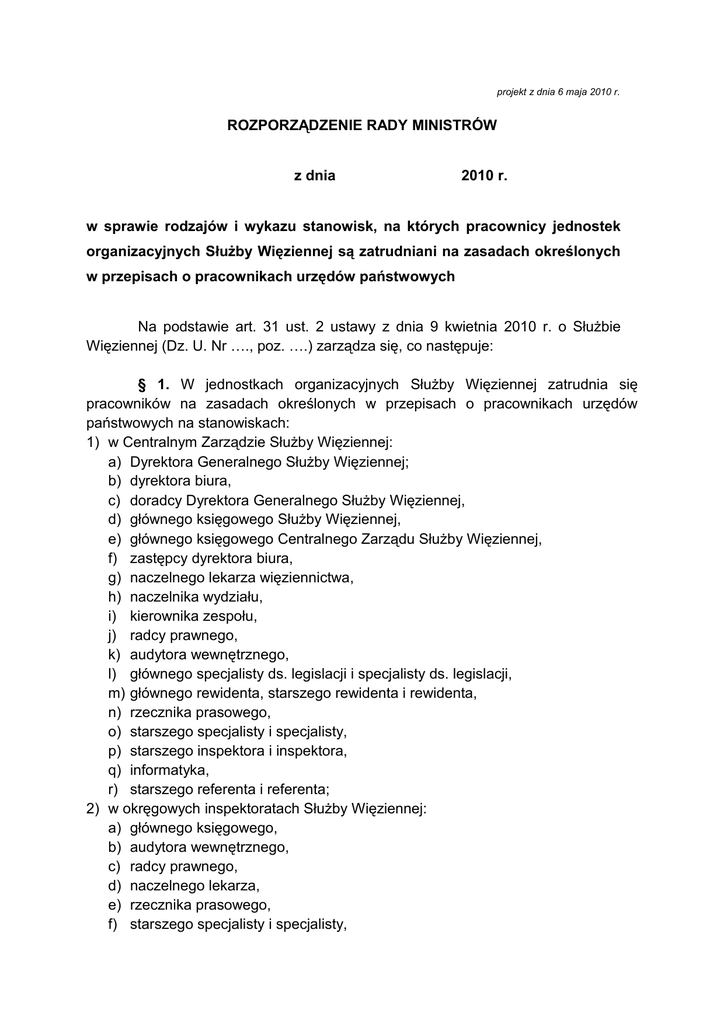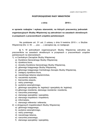 projekt z dnia 6 maja 2010 r. ROZPORZĄDZENIE RADY MINISTRÓW z dnia 2010 r. w sprawie rodzajów i wykazu stanowisk, na których pracownicy jednostek organizacyjnych Służby Więziennej są zatrudniani na zasadach określonych w przepisach o pracownikach urzędów państwowych Na podstawie art. 31 ust. 2 ustawy z dnia 9 kwietnia 2010 r. o Służbie Więziennej (Dz. U. Nr …., poz. ….) zarządza się, co następuje: § 1. W jednostkach organizacyjnych Służby Więziennej zatrudnia się pracowników na zasadach określonych w przepisach o pracownikach urzędów państwowych na stanowiskach: 1) w Centralnym Zarządzie Służby Więziennej: a) Dyrektora Generalnego Służby Więziennej; b) dyrektora biura, c) doradcy Dyrektora Generalnego Służby Więziennej, d) głównego księgowego Służby Więziennej, e) głównego księgowego Centralnego Zarządu Służby Więziennej, f) zastępcy dyrektora biura, g) naczelnego lekarza więziennictwa, h) naczelnika wydziału, i) kierownika zespołu, j) radcy prawnego, k) audytora wewnętrznego, l) głównego specjalisty ds. legislacji i specjalisty ds. legislacji, m) głównego rewidenta, starszego rewidenta i rewidenta, n) rzecznika prasowego, o) starszego specjalisty i specjalisty, p) starszego inspektora i inspektora, q) informatyka, r) starszego referenta i referenta; 2) w okręgowych inspektoratach Służby Więziennej: a) głównego księgowego, b) audytora wewnętrznego, c) radcy prawnego, d) naczelnego lekarza, e) rzecznika prasowego, f) starszego specjalisty i specjalisty, 2 g) starszego rewidenta i rewidenta, h) starszego inspektora i inspektora, i) informatyka, j) starszego referenta i referenta; 3) w aresztach śledczych i zakładach karnych: a) głównego księgowego, b) kierownika działu, c) radcy prawnego, d) zastępcy kierownika działu, e) specjalisty, f) starszego psychologa i psychologa, g) starszego wychowawcy i wychowawcy, h) starszego inspektora i inspektora, i) informatyka, j) starszego referenta i referenta; 4) w Centralnym Ośrodku Szkolenia Służby Więziennej, ośrodkach szkolenia i ośrodkach doskonalenia kadr Służby Więziennej: a) kierownika oddziału zamiejscowego, b) kierownika zakładu, c) głównego księgowego, d) kierownika działu, e) zastępcy kierownika działu, f) radcy prawnego, g) starszego psychologa i psychologa, h) starszego wykładowcy i wykładowcy, i) specjalisty, j) starszego inspektora i inspektora, k) informatyka, l) starszego referenta i referenta. § 2. Rozporządzenie wchodzi w życie z dniem ……………….…… 2010 r. Prezes Rady Ministrów 3 UZASADNIENIE Projektowane rozporządzenie jest wykonaniem upoważnienia zawartego w art. 31 ust. 2 ustawy z dnia 9 kwietnia 2010 r. o Służbie Więziennej (Dz.U. Nr ……, poz. ……). W rozporządzeniu określono stanowiska w jednostkach organizacyjnych Służby Więziennej, na których są zatrudniani pracownicy na zasadach przewidzianych dla pracowników urzędów państwowych. Wykazy stanowisk zostały wyodrębnione dla poszczególnych rodzajów jednostek, a więc dla Centralnego Zarządu Służby Więziennej, okręgowych inspektoratów Służby Więziennej, aresztów i zakładów karnych oraz ośrodków szkolenia i doskonalenia kadr Służby Więziennej. Przedmiot regulacji, określony w projekcie rozporządzenia, nie był dotychczas regulowany przepisem wydanym na podstawie ustawy z dnia 26 kwietnia 1996 r. o Służbie Więziennej. Aktualnie pracownicy zatrudniani są w Służbie Więziennej na tzw. stanowiskach administracyjnych, gospodarczych i pomocniczych, w szczególności na podstawie dwóch rozporządzeń Ministra Pracy i Polityki Społecznej wydanych na podstawie Kodeksu pracy (odrębne przepisy dot. pracowników służby zdrowia i nauczycieli): 1) z dnia 22 kwietnia 2008 r. w sprawie warunków wynagradzania za pracę i przyznawania innych świadczeń związanych z pracą dla niektórych pracowników cywilnych więziennictwa (Dz.U. Nr 73, poz. 434 oraz z 2009 r. Nr 51, poz. 408); 2) z dnia 30 kwietnia 2008 r. w sprawie warunków wynagradzania za pracę i przyznawania innych świadczeń związanych z pracą dla pracowników zatrudnionych w niektórych jednostkach państwowej sfery budżetowej (Dz.U. Nr 82, poz. 495 z późn.zm.). W stosunku do stanowisk pracowników cywilnych więziennictwa, określonych w rozporządzeniu Ministra Pracy i Polityki Społecznej z dnia 22 kwietnia 2008 r. w sprawie warunków wynagradzania za pracę i przyznawania innych świadczeń związanych z pracą dla niektórych pracowników cywilnych więziennictwa (Dz.U. Nr 73, poz. 434) dodano stanowiska: 1) w Centralnym Zarządzie Służby Więziennej: głównego księgowego Służby Więziennej, głównego księgowego Centralnego Zarządu Służby Więziennej, naczelnego lekarza więziennictwa, głównego specjalisty i specjalisty ds. legislacji, rzecznika prasowego; 2) w Okręgowym Inspektoracie Służby Więziennej – naczelnego lekarza, rzecznika prasowego, starszego instruktora i instruktora; 3) w aresztach śledczych i zakładach karnych – kierownika działu i jego zastępcy; 4) w Centralnym Ośrodku Szkolenia Służby Więziennej, ośrodkach szkolenia i ośrodkach doskonalenia kadr: kierownika oddziału zamiejscowego, kierownika zakładu, głównego księgowego, kierownika działu i jego zastępcy, radcy prawnego, starszego wykładowcy i wykładowcy, starszego psychologa i psychologa, specjalisty, starszego inspektora i inspektora, informatyka, starszego referenta i referenta. 4 W projekcie rozporządzenia przewiduje się ustanowienie stanowisk urzędników państwowych w każdej jednostce organizacyjnej Służby Więziennej, dlatego w szczególności dodano grupę stanowisk w Centralnym Ośrodku Szkolenia Służby Więziennej, ośrodkach szkolenia i ośrodkach doskonalenia kadr, które to jednostki dotychczas były pominięte w grupie stanowisk pracowników cywilnych więziennictwa, określonych ww. rozporządzeniu Ministra Pracy i Polityki Sp