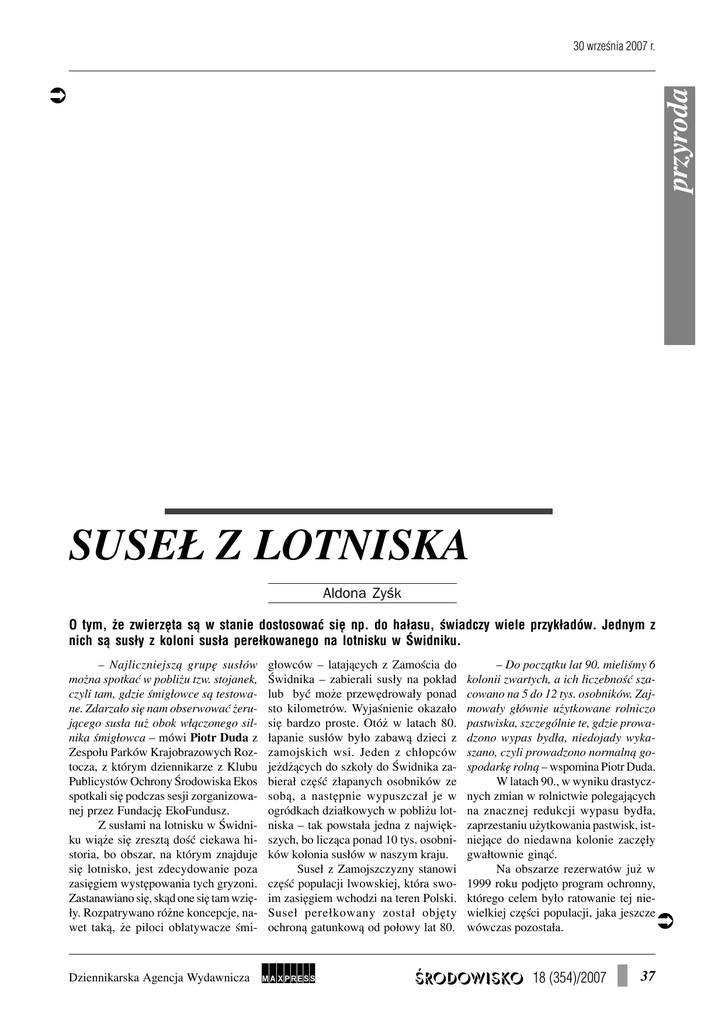 30 wrzeœnia 2007 r. przyroda  SUSE£ Z LOTNISKA Aldona Zyœk O tym, ¿e zwierzêta s¹ w stanie dostosowaæ siê np. do ha³asu, œwiadczy wiele przyk³adów. Jednym z nich s¹ sus³y z koloni sus³a pere³kowanego na lotnisku w Œwidniku. – Najliczniejsz¹ grupê sus³ów mo¿na spotkaæ w pobli¿u tzw. stojanek, czyli tam, gdzie œmig³owce s¹ testowane. Zdarza³o siê nam obserwowaæ ¿eruj¹cego sus³a tu¿ obok w³¹czonego silnika œmig³owca – mówi Piotr Duda z Zespo³u Parków Krajobrazowych Roztocza, z którym dziennikarze z Klubu Publicystów Ochrony Œrodowiska Ekos spotkali siê podczas sesji zorganizowanej przez Fundacjê EkoFundusz. Z sus³ami na lotnisku w Œwidniku wi¹¿e siê zreszt¹ doœæ ciekawa historia, bo obszar, na którym znajduje siê lotnisko, jest zdecydowanie poza zasiêgiem wystêpowania tych gryzoni. Zastanawiano siê, sk¹d one siê tam wziê³y. Rozpatrywano ró¿ne koncepcje, nawet tak¹, ¿e piloci oblatywacze œmi- Dziennikarska Agencja Wydawnicza g³owców – lataj¹cych z Zamoœcia do Œwidnika – zabierali sus³y na pok³ad lub byæ mo¿e przewêdrowa³y ponad sto kilometrów. Wyjaœnienie okaza³o siê bardzo proste. Otó¿ w latach 80. ³apanie sus³ów by³o zabaw¹ dzieci z zamojskich wsi. Jeden z ch³opców je¿d¿¹cych do szko³y do Œwidnika zabiera³ czêœæ z³apanych osobników ze sob¹, a nastêpnie wypuszcza³ je w ogródkach dzia³kowych w pobli¿u lotniska – tak powsta³a jedna z najwiêkszych, bo licz¹ca ponad 10 tys. osobników kolonia sus³ów w naszym kraju. Suse³ z Zamojszczyzny stanowi czêœæ populacji lwowskiej, która swoim zasiêgiem wchodzi na teren Polski. Suse³ pere³kowany zosta³ objêty ochron¹ gatunkow¹ od po³owy lat 80. – Do pocz¹tku lat 90. mieliœmy 6 kolonii zwartych, a ich liczebnoœæ szacowano na 5 do 12 tys. osobników. Zajmowa³y g³ównie u¿ytkowane rolniczo pastwiska, szczególnie te, gdzie prowadzono wypas byd³a, niedojady wykaszano, czyli prowadzono normaln¹ gospodarkê roln¹ – wspomina Piotr Duda. W latach 90., w wyniku drastycznych zmian w rolnictwie polegaj¹cych na znacznej redukcji wypasu byd³a, zaprzestaniu u¿ytkowania pastwisk, istniej¹ce do niedawna kolonie zaczê³y gwa³townie gin¹æ. Na obszarze rezerwatów ju¿ w 1999 roku podjêto program ochronny, którego celem by³o ratowanie tej niewielkiej czêœci populacji, jaka jeszcze wówczas pozosta³a. ŒRODOWISKO 18 (354)/2007  37 30 wrzeœnia 2007 r. przyroda  – Pierwszy program dotyczy³ ochrony 6 rezerwatów przyrody na ZamojszczyŸnie, a jego celem by³a odbudowa warunków siedliskowych, czyli przywrócenie typowej gospodarki pastwiskowej na tych terenach. Dawne pastwiska by³y odkrzaczane, koszone, a tak¿e zaorywane i zasiewanie odpowiednimi gatunkami traw. W ten sposób powsta³o nie tylko siedlisko, ale tak¿e pasza dla sus³ów. Dodatkow¹ korzyœci¹ by³o zainteresowanie miejscowych rolników wypasem byd³a na lepszych jakoœciowo ³¹kach, co tak¿e pozwala³o na bardziej naturalne przygotowywanie siedlisk dla sus³a – powiedzia³ dr Stanis³aw Sitnicki, wiceprezes Fundacji EkoFundusz i doda³, ¿e to ju¿ trzeci etap finansowania ochrony sus³a pere³kowanego na Ziemi Zamojskiej. G³ównym sponsorem programu by³a Fundacja EkoFundusz, œrodki pochodzi³y te¿ z Wojewódzkiego Funduszu Ochrony Œrodowiska i Gospodarki Wodnej w Lublinie, bud¿etu wojewody i parków krajobrazowych. – Dziêki prowadzonemu programowi uda³o siê nam nie tylko zatrzymaæ drastyczny spadek populacji, ale tak¿e doprowadziæ do wzrostu liczebnoœci sus³ów Przyk³adowo, w rezerwacie Popówka ich populacja wzros³a kilkudziesiêciokrotnie – powiedzia³ Krzysztof Próchnicki z Zespo³u Parków Krajobrazowych Roztocza. Kolonia sus³ów z lotniska w Œwidniku zosta³a w³¹czona do projek- tu w 2003 roku i od tego czasu prowadzi siê na lotnisku monitoring, a tak¿e koszenie traw, g³ównie tam, gdzie jest najwiêksze zagêszczenie sus³a. W 2003 roku okaza³o siê, ¿e na lotnisku ¿yje 11,5 tys. osobników. Obecnie wielkoœæ populacji zaczyna nieznacznie spadaæ. Kolonia sus³a zajmuje obszar prawie ca³ego lotniska, tj. oko³o 100 ha, najwiêksze zagêszczenie jest na terenach œwie¿o rekultywowanych, gdzie posiano now¹ mieszankê traw. Sus³y nie zasiedlaj¹ ca³ej p³yty lotniska, lecz tworz¹ grupy rodzinne, zapewnia im to rozwój i sta³¹ wymianê genów. Grupy rodzinne rozlokowane s¹ w ró¿nych miejscach, a kontakt miêdzy grupami nastêpuje poprzez m³odych samców, które s¹ wyrzucane z jednej grupy, a przyjmowane do innej. Jak twierdz¹ eksperci, najwiêksz¹ szansê na uratowanie sus³a stanowi du¿a liczba zwartych kolonii, naj³atwiej je monitorowaæ, wspomagaæ. – W ramach projektu finansowanego zarówno przez EkoFundusz, jak i GEF-SGP, mamy przygotowany rezerwat Gliniska, gdzie sus³y wyginê³y, a obecnie intensywnie przygotowujemy go na wprowadzenie sus³ów. Zosta³a zrekultywowana murawa, s¹ prowadzone regularne koszenia, wypas, poszukujemy œrodków finansowych i pomocy organizacyjnej, bo to doœæ trudna operacja – powiedzia³ Piotr Duda. – Mamy ju¿ pewn¹ praktykê, bo zak³adaliœmy kilka lat temu hodowlê zachowawcz¹ w Zamoœciu w ogro- dzie zoologicznym, sus³y od³awialiœmy w³aœnie z terenu Œwidnika. Suse³ pere³kowany to gryzoñ nieco podobny do wiewiórki i œwistaka. Jest drobnym zwierz¹tkiem maj¹cym torby policzkowe, ma³e uszy i krótki puszysty ogon. D³ugoœæ cia³a doros³ego osobnika wynosi od 18 do 23 cm. Podstawê jego wy¿ywienia stanowi¹ przede wszystkim nasiona, zjada pszenicê, ale tak¿e buraki cukrowe, nie powoduje jednak znacz¹cych strat w uprawach, ale okazuje siê, ¿e suse³ nie zawsze jest roœlino¿erc¹, zdarza siê, ¿e siêga po pokarm bia³kowy. Sus³y prowadz¹ naziemny tryb ¿ycia, a ich domy – nory znajduj¹ siê pod ziemi¹, tam te¿ pod opiek¹ matki pierwszy miesi¹c ¿ycia spêdzaj¹ m³ode. Suœle domy to niezwykle skomplikowane