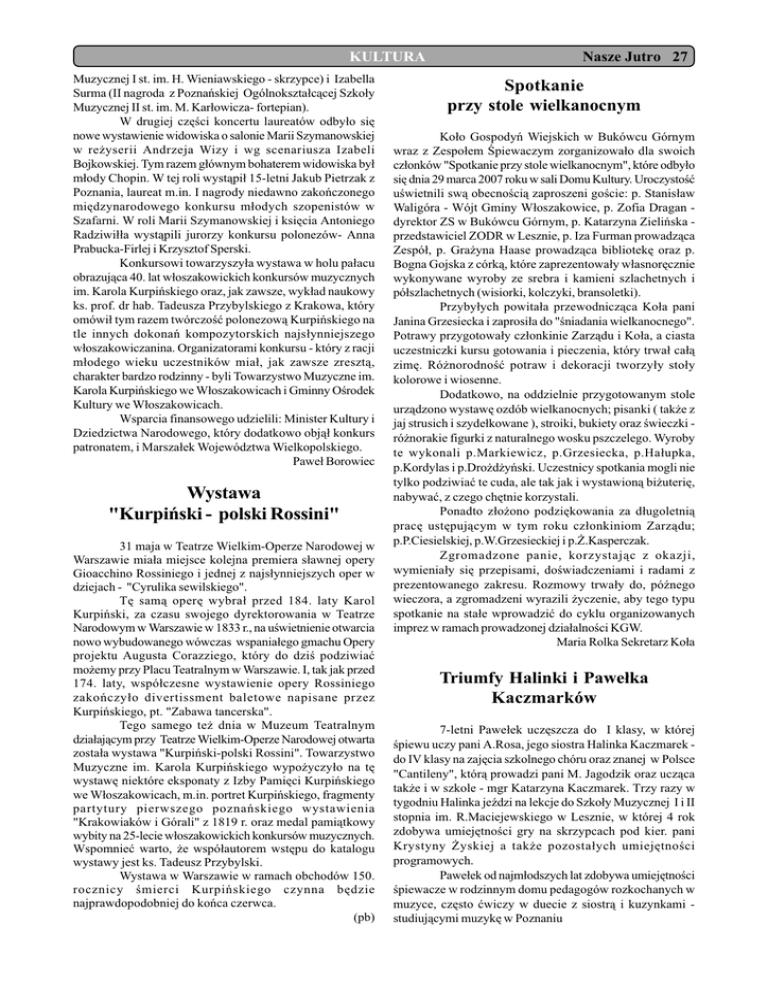 KULTURA Muzycznej I st. im. H. Wieniawskiego - skrzypce) i Izabella Surma (II nagroda z Poznañskiej Ogólnokszta³c¹cej Szko³y Muzycznej II st. im. M. Kar³owicza- fortepian). W drugiej czêci koncertu laureatów odby³o siê nowe wystawienie widowiska o salonie Marii Szymanowskiej w re¿yserii Andrzeja Wizy i wg scenariusza Izabeli Bojkowskiej. Tym razem g³ównym bohaterem widowiska by³ m³ody Chopin. W tej roli wyst¹pi³ 15-letni Jakub Pietrzak z Poznania, laureat m.in. I nagrody niedawno zakoñczonego miêdzynarodowego konkursu m³odych szopenistów w Szafarni. W roli Marii Szymanowskiej i ksiêcia Antoniego Radziwi³³a wyst¹pili jurorzy konkursu polonezów- Anna Prabucka-Firlej i Krzysztof Sperski. Konkursowi towarzyszy³a wystawa w holu pa³acu obrazuj¹ca 40. lat w³oszakowickich konkursów muzycznych im. Karola Kurpiñskiego oraz, jak zawsze, wyk³ad naukowy ks. prof. dr hab. Tadeusza Przybylskiego z Krakowa, który omówi³ tym razem twórczoæ polonezow¹ Kurpiñskiego na tle innych dokonañ kompozytorskich najs³ynniejszego w³oszakowiczanina. Organizatorami konkursu - który z racji m³odego wieku uczestników mia³, jak zawsze zreszt¹, charakter bardzo rodzinny - byli Towarzystwo Muzyczne im. Karola Kurpiñskiego we W³oszakowicach i Gminny Orodek Kultury we W³oszakowicach. Wsparcia finansowego udzielili: Minister Kultury i Dziedzictwa Narodowego, który dodatkowo obj¹³ konkurs patronatem, i Marsza³ek Województwa Wielkopolskiego. Pawe³ Borowiec Wystawa "Kurpiñski - polski Rossini" 31 maja w Teatrze Wielkim-Operze Narodowej w Warszawie mia³a miejsce kolejna premiera s³awnej opery Gioacchino Rossiniego i jednej z najs³ynniejszych oper w dziejach - "Cyrulika sewilskiego". Tê sam¹ operê wybra³ przed 184. laty Karol Kurpiñski, za czasu swojego dyrektorowania w Teatrze Narodowym w Warszawie w 1833 r., na uwietnienie otwarcia nowo wybudowanego wówczas wspania³ego gmachu Opery projektu Augusta Corazziego, który do dzi podziwiaæ mo¿emy przy Placu Teatralnym w Warszawie. I, tak jak przed 174. laty, wspó³czesne wystawienie opery Rossiniego zakoñczy³o divertissment baletowe napisane przez Kurpiñskiego, pt. "Zabawa tancerska". Tego samego te¿ dnia w Muzeum Teatralnym dzia³aj¹cym przy Teatrze Wielkim-Operze Narodowej otwarta zosta³a wystawa "Kurpiñski-polski Rossini". Towarzystwo Muzyczne im. Karola Kurpiñskiego wypo¿yczy³o na tê wystawê niektóre eksponaty z Izby Pamiêci Kurpiñskiego we W³oszakowicach, m.in. portret Kurpiñskiego, fragmenty partytury pierwszego poznañskiego wystawienia "Krakowiaków i Górali" z 1819 r. oraz medal pami¹tkowy wybity na 25-lecie w³oszakowickich konkursów muzycznych. Wspomnieæ warto, ¿e wspó³autorem wstêpu do katalogu wystawy jest ks. Tadeusz Przybylski. Wystawa w Warszawie w ramach obchodów 150. rocznicy mierci Kurpiñskiego czynna bêdzie najprawdopodobniej do koñca czerwca. (pb) Nasze Jutro 27 Spotkanie przy stole wielkanocnym Ko³o Gospodyñ Wiejskich w Bukówcu Górnym wraz z Zespo³em piewaczym zorganizowa³o dla swoich cz³onków "Spotkanie przy stole wielkanocnym", które odby³o siê dnia 29 marca 2007 roku w sali Domu Kultury. Uroczystoæ uwietnili sw¹ obecnoci¹ zaproszeni gocie: p. Stanis³aw Waligóra - Wójt Gminy W³oszakowice, p. Zofia Dragan dyrektor ZS w Bukówcu Górnym, p. Katarzyna Zieliñska przedstawiciel ZODR w Lesznie, p. Iza Furman prowadz¹ca Zespó³, p. Gra¿yna Haase prowadz¹ca bibliotekê oraz p. Bogna Gojska z córk¹, które zaprezentowa³y w³asnorêcznie wykonywane wyroby ze srebra i kamieni szlachetnych i pó³szlachetnych (wisiorki, kolczyki, bransoletki). Przyby³ych powita³a przewodnicz¹ca Ko³a pani Janina Grzesiecka i zaprosi³a do "niadania wielkanocnego". Potrawy przygotowa³y cz³onkinie Zarz¹du i Ko³a, a ciasta uczestniczki kursu gotowania i pieczenia, który trwa³ ca³¹ zimê. Ró¿norodnoæ potraw i dekoracji tworzy³y sto³y kolorowe i wiosenne. Dodatkowo, na oddzielnie przygotowanym stole urz¹dzono wystawê ozdób wielkanocnych; pisanki ( tak¿e z jaj strusich i szyde³kowane ), stroiki, bukiety oraz wieczki ró¿norakie figurki z naturalnego wosku pszczelego. Wyroby te wykonali p.Markiewicz, p.Grzesiecka, p.Ha³upka, p.Kordylas i p.Dro¿d¿yñski. Uczestnicy spotkania mogli nie tylko podziwiaæ te cuda, ale tak jak i wystawion¹ bi¿uteriê, nabywaæ, z czego chêtnie korzystali. Ponadto z³o¿ono podziêkowania za d³ugoletni¹ pracê ustêpuj¹cym w tym roku cz³onkiniom Zarz¹du; p.P.Ciesielskiej, p.W.Grzesieckiej i p.¯.Kasperczak. Zgromadzone panie, korzystaj¹c z okazji, wymienia³y siê przepisami, dowiadczeniami i radami z prezentowanego zakresu. Rozmowy trwa³y do, pónego wieczora, a zgromadzeni wyrazili ¿yczenie, aby tego typu spotkanie na sta³e wprowadziæ do cyklu organizowanych imprez w ramach prowadzonej dzia³alnoci KGW. Maria Rolka Sekretarz Ko³a Triumfy Halinki i Pawe³ka Kaczmarków 7-letni Pawe³ek uczêszcza do I klasy, w której piewu uczy pani A.Rosa, jego siostra Halinka Kaczmarek do IV klasy na zajêcia szkolnego chóru oraz znanej w Polsce "Cantileny", któr¹ prowadzi pani M. Jagodzik oraz ucz¹ca tak¿e i w szkole - mgr Katarzyna Kaczmarek. Trzy razy w tygodniu Halinka jedzi na lekcje do Szko³y Muzycznej I i II stopnia im. R.Maciejewskiego w Lesznie, w której 4 rok zdobywa umiejêtnoci gry na skrzypcach pod kier. pani Krystyny ¯yskiej a tak¿e pozosta³ych umiejêtnoci programowych. Pawe³ek od najm³odszych lat zdobywa umiejêtnoci piewacze w rodzinnym domu pedagogów rozkochanych w muzyce, czêsto æwiczy w duecie z siostr¹ i kuzynkami studiuj¹cymi muzykê w Poznaniu