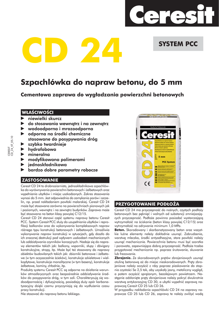 CD 24 SYSTEM PCC Szpachlówka do napraw betonu, do 5 mm CERESIT CD_24_KT_05.10 Cementowa zaprawa do wygładzania powierzchni betonowych WŁAŚCIWOŚCI niewielki skurcz do stosowania wewnątrz i na zewnątrz wodoodporna i mrozoodporna odporna na środki chemiczne stosowane do posypywania dróg szybko twardnieje hydrofobowa mineralna modyfikowana polimerami jednoskładnikowa bardzo dobre parametry robocze ZASTOSOWANIE Ceresit CD 24 to drobnoziarnista, jednoskładnikowa szpachlówka do wyrównywania powierzchni betonowych i żelbetowych oraz wypełniania ubytków i miejsc uszkodzonych. Zakres stosowania wynosi do 5 mm. Jest odpowiednia do zamykania porów i szczelin, np. przed nakładaniem powłoki malarskiej. Ceresit CD 24 może być stosowana zarówno na powierzchniach pionowych jak i poziomych, wewnątrz i na zewnątrz budynków. Zaprawa może być stosowana na beton klasy powyżej C12/15. Ceresit CD 24 stanowi część systemu naprawy betonu Ceresit PCC. System Ceresit PCC służy do uzupełniania ubytków i reprofilacji balkonów oraz do wykonywania kompleksowych napraw różnego typu konstrukcji betonowych i żelbetowych. Umożliwia wykonywanie napraw konstrukcji w sytuacjach, gdy doszło do ich znacznej destrukcji pod wpływem uszkodzeń mechanicznych lub oddziaływania czynników korozyjnych. Nadaje się do naprawy elementów takich jak: balkony, wsporniki, słupy i dźwigary konstrukcyjne, stropy, itp. Może być też stosowany do naprawy obiektów budowlanych takich jak: zbiorniki betonowe i żelbetowe (w tym oczyszczalnie ścieków), konstrukcje szkieletowe i wielkopłytowe, konstrukcje monolityczne (w tym baseny), konstrukcje żelbetowe, kominy, chłodnie, itp. Produkty systemu Ceresit PCC są odporne na działanie warunków atmosferycznych oraz bezpośrednie oddziaływanie środków do posypywania dróg, w tym soli. Charakteryzują się wodoodpornością i dyfuzyjnością, posiadają duży opór karbonatyzacyjny dzięki czemu przyczyniają się do wydłużenia czasu pracy konstrukcji. Nie stosować do naprawy betonu lekkiego. PRZYGOTOWANIE PODŁOŻA Ceresit CD 24 ma przyczepność do nośnych, czystych podłoży betonowych bez pęknięć i wolnych od substancji zmniejszających przyczepność. Podłoże powinno posiadać wystarczającą wytrzymałość na ściskanie (beton klasy powyżej C12/15) oraz wytrzymałość na odrywanie minimum 1,0 MPa. Beton. Skorodowany i skarbonatyzowany beton oraz wszystkie luźne elementy należy dokładnie usunąć. Zabrudzenia, warstwę mleczka, środki antyadhezyjne, stare powłoki należy usunąć mechanicznie. Powierzchnia betonu musi być szorstka i porowata, zapewniająca dobrą przyczepność. Podłoże trzeba przygotować mechanicznie np. poprzez śrutowanie, skuwanie lub frezowanie. Zbrojenie. Ze skorodowanych prętów zbrojeniowych usunąć otulinę betonową aż do miejsc nieskorodowanych. Pręty zbrojeniowe należy oczyścić z rdzy poprzez piaskowanie do stopnia czystości Sa 2,5 tak, aby uzyskały jasny, metaliczny wygląd, a potem oczyścić sprężonym, bezolejowym powietrzem. Następnie odsłonięte pręty zbrojeniowe należy pokryć dwukrotnie warstwą antykorozyjną CD 30, a ubytki wypełnić zaprawą naprawczą Ceresit CD 25 lub CD 26. W przypadku nakładania szpachlówki CD 24 na zaprawy naprawcze CD 25 lub CD 26, zaprawy te należy zwilżyć wodą WYKONANIE Przygotowanie zaprawy: Zawartość opakowania wsypywać do odmierzonej ilości czystej wody i mieszać za pomocą wolnoobrotowej wiertarki z mieszadłem, aż do uzyskania jednolitej masy bez grudek. Odczekać 3 minuty i ponownie przemieszać zaprawę. Aplikacja zaprawy: Przed upływem czasu zużycia, gotową zaprawę należy nałożyć pacą na wilgotne podłoże lub w przypadku szpachlowania betonu, na świeżą warstwę kontaktową z zaprawy Ceresit CD 30, wygładzić lub ewentualnie nadać fakturę. Powierzchnię szpachlówki CD 24 zaraz po nałożeniu można wygładzić stalową pacą lub w ciągu 10-45 min zatrzeć pacą plastikową lub gąbką. W przypadku nakładania zaprawy w kilku warstwach odstęp czasu pomiędzy kolejnymi warstwami nie może przekroczyć 3 godzin. W przeciwnym wypadku należy odczekać 24 godz., podłoże zwilżyć wodą, nanieść warstwę kontaktową i dopiero nakładać szpachlówkę. Dodatkowe zabezpieczenie betonu: Dodatkowym zabezpieczeniem chroniącym beton przed korozją, szkodliwym działaniem wody, mrozu, środków odladzających i zanieczyszczeń atmosferycznych jest pokrycie szpachlówki CD 24 farbą akrylową CT 44 lub elastyczną powłoką izolacyjną CR 166. Powłoki te można aplikować po 3 dniach od nałożenia zaprawy CD 24. UWAGA Prace wykonywać w suchych warunkach, przy temperaturze powietrza i podłoża od +5°C do +30°C oraz przy wilgotności względnej powietrza poniżej 80%. Zaprawę chronić przed zbyt szybkim przesychaniem spowodowanym silnym nasłonecznieniem, przeciągami, itp. Do czasu całkowitego wyschnięcia, chronić zaprawę przed opadami deszczu. Zaleca się wtedy stosowanie osłon na rusztowaniach. Wszelkie dane odnoszą się do temperatury +20°C i wilgotności względnej powietrza 60%. W innych warunkach należy uwzględnić krótszy lub dłuższy czas twardnienia materiału. Świeże zabrudzenia zaprawą myć wodą, a stwardniałe usuwać mechanicznie. Zaprawy nie mieszać z innymi dodatkami i nie pokrywać materiałami zawierającymi gips. CD 24 zawiera cement i zmieszana z wodą ma odczyn alkaliczny. Chronić naskórek i oczy. Zabrudzenia dokładnie zmywać wodą. W przypadku kontaktu z oczami płukać je obficie wodą i zasięgnąć porady lekarza. Zawartość chromu VI – poniżej 2 ppm w okresie ważności wyrobu. ZALECENIA Niniejsza karta techniczna określa zakres stosowania materiału i zalecany sposób prowadzenia robót, ale nie może zastąpić zawodowego przygotowania wykonawcy. Oprócz podanych zaleceń prace należy wykonywać zgodnie ze sztuką budowlaną i zasadami BHP. Producent gwaran