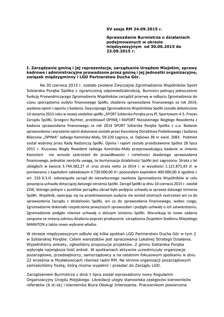 XV sesja RM 24.09.2015 r. Sprawozdanie Burmistrza o działaniach podejmowanych w okresie międzysesyjnym od 30.06.2015 do 23.09.2015 r. I. Zarządzanie gminą i jej reprezentacja, zarządzanie Urzędem Miejskim, sprawy kadrowe i administracyjne prowadzone przez gminę i jej jednostki organizacyjne, związek międzygminny i LGD Partnerstwo Ducha Gór. Na 30 czerwca 2015 r. zostało zwołane Zwyczajne Zgromadzenie Wspólników Sport Szklarska Poręba Spółka z ograniczoną odpowiedzialnością. Burmistrz pełniący jednocześnie funkcję Przewodniczącego Zgromadzenia Wspólników zarządził przerwę w odbyciu Zgromadzenia do czasu sporządzenia audytu finansowego Spółki, zbadania sprawozdania finansowego za rok 2014, wydania opinii i raportu z badania. Zwyczajnego Zgromadzenia Wspólników Spółki zostało dokończone 14 sierpnia 2015 roku w nowej siedzibie spółki „SPORT Szklarska Poręba przy Pl. Sportowym 4-5. Prezes Zarządu Spółki, Grzegorz Rychter, przedstawił OPINIĘ I RAPORT Niezależnego Biegłego Rewidenta z badania sprawozdania finansowego za rok 2014 SPORT Szklarska Poręba Spółka z o.o. Badanie sprawozdania i wyrażenie opinii dokonane zostało przez Kancelarię Doradztwa Podatkowego i badania Bilansów „OPINIA” Jadwiga Kamińska-Mały, 59-220 Legnica, ul. Dębowa 38 nr ewid. 2083. Podmiot został wybrany przez Radę Nadzorczą Spółki. Opinia i raport zostały przedstawione Spółce 28 lipca 2015 r. Kluczowy Biegły Rewident Jadwiga Kamińska-Mały przeprowadzający badanie w imieniu Kancelarii nie wniosła zastrzeżeń do prawidłowości i rzetelności zbadanego sprawozdania finansowego, jednakże zwróciła uwagę, że kontynuacja działalności Spółki jest zagrożona. Strata z lat ubiegłych w kwocie 3.744.382,27 zł. oraz strata netto za 2014 r. w wysokości 1.121.871,43 zł. w porównaniu z kapitałem zakładowym 4.730.000,00 zł i pozostałym kapitałem 400.000,00 zł zgodnie z art. 233 K.S.H. zobowiązała zarząd do niezwłocznego zwołania Zgromadzenia Wspólników w celu powzięcia uchwały dotyczącej dalszego istnienia Spółki. Zarząd Spółki w dniu 10 czerwca 2015 r. zwołał ZZW, którego jednym z punktów porządku obrad było podjęcie uchwały w sprawie dalszego istnienia Spółki. Wspólnik, opierając się na przedstawionym audycie nie wniósł istotnych zastrzeżeń ani co do sprawozdania Zarządu z działalności Spółki, ani co do sprawozdania finansowego, wobec czego, Zgromadzenie dokonało rozpatrzenia powyższych sprawozdań i podjęło uchwały o ich zatwierdzeniu. Zgromadzenie podjęło również uchwałę o dalszym istnieniu Spółki. Warunkują to nowe zadania związane ze zmianą zakresu działania poprzez przekazanie zarządzania Zespołem Stadionu Miejskiego MARATON a także nowo wybrane władze. W okresie międzysesyjnym odbyło się kilka spotkań LGD Partnerstwo Ducha Gór w tym 2 w Szklarskiej Porębie. Celem warsztatów jest opracowania Lokalnej Strategii Działania. Wypełniliśmy ankiety, zgłosiliśmy propozycje projektów. Z gminy Szklarska Poręba wpłynęła największa ilość ankiet. W spotkaniach aktywnie uczestniczyły organizacje pozarządowe, przedsiębiorcy, samorządowcy a na ostatnim fokusowym spotkaniu w dniu 22 września w Mysłakowicach również radni RM. Na stronie organizacji pozarządowych zamieściliśmy fiszkę, którą można wypełnić i przesłać do Zarządu LGD. Zarządzeniem Burmistrza z dnia 1 lipca został wprowadzony nowy Regulamin Organizacyjny Urzędu Miejskiego. Likwidacji uległy stanowiska zastępców kierowników referatów (6 st-sk) i kierownika Biura Obsługi Interesanta. Pracownikom powierzone zostały stanowiska nie kierownicze w tych samych referatach. Zaktualizowane zostały zakresy działania poszczególnych komórek organizacyjnych oraz wprowadzona zasada opracowania zakresów czynności pracowników. Z dniem 1 sierpnia Burmistrz odwołał Panią Ewę Dziergwę ze stanowiska Z-cy Burmistrza i powołał na to stanowisko Pana Stanisława Kozinę, zatrudnionego wcześniej na st-ku doradcy. Pani Dziergwa od 1 sierpnia zatrudniona jest na st-ku doradcy. Dokonujemy przebudowy witryny internetowej miasta spełniającej wymogi Normy WCAG 2.0, która zapewni możliwość korzystania ze strony osobom niepełnosprawnym. Obowiązek zapewnienia dostępności stron prowadzonych przez jednostki publiczne osobom niepełnosprawnym wynika z rozporządzenia Rady Ministrów z dnia 12 kwietnia 2012 r. w sprawie Krajowych Ram Interoperacyjności. Nowa strona zapewni równocześnie poprawę funkcjonalności wynikającej z aktualnych potrzeb. Urządziliśmy archiwum zakładowe Urzędu Miejskiego w byłej stołówce (anastępnie sali gimnastycznej) mieszczącej się w starszej części Szkoły Podstawowej nr 1 kosztem 6,0 tys zł. Archiwum mieszczące się tymczasowo w dzierżawionych od Kamiennogórskiego TBS pomieszczeniach budynku pokoszarowym przy ul. 1 Maja przenosimy do siedziby docelowej. Termin do połowy października. III. Kultura, ochrona zabytków, Kultura fizyczna, turystyka i wypoczynek, system oświaty. Sezon letni obfitował w liczne imprezy kulturalne, sportowe i rekreacyjne, wymienię niektóre: Przez całe wakacje funkcjonował „Art. Skwer - Letni Festiwal Sztuki” organizowany głównie na skwerze Radiowej Trójki przez MOKSiAL. Różnorodne warsztaty artystyczne, konkursy, koncerty, zajęcia edukacyjne dla dzieci i młodzieży z naszego miasta i rodzin z dziećmi turystów. W dniach od 9 do 12 lipca przeprowadziliśmy największą rowerową imprezę letnią w Szklarskiej Porębie Bice Weck Festiwal. 18-19 lipca Wielka Pętla Izerska i Puchar Szklarskiej Poręby w Półmaratonach Górskich – organizator Towarzystwo Sportowe Regle, współorganizator i dofinansowanie Miasto Od 30 lipca do 2 sierpnia Pod Ponurą Małpą rozbrzmiewała XXXXVII Giełda Turystycznej Piosenki Studenckiej. Organizator Uniwersytet Przyrodniczy, współorganizator Miasto przy zaangażowaniu wol