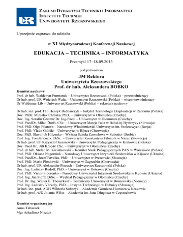 ZAKŁAD DYDAKTYKI TECHNIKI I INFORMATYKI INSTYTUTU TECHNIKI UNIWERSYTETU RZESZOWSKIEGO Uprzejmie zaprasza do udziału w XI Międzynarodowej Konferencji Naukowej EDUKACJA – TECHNIKA – INFORMATYKA Przemyśl 17–18.09.2013 pod patronatem JM Rektora Uniwersytetu Rzeszowskiego Prof. dr hab. Aleksandera BOBKO Komitet naukowy Prof. dr hab. Waldemar Furmanek – Uniwersytet Rzeszowski (Polska) – przewodniczący Dr hab. prof. UR Wojciech Walat – Uniwersytet Rzeszowski (Polska) – wiceprzewodniczący Dr Waldemar Lib – Uniwersytet Rzeszowski (Polska) – sekretarz naukowy Dr hab. inż. prof. ITE Henryk Bednarczyk – Instytut Technologii Eksploatacji w Radomiu (Polska) Doc. PhDr. Miroslav Chráska, PhD. – Uniwersytet w Ołomuńcu (Czechy) Doc. Ing. Serafín Čestmír Dr. Ing-Paed. – Uniwersytet w Ołomuńcu (Czechy) Prof. PaedDr. Milan Ďuriš, CSc. – Uniwersytet Mateja Bela w Bańskiej Bystrzycy (Słowacja) Prof. PhD. Olga Filatova – Narodowy Włodzimierski Uniwersytet im. Stoletowych (Rosja) Prof. PhD. Vlado Galičić – Uniwersytet w Rijece (Chorwacja) Doc. PhD. Slavoljub Hilcenko – Wyższa Szkoła Zawodowa w Suboticy (Serbia) Prof. Ing. Tomáš Kozík, DrSc. – Uniwersytet Konstantyna Filozofa w Nitrze (Słowacja) Dr hab. prof. UP Krzysztof Kraszewski – Uniwersytet Pedagogiczny w Krakowie (Polska) Doc. Paed Dr., Jiři Kropáč CSc. – Uniwersytet w Ołomuńcu (Czechy) Prof. dr hab. Stefan M. Kwiatkowski – Komitet Nauk Pedagogicznych PAN w Warszawie (Polska) Prof. PhD. Oksana Nagorniuk – Narodowy Uniwersytet Inżynierii Środowiska w Kijowie (Ukraina) Prof. PaedDr., Jozef Pavelka, PhD. – Uniwersytet w Preszowie (Słowacja) Prof. PhD. Mario Plenkowić – Uniwersytet w Zagrzebiu (Chorwacja) Dr hab. prof. UR Aleksander Piecuch – Uniwersytet Rzeszowski (Polska) Doc. Ing. Ladislav Rudolf, PhD. – Uniwersytet w Ostrawie (Czechy) Prof. PhD. Victor Sidorenko – Narodowy Uniwersytet Inżynierii Środowiska w Kijowie (Ukraina) Prof. Ing. Ján Stoffa DrSc. – Wydział Pedagogiczny w Ołomuńcu (Czechy) Prof. Dr. Ing. Walter E. Theuerkauf – Techniczny Uniwersytet w Brunszwiku (Niemcy) Prof. Ing. Ladislav Várkoly, PhD. – Instytut Technologii w Dubnicy (Słowacja) Dr hab. inż. prof. AGH Wiktoria Sobczyk – Akademia Górniczo-Hutnicza w Krakowie Dr hab. prof. AJD Jolanta Wilsz – Akademia im. Jana Długosza w Częstochowie Komitet organizacyjny Anna Tabaczek Mgr Arkadiusz Nisztuk Celem konferencji jest kontynuacja dyskusji nad podstawowymi problemami edukacji technicznej, informatycznej i zawodowej w polskim i zagranicznych systemach oświaty ze szczególnym uwzględnieniem konsekwencji pedagogicznych wynikających z kierunków rozwoju społeczeństwa informacyjnego. Tematyka konferencji koncentrować się będzie wokół podanych poniżej zagadnień, które prosimy uwzględnić w swoich opracowaniach. Przemiany cywilizacyjne i kulturowe edukacji: 1) technicznej i zawodowej, 2) informatycznej i informacyjnej, 3) ekologiczna i środowiskowej, 4) dydaktyki szkoły wyższej. W ramach powyższych tematów szczególnie interesują nas następujące wątki: 1) źródła przemian poszczególnych dziedzin edukacji. 2) propozycja rozwiązań teoretycznych i metodycznych dla przyszłości interesujących nas dziedzin edukacji. 3) teoria i praktyka edukacji technicznej, informatycznej i zawodowej w różnych krajach świata. Informacje dla uczestników − Szczegółowe informacje dotyczące edytorskiego przygotowania dokumentów podane zostały oddzielnie. − Organizatorzy Konferencji zapraszają do zgłaszania uczestnictwa i przesłania karty zgłoszenia i propozycji wystąpień – referatów lub komunikatów do dnia 30.04.2013 roku na adres Sekretariatu Konferencji: Uniwersytet Rzeszowski Instytut Techniki Zakład Dydaktyki Techniki i Informatyki ul. Rejtana 16A 35-310 Rzeszów − Program Konferencji wraz z dokładnymi informacjami organizacyjnymi zostanie przesłany uczestnikom do 15.07.2013 r. Warunkiem uczestnictwa w Konferencji jest: – zgłoszenia udziału na załączonej Karcie Uczestnictwa (30.04.2013 r.); – przesłanie tekstu wystąpienia wraz z płytą CD lub pocztą elektroniczną (30.04.2013 r.); – wniesienie opłaty konferencyjnej na konto podane w karcie zgłoszenia (15.05.2013 r.). W ramach wniesionej opłaty zapewniamy: – materiały konferencyjne; – 2 noclegi; – pełne wyżywienie; – udział w spotkaniu towarzyskim; – publikację materiałów konferencyjnych. Kontakt: − tel.: (017) 872-11-90, 872-11-77 − poczta elektroniczna: [email protected]