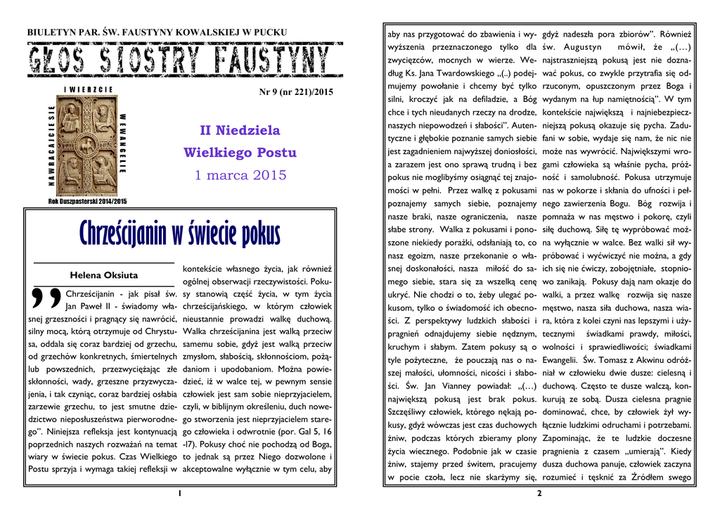 BIULETYN PAR. ŚW. FAUSTYNY KOWALSKIEJ W PUCKU Głos Siostry FaustynY Nr 9 (nr 221)/2015 II Niedziela Wielkiego Postu 1 marca 2015 „ Chrześcijanin w świecie pokus kontekście własnego życia, jak również ogólnej obserwacji rzeczywistości. Pokusy stanowią część życia, w tym życia chrześcijańskiego, w którym człowiek nieustannie prowadzi walkę duchową. Walka chrześcijanina jest walką przeciw samemu sobie, gdyż jest walką przeciw zmysłom, słabością, skłonnościom, pożądaniom i upodobaniom. Można powiedzieć, iż w walce tej, w pewnym sensie człowiek jest sam sobie nieprzyjacielem, czyli, w biblijnym określeniu, duch nowego stworzenia jest nieprzyjacielem starego człowieka i odwrotnie (por. Gal 5, 16 -l7). Pokusy choć nie pochodzą od Boga, to jednak są przez Niego dozwolone i akceptowalne wyłącznie w tym celu, aby Helena Oksiuta Chrześcijanin - jak pisał św. Jan Paweł II - świadomy własnej grzeszności i pragnący się nawrócić, silny mocą, którą otrzymuje od Chrystusa, oddala się coraz bardziej od grzechu, od grzechów konkretnych, śmiertelnych lub powszednich, przezwyciężając złe skłonności, wady, grzeszne przyzwyczajenia, i tak czyniąc, coraz bardziej osłabia zarzewie grzechu, to jest smutne dziedzictwo nieposłuszeństwa pierworodnego”. Niniejsza refleksja jest kontynuacją poprzednich naszych rozważań na temat wiary w świecie pokus. Czas Wielkiego Postu sprzyja i wymaga takiej refleksji w 1 aby nas przygotować do zbawienia i wywyższenia przeznaczonego tylko dla zwycięzców, mocnych w wierze. Według Ks. Jana Twardowskiego „(..) podejmujemy powołanie i chcemy być tylko silni, kroczyć jak na defiladzie, a Bóg chce i tych nieudanych rzeczy na drodze, naszych niepowodzeń i słabości”. Autentyczne i głębokie poznanie samych siebie jest zagadnieniem najwyższej doniosłości, a zarazem jest ono sprawą trudną i bez pokus nie moglibyśmy osiągnąć tej znajomości w pełni. Przez walkę z pokusami poznajemy samych siebie, poznajemy nasze braki, nasze ograniczenia, nasze słabe strony. Walka z pokusami i ponoszone niekiedy porażki, odsłaniają to, co nasz egoizm, nasze przekonanie o własnej doskonałości, nasza miłość do samego siebie, stara się za wszelką cenę ukryć. Nie chodzi o to, żeby ulegać pokusom, tylko o świadomość ich obecności. Z perspektywy ludzkich słabości i pragnień odnajdujemy siebie nędznym, kruchym i słabym. Zatem pokusy są o tyle pożyteczne, że pouczają nas o naszej małości, ułomności, nicości i słabości. Św. Jan Vianney powiadał: „(…) największą pokusą jest brak pokus. Szczęśliwy człowiek, którego nękają pokusy, gdyż wówczas jest czas duchowych żniw, podczas których zbieramy plony życia wiecznego. Podobnie jak w czasie żniw, stajemy przed świtem, pracujemy w pocie czoła, lecz nie skarżymy się, gdyż nadeszła pora zbiorów”. Również św. Augustyn mówił, że „(…) najstraszniejszą pokusą jest nie doznawać pokus, co zwykle przytrafia się odrzuconym, opuszczonym przez Boga i wydanym na łup namiętnością”. W tym kontekście największą i najniebezpieczniejszą pokusą okazuje się pycha. Zadufani w sobie, wydaje się nam, że nic nie może nas wywrócić. Największymi wrogami człowieka są właśnie pycha, próżność i samolubność. Pokusa utrzymuje nas w pokorze i skłania do ufności i pełnego zawierzenia Bogu. Bóg rozwija i pomnaża w nas męstwo i pokorę, czyli siłę duchową. Siłę tę wypróbować można wyłącznie w walce. Bez walki sił wypróbować i wyćwiczyć nie można, a gdy ich się nie ćwiczy, zobojętniałe, stopniowo zanikają. Pokusy dają nam okazje do walki, a przez walkę rozwija się nasze męstwo, nasza siła duchowa, nasza wiara, która z kolei czyni nas lepszymi i użytecznymi świadkami prawdy, miłości, wolności i sprawiedliwości; świadkami Ewangelii. Św. Tomasz z Akwinu odróżniał w człowieku dwie dusze: cielesną i duchową. Często te dusze walczą, konkurują ze sobą. Dusza cielesna pragnie dominować, chce, by człowiek żył wyłącznie ludzkimi odruchami i potrzebami. Zapominając, że te ludzkie doczesne pragnienia z czasem „umierają”. Kiedy dusza duchowa panuje, człowiek zaczyna rozumieć i tęsknić za Źródłem swego 2 istnienia, za Bogiem, który jest życiem i miłością prawdziwą, nieskończoną. Kard. Stefan Wyszyński pisał „(…) gdy uświadamiamy sobie nasze najrozmaitsze niewierności, słabości, grzechy lekkie, ciężkie i całą ich specyfikę; gdy poustawiamy je w Obliczu Boga prosząc: przyjrzyj się, jaki ja jestem – wtedy nam się wydaje, że na pewno Boga do siebie zrazimy, przestanie nas kochać. Naturą Boga jest jednak dobroć, a wszechmocą – miłosierdzie. Bóg patrzy na nas i widzi swoje, to znaczy miłość”. Nigdy nie jest za późno, by wejść na właściwą drogę i zacząć odróżniać dobro od zła. Choć czasem upadamy, ważne podnieść się i iść dalej w kierunku wskazanym przez Boga. Nikt z nas nie jest bez słabości, bez grzechu. Ale zawsze można wyjść z trudnej sytuacji zwycięsko, nie bójmy się prosić o pomoc i siły Boga. Św. Jan Vianney ujął tę prawdę tak „(…)kiedy jesteście podani pokusie, ofiarujcie Bogu zasługę z niej płynącą, aby otrzymać przeciwną jej łaskę. Jeśli kuszeni jesteście pychą, ofiarujcie tę pokusą, aby otrzymać łaskę pokory; ofiarujcie pokusę złych myśli, aby otrzymać łaskę czystości; jeśli nadchodzi pokusa przeciw bliźniemu, proście o łaskę miłości. Ofiarujcie pokusy w intencji nawrócenia, gdyż to zniechęca szatana i odpędza go, ponieważ pokusa obraca się wówczas przeciw niemu samemu. Odwagi! Chrześcijanin zawsze powinien być gotowy do walki”. Bóg nas kocha prawdziwą, pełną łaski miłością. W tym leży istota danej nam wolnej woli. Prawdziwie szczęśliwy kto w chwili śmierci będzie mógł powiedzieć, tak potykałem si