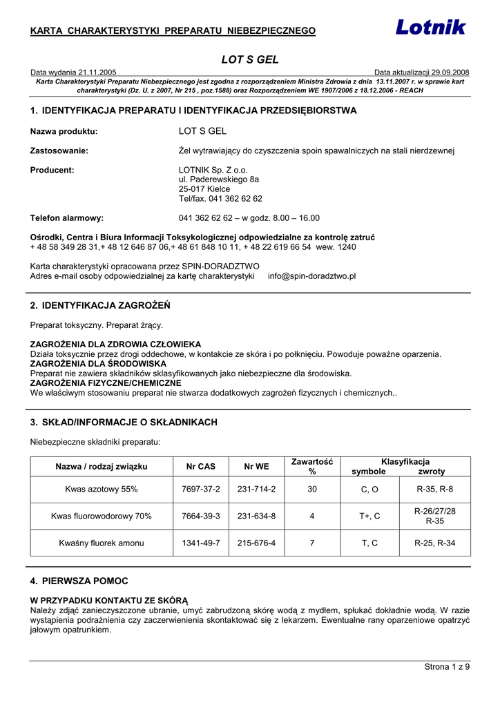 Lotnik KARTA CHARAKTERYSTYKI PREPARATU NIEBEZPIECZNEGO LOT S GEL Data wydania 21.11.2005 Data aktualizacji 29.09.2008 Karta Charakterystyki Preparatu Niebezpiecznego jest zgodna z rozporządzeniem Ministra Zdrowia z dnia 13.11.2007 r. w sprawie kart charakterystyki (Dz. U. z 2007, Nr 215 , poz.1588) oraz Rozporządzeniem WE 1907/2006 z 18.12.2006 - REACH 1. IDENTYFIKACJA PREPARATU I IDENTYFIKACJA PRZEDSIĘBIORSTWA Nazwa produktu: LOT S GEL Zastosowanie: śel wytrawiający do czyszczenia spoin spawalniczych na stali nierdzewnej Producent: LOTNIK Sp. Z o.o. ul. Paderewskiego 8a 25-017 Kielce Tel/fax. 041 362 62 62 Telefon alarmowy: 041 362 62 62 – w godz. 8.00 – 16.00 Ośrodki, Centra i Biura Informacji Toksykologicznej odpowiedzialne za kontrolę zatruć + 48 58 349 28 31,+ 48 12 646 87 06,+ 48 61 848 10 11, + 48 22 619 66 54 wew. 1240 Karta charakterystyki opracowana przez SPIN-DORADZTWO Adres e-mail osoby odpowiedzialnej za kartę charakterystyki [email protected] 2. IDENTYFIKACJA ZAGROśEŃ Preparat toksyczny. Preparat Ŝrący. ZAGROśENIA DLA ZDROWIA CZŁOWIEKA Działa toksycznie przez drogi oddechowe, w kontakcie ze skóra i po połknięciu. Powoduje powaŜne oparzenia. ZAGROśENIA DLA ŚRODOWISKA Preparat nie zawiera składników sklasyfikowanych jako niebezpieczne dla środowiska. ZAGROśENIA FIZYCZNE/CHEMICZNE We właściwym stosowaniu preparat nie stwarza dodatkowych zagroŜeń fizycznych i chemicznych.. 3. SKŁAD/INFORMACJE O SKŁADNIKACH Niebezpieczne składniki preparatu: Nazwa / rodzaj związku Nr CAS Nr WE Zawartość % Klasyfikacja symbole zwroty Kwas azotowy 55% 7697-37-2 231-714-2 30 C, O R-35, R-8 Kwas fluorowodorowy 70% 7664-39-3 231-634-8 4 T+, C R-26/27/28 R-35 Kwaśny fluorek amonu 1341-49-7 215-676-4 7 T, C R-25, R-34 4. PIERWSZA POMOC W PRZYPADKU KONTAKTU ZE SKÓRĄ NaleŜy zdjąć zanieczyszczone ubranie, umyć zabrudzoną skórę wodą z mydłem, spłukać dokładnie wodą. W razie wystąpienia podraŜnienia czy zaczerwienienia skontaktować się z lekarzem. Ewentualne rany oparzeniowe opatrzyć jałowym opatrunkiem. Strona 1 z 9 KARTA CHARAKTERYSTYKI PREPARATU NIEBEZPIECZNEGO Lotnik LOT S GEL Data wydania 21.11.2005 Data aktualizacji 29.09.2008 Karta Charakterystyki Preparatu Niebezpiecznego jest zgodna z rozporządzeniem Ministra Zdrowia z dnia 13.11.2007 r. w sprawie kart charakterystyki (Dz. U. z 2007, Nr 215 , poz.1588) oraz Rozporządzeniem WE 1907/2006 z 18.12.2006 - REACH W PRZYPADKU KONTAKTU Z OCZAMI Przepłukać oczy przez kilka minut (ok. 15) duŜą ilością wody, trzymając powieki szeroko rozwarte. Unikać silnego strumienia, ze względu na niebezpieczeństwo uszkodzenia rogówki, natychmiast skontaktować się z lekarzem. NARAśENIE INHALACYJNE Wyprowadzić poszkodowanego na świeŜe powietrze, w razie braku szybkiej poprawy zasięgnąć porady lekarza. W PRZYPADKU POŁKNIĘCIA Nie wywoływać wymiotów, podać do wypicia duŜą ilość wody, przepłukać jamę ustną, natychmiast skontaktować się z lekarzem. 5. POSTĘPOWANIE W PRZYPADKU POśARU PODSTAWOWE ZASADY POSTĘPOWANIA Podczas rozkładu termicznego preparatu powstają pary grąŜące wybuchem. Pojemniki znajdujące się w strefie poŜaru chłodzić rozproszonym strumieniem wody, o ile jest to moŜliwe usunąć ze strefy zagroŜenia. Nie naleŜy przebywać w strefie poŜaru bez odpowiedniego ubrania odpornego na działanie chemikaliów oraz aparatu do oddychania z niezaleŜnym obiegiem powietrza. Nie dopuszczać do przedostania się wody gaśniczej do wód powierzchniowych, gruntowych i kanalizacji. ZALECANE ŚRODKI GAŚNICZE Stosować metody gaśnicze odpowiednie do warunków otoczenia. Piana alkoholoodporna lub suche proszki gaśnicze (A,B,C), dwutlenek węgla (gaśnica śniegowa), piasek lub ziemia, mgła wodna. NIEODPOWIEDNIE ŚRODKI GAŚNICZE Unikać stosowania halonów, aby nie skaŜać środowiska. Środki ochrony indywidualnej dla straŜaków: w przypadku poŜaru w zamkniętym pomieszczeniu naleŜy stosować odzieŜ ochronną i aparat oddechowy na spręŜone powietrze. 6. POSTĘPOWANIE W PRZYPADKU NIEZAMIERZONEGO UWOLNIENIA DO ŚRODOWISKA Zawiadomić o awarii odpowiednie słuŜby. Usunąć z obszaru zagroŜenia osoby niebiorące udziału w likwidacji awarii. INDYWIDUALNE ŚRODKI OSTROśNOŚCI Zadbać o wystarczające wietrzenie, stosować rękawice ochronne z kauczuku butylowego, gumy nitrylowej lub neoprenu, stosować kauczukowe obuwie ochronne oraz ubranie ochronne, stosować okulary ochronne lub maskę zabezpieczającą twarz w przypadku moŜliwości rozchlapywania produktu. OCHRONA ŚRODOWISKA Zapobiegać rozprzestrzenianiu się oraz przedostaniu do kanalizacji i zbiorników wodnych poprzez tworzenie barier z materiałów wiąŜących ciecze (piasek, ziemia) – w przypadku awarii z wyciekiem preparatu, poinformować władze lokalne w przypadku niemoŜności zapewnienia ochrony. METODY USUWANIA ZANIECZYSZCZEŃ Usuwać poprzez zebranie mechaniczne lub na materiale absorpcyjnym (piasek, ziemia okrzemkowa, absorbent uniwersalny) i umieścić w odpowiednio oznakowanych pojemnikach. Nie przysypywać trocinami ani innymi materiałami łatwopalnymi. Utylizować zgodnie z obowiązującymi przepisami. Punkt 13 karty. 7. POSTĘPOWANIE Z PREPARATEM I JEGO MAGAZYNOWANIE POSTĘPOWANIE Z PREPARATEM Unikać kontaktu z oczami. Unikać kontaktu ze skórą. Unikać rozlewania preparatu. Unikać wdychania oparów roztworu. Unikać podwyŜszonej temperatury, gorących powierzchni i otwartego ognia. Stanowisko pracy wyposaŜyć w natrysk i wodne płuczki oczu. Do wszystkich specyficznych rekomendacji kontrolowania zagroŜeń przeprowadzić ocenę ryzyka zawodowego na stanowisku pracy w celu ustalenia środków zaradczych właściwych dla konkretnych warunków pracy. MAGAZYNOWANIE Przechowywać w chłodnym, suchym, dobrze wentylowanym przystosowanym pomieszczeniu w prawidłowo oznakowanym szczelnie zamkniętym oryginalnym pojemniku. Unikać bezpośredniego działania promieni słonecznych i źr