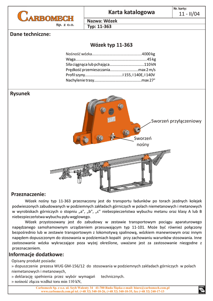 Karta katalogowa Nr. karty: 11 - II/04 Nazwa: Wózek Typ: 11-363 Dane techniczne: Wózek typ 11-363 Nośność wózka..............................................4000 kg Waga..................................................................45 kg Siła ciągnąca lub pchająca................................110 kN Prędkość przemieszczania..........................max 2 m/s Profil szyny...................................I 155, I 140E, I 140V Nachylenie trasy............................................max 27° Rysunek Sworzeń przyłączeniowy Sworzeń nośny Przeznaczenie: Wózek nośny typ 11-363 przeznaczony jest do transportu ładunków po torach jezdnych kolejek podwieszonych zabudowanych w podziemnych zakładach górniczych w polach niemetanowych i metanowych w wyrobiskach górniczych o stopniu „a", „b", „c" niebezpieczeństwa wybuchu metanu oraz klasy A lub B niebezpieczeństwa wybuchu pyłu węglowego. Wózek przystosowany jest do zabudowy w zestawie transportowym pociągu aparaturowego napędzanego samohamownym urządzeniem przesuwającym typ 11-101. Może być również połączony bezpośrednio lub w zestawie transportowym z lokomotywą spalinową, wózkiem manewrowym oraz innym napędem dopuszczonym do stosowania w podziemiach kopalń przy zachowaniu warunków stosowania. Inne zastosowanie wózka wykraczające poza wyżej określone, uważane jest za zastosowanie niezgodne z przeznaczeniem. Informacje dodatkowe: Opisany produkt posiada: » dopuszczenie prezesa WUG GM-156/12 do stosowania w podziemnych zakładach górniczych w polach niemetanowych i metanowych, » deklarację spełnienia przez wybór wymagań technicznych. » nośność złącza wzdłuż toru min 110 kN, Carbomech Sp. z o.o. ul. Szyb Walenty 34 41-700 Ruda Śląska e-mail: [email protected] www.carbomech.com.pl tel. (+48 32) 340-10-26, (+48 32) 340-10-35, fax (+48 32) 240-17-13