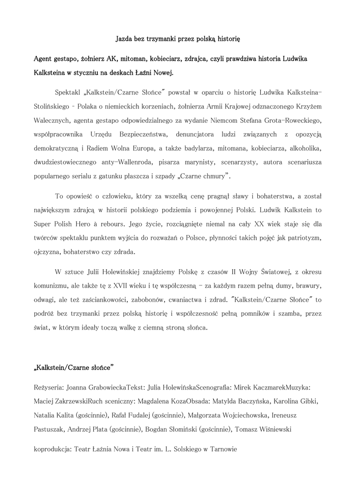 Jazda bez trzymanki przez polską historię Agent gestapo, żołnierz AK, mitoman, kobieciarz, zdrajca, czyli prawdziwa historia Ludwika Kalksteina w styczniu na deskach Łaźni Nowej. Spektakl „Kalkstein/Czarne Słońce" powstał w oparciu o historię Ludwika KalksteinaStolińskiego – Polaka o niemieckich korzeniach, żołnierza Armii Krajowej odznaczonego Krzyżem Walecznych, agenta gestapo odpowiedzialnego za wydanie Niemcom Stefana Grota-Roweckiego, współpracownika Urzędu Bezpieczeństwa, denuncjatora ludzi związanych z opozycją demokratyczną i Radiem Wolna Europa, a także badylarza, mitomana, kobieciarza, alkoholika, dwudziestowiecznego anty-Wallenroda, pisarza marynisty, scenarzysty, autora scenariusza popularnego serialu z gatunku płaszcza i szpady „Czarne chmury”. To opowieść o człowieku, który za wszelką cenę pragnął sławy i bohaterstwa, a został największym zdrajcą w historii polskiego podziemia i powojennej Polski. Ludwik Kalkstein to Super Polish Hero à rebours. Jego życie, rozciągnięte niemal na cały XX wiek staje się dla twórców spektaklu punktem wyjścia do rozważań o Polsce, płynności takich pojęć jak patriotyzm, ojczyzna, bohaterstwo czy zdrada. W sztuce Julii Holewińskiej znajdziemy Polskę z czasów II Wojny Światowej, z okresu komunizmu, ale także tę z XVII wieku i tę współczesną - za każdym razem pełną dumy, brawury, odwagi, ale też zaściankowości, zabobonów, cwaniactwa i zdrad. "Kalkstein/Czarne Słońce" to podróż bez trzymanki przez polską historię i współczesność pełną pomników i szamba, przez świat, w którym ideały toczą walkę z ciemną stroną słońca. „Kalkstein/Czarne słońce” Reżyseria: Joanna Grabowiecka Tekst: Julia Holewińska Scenografia: Mirek Kaczmarek Muzyka: Maciej Zakrzewski Ruch sceniczny: Magdalena Koza Obsada: Matylda Baczyńska, Karolina Gibki, Natalia Kalita (gościnnie), Rafał Fudalej (gościnnie), Małgorzata Wojciechowska, Ireneusz Pastuszak, Andrzej Plata (gościnnie), Bogdan Słomiński (gościnnie), Tomasz Wiśniewski koprodukcja: Teatr Łaźnia Nowa i Teatr im. L. Solskiego w Tarnowie Gramy: 22-24/01/2016, godz. 19:00