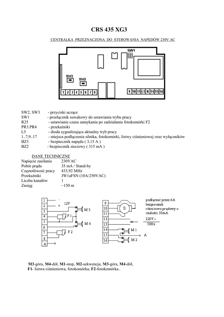 CRS 435 XG3 CENTRALKA PRZEZNACZONA DO STEROWANIA NAPĘDÓW 230V AC SW2, SW3 SW1 R25 PR3.PR4 L5 1..7,9..17 BZ3 BZ2 - przyciski uczące - przełącznik suwakowy do ustawiania trybu pracy - ustawianie czasu zamykania po zadziałaniu fotokomórki F2 - przekaźniki - dioda sygnalizująca aktualny tryb pracy - miejsca podłączenia silnika, fotokomórki, listwy ciśnieniowej oraz wyłączników - bezpiecznik napędu ( 3,15 A ) - bezpiecznik sieciowy ( 315 mA ) DANE TECHNICZNE Napięcie zasilania 230VAC Pobór prądu 35 mA / Stand-by Częstotliwość pracy 433,92 MHz Przekaźniki JW1aFSN (10A/250VAC) Liczba kanałów 1 Zasięg ~150 m M3-góra, M4-dół, M1-stop, M2-sekwencja, M3-góra, M4-dół, F1- listwa ciśnieniowa, fotokomórka, F2-fotokomórka.. OPIS OGÓLNY. Centralka słuŜy do sterowania napędem zasilanym napięciem 230V AC. Została wyposaŜona w trzy przyciski sterowania ręcznego : góra, stop i dół. Dodatkowo istnieje moŜliwość podłączenia łącznika ręcznego sekwencyjnego. Urządzenia bezpieczeństwa (listwa ciśnieniowa, fotokomórka) są normalnie rozwarte (NO). WyróŜniamy dwa tryby pracy centralki. Wybieramy je przełącznikiem SW 1: - jeśli 1 w połoŜeniu OFF to tryb normalny: zamykanie z podtrzymaniem, działa radio i klawisz sekwencyjny; - jeśli 1 w połoŜeniu ON to tryb deadman : zamykanie bez podtrzymania, radio i klawisz sekwencyjny nie działa. Przycisk ręczny M3(góra) działa zawsze z podtrzymaniem (w obu trybach pracy). Przycisk M4(dół) w normalnym trybie pracy działa z podtrzymaniem, natomiast w trybie deadman działa bez podtrzymania. Przycisk M2(opcja) jest aktywny tylko w trybie normalnym i działa w pętli góra-stop-dół-stop i tak dalej. Przycisk M1(stop) działa jako tzw. wyłącznik bezpieczeństwa przerywając ruch w kierunku otwierania i zamykania w kaŜdym trybie. Obsługa centralki przez pilota jest tylko moŜliwa w trybie normalnym. Pilot działa w ten sposób, Ŝe po naciśnięciu jednego z klawiszy (czarnego) następuje ruch w kierunku zamykania (z podtrzymaniem) a po naciśnięciu zielonego klawisza następuje ruch w kierunku otwierania (równieŜ z podtrzymaniem). KaŜde naciśnięcie, dowolnego klawisza pilota w czasie ruchu kraty powoduje jej zatrzymanie. Zadziałanie urządzenia bezpieczeństwa F2 spowoduje zamknięcie bramy po upływie czasu ustawionego potencjometrem R25. Potencjometr R25 pozwala ustawić czas od 10 do 120 sekund. PROGRAMOWANIE CENTRALKI. Centralka posiada moŜliwość „nauczenia się” i zapamiętania max. 15 róŜnych kodów. Naciśnięcie i przytrzymanie przełącznika SW3 spowoduje przejście centralki w tryb „uczenia się”. Sygnalizowane to będzie zaświeceniem diody sygnalizacyjnej L5 na ok. 1 sek., po których nastąpią 0.5 sek. błyski w ilości równej liczbie aktualnie zapamiętanych przez centralkę kodów. JeŜeli centralka nie pamięta Ŝadnych kodów, to nie nastąpią Ŝadne błyski. NaleŜy teraz nacisnąć (na dłuŜszą chwilę) przycisk pilota, którego kod ma być zapamiętany. Przyjęcie przez centralkę kodu pilota zostanie zasygnalizowane ponownym zaświeceniem diody L5 na około 1 sek. i następującej po tym serii błysków. JeŜeli ilość błysków wzrosła oznacza to, Ŝe centralka „nauczyła się” i zapamiętała kolejny kod. JeŜeli ilość błysków nie wzrosła oznacza to, Ŝe odebrany kod był juŜ znany centralce, lub teŜ Ŝe centralka pamięta juŜ 15 kodów . Powrót do normalnego trybu pracy odbywa się przez zwolnienie przełącznika SW3 i jest sygnalizowany zaświeceniem diody L5 na ok. 2 sek. „Wyuczone” kody są pamiętane takŜe po wyłączeniu i ponownym włączeniu zasilania. KASOWANIE ZAPAMIĘTANYCH KODÓW. JeŜeli zachodzi konieczność „skasowania” wszystkich poznanych dotychczas kodów to naleŜy, w trybie „uczenia się”, nacisnąć przycisk przełącznika SW2. Skasowanie kodów z pamięci centralki zostanie zasygnalizowane zaświeceniem diody L5 na około 1 sek. Po skasowaniu kodów naleŜy powrócić do normalnego trybu pracy uwalniając przyciski przełączników SW3 i SW2.