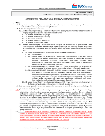 Część III – Opis Przedmiotu Zamówienia (OPZ) Załącznik nr 5 do OPZ Autokomputer pokładowy wraz z modułami komunikacyjnymi AUTOKOMPUTER POKŁADOWY WRAZ Z MODUŁAMI KOMUNIKACYJNYMI 1. Wstęp 1.1. Każdy dostarczany przez Wykonawcę pojazd musi mieć zamontowany autokomputer pokładowy wraz z modułami komunikacyjnymi zwane dalej Zestawem. 1.2. W skład każdego Zestawu wchodzi: 1.2.1. Autokomputer pokładowy z ekranem dotykowym o przekątnej minimum 10” odpowiedzialny za współpracę oraz sterowanie systemami pokładowymi: 1.2.1.1. system monitoringu wizyjnego, 1.2.1.2. system informacji pasażerskiej, 1.2.1.3. kasowniki biletowe, 1.2.1.4. system zapowiedzi głosowych, 1.2.1.5. system wspomagania jazdy. 1.2.2. Moduł komunikacyjny WLAN,GSM/UMTS służący do komunikacji z posiadanym przez Zamawiającego systemem zajezdniowym wykorzystywanym do wymiany danych dotyczących rozkładów jazdy, informacji o realizacji zadań przewozowych oraz systemem sterowania ruchem ITS. 1.2.2.1. Moduł komunikacyjny to urządzenie/zestaw urządzeń zawierający: 1.2.2.1.1. odbiornik GPS 1.2.2.1.2. moduł WLAN do komunikacji z systemami zajezdniowymi na terenie zajezdni związanymi z obsługą monitoringu wizyjnego, informacją pasażerską, systemem zliczania pasażerów, systemem raportowym dotyczącym realizacji zadań przewozowych, systemem napełniania rozkładami jazdy wraz z informacjami uzupełniającymi (np. zapowiedzi głosowe). 1.2.2.1.3. modem GSM\GPRS HSDPA-3G (bez karty SIM) do współpracy z systemem ITS wdrożonym we Wrocławiu (system sterowania ruchem i informacją pasażerską). 1.2.2.1.4. modem GSM\GPRS HSDPA-3G dual SIM (jednoczesna praca z 2 aktywnymi kartami SIM - praca w trybie dual sim, jak i możliwość pracy z 1 kartą SIM) do współpracy z systemami zajezdniowymi posiadanymi przez Zamawiającego związanymi z obsługą monitoringu wizyjnego, informacją pasażerską, systemem raportowym dotyczącym realizacji zadań przewozowych, systemem napełniania rozkładami jazdy wraz z informacjami uzupełniającymi (np. zapowiedzi głosowe). 1.2.2.2. Moduł komunikacyjny musi udostępniać sygnał GPS innym systemom zainstalowanym w dostarczanych pojazdach, m.in. systemowi zliczania pasażerów. 1.3. Zestawy muszą posiadać wszystkie połączenia wykonane w sposób trwały, uniemożliwiający ich samoczynne rozłączenie się. 1.4. Po zamontowaniu Zestaw musi współpracować z posiadaną przez Zamawiającego istniejącą infrastrukturą teleinformatyczną oraz oprogramowaniem i pozwalać na wymianę danych z aktualnie działającym systemem MPK służącym do komunikacji z zainstalowanymi w pojazdach autokomputerami (pobieranie danych eksploatacyjnych, logów itp. oraz napełnianie danymi, które zawierają m.in.: rozkłady jazdy, zapowiedzi głosowe, treści tablic, dane dla systemu ITS, itp.) poprzez posiadane przez Zamawiającego stacje bazowe zainstalowane na zajezdniach, lub w razie ich awarii za pomocą nośników zewnętrznych np. pendriva. Obecnie do przygotowywania danych MPK wykorzystuje oprogramowanie "Pixel Eksplorator Pro" firmy Pixel, przy czym w roku 2017 planowana jest zmiana oprogramowania na aplikację "EasyWay" firmy SiMS. Dostarczone przez Wykonawcę autokomputery muszą być przystosowane do korzystania z danych generowanych przez ww. oprogramowania. 1.4.1.5. Wykonawca rozszerzy możliwość przesyłania danych pomiędzy autokomputerami a stacją bazową o funkcjonalność przesyłania danych za pośrednictwem GSM\GPRS HSDPA-3G. Jako podstawowy kanał dystrybucji danych wykorzystywana będzie łączność WiFi, natomiast łączność za pomocą sieci komórkowych wykorzystywana będzie tylko w sytuacjach wyjątkowych (użytkownik musi mieć możliwość decydowania kiedy wysłać dane w taki sposób). SIWZ – PN/44/2016 Dzierżawa 60 sztuk fabrycznie nowych, miejskich autobusów niskopodłogowych wraz z prawem opcji Strona 1 z 5 Część III – Opis Przedmiotu Zamówienia (OPZ) 1.5.1.6. Wykonawca dostarczy 2 dodatkowe autokomputery oraz oprogramowanie dla stanowisk testowych symulujące pracę tablic oraz zapowiedzi głosowych, służące do sprawdzania poprawności pracy danych przesyłanych do pojazdów dostarczonych w ramach Zamówienia. 2. Wymagania ogólne. Autokomputer musi: 2.1. być zainstalowany w kabinie kierowcy w takim miejscu, aby umożliwiał bezproblemowy dostęp i obsługę – miejsce do ustalenia z Zamawiającym; 2.2. wyświetlać na ekranie głównym aktualne informacje dotyczące trasy (w tym nazwy kolejnych przystanków, informacje o statusie przystanków „na żądanie”) oraz podawać odchylenie czasowe przejazdu w stosunku do planowanego rozkładu jazdy – odchylenie powinno odnosić się do najbliższego przystanku i zmienić się na przystanek kolejny dopiero po opuszczeniu strefy przystanku aktualnego. Informacje te muszą być dostępne w wydzielonej strefie ekranu, nawet podczas podglądu obrazu z kamer; 2.3. Wyświetlać aktualną odległość do następnego przystanku (aktualizowaną na bieżąco); 2.4. Wyświetlać (w postaci strzałek) kierunek jazdy i najbliższy manewr; 2.5. po zalogowaniu się kierującego do autokomputera umożliwić wybór realizowanego zadania przewozowego (zgodnie z rozkładem jazdy). Kolejne kursy muszą być podpowiadane kierującemu, zgodnie z ich kolejnością wynikającą z wybranego zadania przewozowego; 2.6. zapewnić możliwość ręcznego załączenia podglądu z kamer systemu monitoringu wizyjnego; 2.7. zapewnić wyświetlenie obrazu z kamery cofania po załączeniu biegu wstecznego i powrót do ekranu głównego po jego wyłączeniu; 2.8. umożliwiać kierującemu pojazd manualną zmianę linii, kierunku jazdy i kursu z rozkładu jazdy w przypadku konieczności zmiany trasy; 2.9. zapewnić wyświetlanie statusu pracy następujących systemów: 2.9.1. system monitoringu wizyjnego, 2.9.2. system informacji pasażerskiej, 2.9.3. kasowników biletowych; 2.10. być wyposażony w koloro