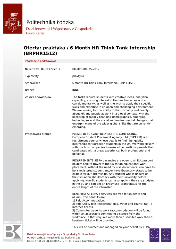 Oferta: praktyka / 6 Month HR Think Tank Internship (BRPHR1512) Informacje podstawowe: Nr ref.wew. Biura Karier PŁ BK-OPR-00035-2017 Typ oferty praktyka Stanowisko 6 Month HR Think Tank Internship (BRPHR1512) Branża INNE, Zakres obowiązków The tasks require students with creative ideas, analytical capability, a strong interest in Human Resources and a can-do mentality, as well as the wish to apply their specific skills and expertise in an open and challenging environment. We are looking for the ability to think broadly and deeply about HR and people at work in a global context, with the backdrop of rapidly changing demographics, emerging technologies and the social and environmental changes that underpin many of the wider global shifts that are currently emerging. Pracodawca oferuje PLEASE READ CAREFULLY BEFORE CONTINUING. European Student Placement Agency, Ltd (ESPA UK) is a recruitment agency whose goal is to find high quality internships for European students in the UK. We work closely with our host companies to ensure the positions provide the candidates with a great experience, both professional and personal. REQUIREMENTS: ESPA vacancies are open to all EU passport holders able to travel to the UK for an educational work placement, without the need for visa documents. You have to be a registered student and/or have Erasmus+ status to be eligible for our internships. Any student who is unsure of their situation should check with their university before applying. Non-EU students can also apply if they are studying in the EU and can get an Erasmus+ grant/status for the entire length of the internship. BENEFITS: All ESPA’s services are free for students and alumni. The benefits are: 1) Paid Accommodation. 2) Paid Utility Bills (electricity, gas, water and council tax) + Internet Access 3) Commuter travel to work (accommodation will be found within an acceptable commuting distance from the workplace, if that requires more than a sensible walk then a bus/train ticket will be provided). This will be sourced and managed on your behalf by ESPA. These benefits have an approximate value of 700€-1000€ per month (depending on location). There is no salary over and above the benefits offered, unless specifically stated. To know more, please visit: www.espauk.com Miejsce pracy: Kraj WIELKA BRYTANIA, Miejscowość London Wymaganie odnośnie kandydata: Wymagana znajomość języków język - Angielski Dodatkowe umiejętności • You wish to be part of a progressive group of like-minded individuals searching for new ideas and developing new insights for Human Resources. • You have a track record of successful team work with the ability to work with a diverse group of people. • You would like to work in a dynamic environment where there is space for new ideas, wider thinking and ways of working and where supervision is more ‘light touch’ guidance rather than day-to-day management. • You are a self-starter, adaptive to change and can respond quickly and positively to revised scope and direction of activities. • You are ideally a Master level student. Dane kontaktowe: Nazwa firmy/Pracodawcy Kraj Miasto Adres Kod pocztowy ESPA UK WIELKA BRYTANIA Bath Unit 12, Brassmill Enterprise Centre Brassmill Lane BA1 3JN Sposób aplikacji: EMAIL: [email protected] Data umieszczenia: Oferta ważna od 17-01-2017 do 18-04-2017 znajomość Bardzo dobra Politechnika Łódzka, jest wpisana pod numerem 2414 do rejestru podmiotów prowadzących agencje zatrudnienia.