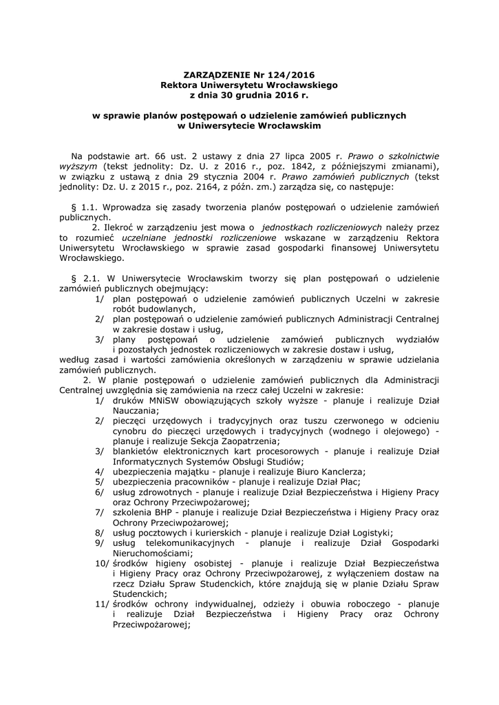 ZARZĄDZENIE Nr 124/2016 Rektora Uniwersytetu Wrocławskiego z dnia 30 grudnia 2016 r. w sprawie planów postępowań o udzielenie zamówień publicznych w Uniwersytecie Wrocławskim Na podstawie art. 66 ust. 2 ustawy z dnia 27 lipca 2005 r. Prawo o szkolnictwie wyższym (tekst jednolity: Dz. U. z 2016 r., poz. 1842, z późniejszymi zmianami), w związku z ustawą z dnia 29 stycznia 2004 r. Prawo zamówień publicznych (tekst jednolity: Dz. U. z 2015 r., poz. 2164, z późn. zm.) zarządza się, co następuje: § 1.1. Wprowadza się zasady tworzenia planów postępowań o udzielenie zamówień publicznych. 2. Ilekroć w zarządzeniu jest mowa o jednostkach rozliczeniowych należy przez to rozumieć uczelniane jednostki rozliczeniowe wskazane w zarządzeniu Rektora Uniwersytetu Wrocławskiego w sprawie zasad gospodarki finansowej Uniwersytetu Wrocławskiego. § 2.1. W Uniwersytecie Wrocławskim tworzy się plan postępowań o udzielenie zamówień publicznych obejmujący: 1/ plan postępowań o udzielenie zamówień publicznych Uczelni w zakresie robót budowlanych, 2/ plan postępowań o udzielenie zamówień publicznych Administracji Centralnej w zakresie dostaw i usług, 3/ plany postępowań o udzielenie zamówień publicznych wydziałów i pozostałych jednostek rozliczeniowych w zakresie dostaw i usług, według zasad i wartości zamówienia określonych w zarządzeniu w sprawie udzielania zamówień publicznych. 2. W planie postępowań o udzielenie zamówień publicznych dla Administracji Centralnej uwzględnia się zamówienia na rzecz całej Uczelni w zakresie: 1/ druków MNiSW obowiązujących szkoły wyższe - planuje i realizuje Dział Nauczania; 2/ pieczęci urzędowych i tradycyjnych oraz tuszu czerwonego w odcieniu cynobru do pieczęci urzędowych i tradycyjnych (wodnego i olejowego) planuje i realizuje Sekcja Zaopatrzenia; 3/ blankietów elektronicznych kart procesorowych - planuje i realizuje Dział Informatycznych Systemów Obsługi Studiów; 4/ ubezpieczenia majątku - planuje i realizuje Biuro Kanclerza; 5/ ubezpieczenia pracowników - planuje i realizuje Dział Płac; 6/ usług zdrowotnych - planuje i realizuje Dział Bezpieczeństwa i Higieny Pracy oraz Ochrony Przeciwpożarowej; 7/ szkolenia BHP - planuje i realizuje Dział Bezpieczeństwa i Higieny Pracy oraz Ochrony Przeciwpożarowej; 8/ usług pocztowych i kurierskich - planuje i realizuje Dział Logistyki; 9/ usług telekomunikacyjnych - planuje i realizuje Dział Gospodarki Nieruchomościami; 10/ środków higieny osobistej - planuje i realizuje Dział Bezpieczeństwa i Higieny Pracy oraz Ochrony Przeciwpożarowej, z wyłączeniem dostaw na rzecz Działu Spraw Studenckich, które znajdują się w planie Działu Spraw Studenckich; 11/ środków ochrony indywidualnej, odzieży i obuwia roboczego - planuje i realizuje Dział Bezpieczeństwa i Higieny Pracy oraz Ochrony Przeciwpożarowej; 12/ wywozu odpadów komunalnych z terenu wszystkich nieruchomości należących do Uniwersytetu Wrocławskiego na terenie miasta Wrocławia planuje i realizuje Dział Gospodarki Nieruchomościami, z wyłączeniem dostaw na rzecz Działu Spraw Studenckich, które znajdują się w planie Działu Spraw Studenckich; 13/ usług przewozowych na rzecz jednostek organizacyjnych Uniwersytetu Wrocławskiego - planuje i realizuje Dział Logistyki, z wyłączeniem usług przewozowych na rzecz Biura Dolnośląskiego Festiwalu Nauki oraz usług przewozowych dotyczących ćwiczeń terenowych dla studentów, które znajdują się w planach zamówień publicznych wydziałów; 14/ urzędowych tablic informacyjnych - planuje i realizuje Sekcja Zaopatrzenia, z wyłączeniem dostaw na rzecz Działu Spraw Studenckich, które znajdują się w planie Działu Spraw Studenckich; 15/ alkoholu etylowego - planuje i realizuje Sekcja Zaopatrzenia; 16/ ochrony mienia - planuje i realizuje Dział Ochrony Mienia, z wyłączeniem dostaw i usług na rzecz Działu Spraw Studenckich, które znajdują się w planie Działu Spraw Studenckich; 17/ sprzątania nieruchomości Uczelni - planuje i realizuje Dział Gospodarki Nieruchomościami, z wyłączeniem dostaw i usług na rzecz Działu Spraw Studenckich, które znajdują się w planie Działu Spraw Studenckich; 18/ biletów lotniczych, kolejowych i autobusowych dla celów podróży i wyjazdów - planuje i realizuje Biuro Współpracy Międzynarodowej; 19/ utylizacji - planuje i realizuje Sekcja Gospodarowania Majątkiem Uczelni; 20/ licencji oprogramowania antywirusowego - planuje i realizuje Dział Usług Informatycznych; 21/ dostaw mediów – planuje i realizuje Dział Infrastruktury Technicznej; 22/ dostaw materiałów budowlanych i eksploatacyjnych, usług konserwacyjnych instalacji i urządzeń – planuje Dział Infrastruktury Technicznej, a realizuje Dział Infrastruktury Technicznej lub inna wskazana jednostka, z wyłączeniem dostaw i usług na rzecz Działu Spraw Studenckich, które znajdują się w planie Działu Spraw Studenckich; 23/ robót budowlanych – planuje i realizuje Dział Nadzoru Technicznego lub Dział Realizacji Inwestycji; 24/ usług na wykonanie dokumentacji związanych z robotami budowlanymi – planuje i realizuje Dział Przygotowania Inwestycji i Remontów. 3. Wydziały i pozostałe jednostki rozliczeniowe w swoich planach zamówień publicznych uwzględniają tylko zamówienia związane z ich własną działalnością. Zapotrzebowania na zamówienia w pozostałym zakresie, w szczególności określone w ust. 2 wydziały i pozostałe jednostki rozliczeniowe składają do wskazanych komórek Administracji Centralnej. § 3.1. Podstawą do sporządzenia planu postępowań o udzielenie zamówień publicznych w zakresie robót budowlanych oraz planu postępowań o udzielenie zamówień publicznych w zakresie dokumentacji związanej z robotami budowlanymi są: projekt planu inwestycyjnego, projekt planu remontów uczelni oraz projekt planu remontów domów studenckich. 2. Projekt planu inwe