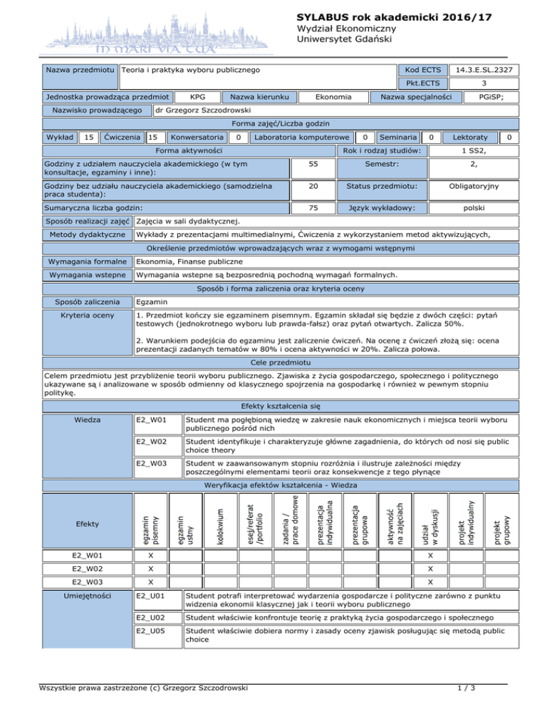 SYLABUS rok akademicki 2016/17 Wydział Ekonomiczny Uniwersytet Gdański Nazwa przedmiotu Teoria i praktyka wyboru publicznego Jednostka prowadząca przedmiot Nazwisko prowadzącego KPG Nazwa kierunku Ekonomia Kod ECTS 14.3.E.SL.2327 Pkt.ECTS 3 Nazwa specjalności PGiSP; dr Grzegorz Szczodrowski Forma zajęć/Liczba godzin Wykład 15 Ćwiczenia 15 Konwersatoria 0 Laboratoria komputerowe Forma aktywności 0 Seminaria 0 Lektoraty Rok i rodzaj studiów: 1 SS2, Godziny z udziałem nauczyciela akademickiego (w tym konsultacje, egzaminy i inne): 55 Semestr: 2, Godziny bez udziału nauczyciela akademickiego (samodzielna praca studenta): 20 Status przedmiotu: Obligatoryjny Sumaryczna liczba godzin: 75 Język wykładowy: polski 0 Sposób realizacji zajęć Zajęcia w sali dydaktycznej. Metody dydaktyczne Wykłady z prezentacjami multimedialnymi, Ćwiczenia z wykorzystaniem metod aktywizujących, Określenie przedmiotów wprowadzających wraz z wymogami wstępnymi Wymagania formalne Ekonomia, Finanse publiczne Wymagania wstepne Wymagania wstepne są bezposrednią pochodną wymagań formalnych. Sposób i forma zaliczenia oraz kryteria oceny Sposób zaliczenia Kryteria oceny Egzamin 1. Przedmiot kończy sie egzaminem pisemnym. Egzamin składał się będzie z dwóch części: pytań testowych (jednokrotnego wyboru lub prawda-fałsz) oraz pytań otwartych. Zalicza 50%. 2. Warunkiem podejścia do egzaminu jest zaliczenie ćwiczeń. Na ocenę z ćwiczeń złożą się: ocena prezentacji zadanych tematów w 80% i ocena aktywności w 20%. Zalicza połowa. Cele przedmiotu Celem przedmiotu jest przybliżenie teorii wyboru publicznego. Zjawiska z życia gospodarczego, społecznego i politycznego ukazywane są i analizowane w sposób odmienny od klasycznego spojrzenia na gospodarkę i również w pewnym stopniu politykę. Efekty kształcenia się Wiedza E2_W01 Student ma pogłębioną wiedzę w zakresie nauk ekonomicznych i miejsca teorii wyboru publicznego pośród nich E2_W02 Student identyfikuje i charakteryzuje główne zagadnienia, do których od nosi się public choice theory E2_W03 Student w zaawansowanym stopniu rozróżnia i ilustruje zależności między poszczególnymi elementami teorii oraz konsekwencje z tego płynące Weryfikacja efektów kształcenia - Wiedza Efekty E2_W01 X X E2_W02 X X E2_W03 X X Umiejętności E2_U01 Student potrafi interpretować wydarzenia gospodarcze i polityczne zarówno z punktu widzenia ekonomii klasycznej jak i teorii wyboru publicznego E2_U02 Student właściwie konfrontuje teorię z praktyką życia gospodarczego i społecznego E2_U05 Student właściwie dobiera normy i zasady oceny zjawisk posługując się metodą public choice Wszystkie prawa zastrzeżone (c) Grzegorz Szczodrowski 1/3 SYLABUS rok akademicki 2016/17 Wydział Ekonomiczny Uniwersytet Gdański E2_U07 Student racjonalnie dobiera argumenty i przedstawia alternatywne spojrzenia na sposoby rozwiązaniia problemów E2_U08 Student potrafi ocenić analizowane zdarzenia w oparciu o pogłębioną analizę przedmiotu badań E2_U09 Student posiada umiejętność pisania typowych prac w języku polskim i obcym w zakresie omawianych zagadnień Weryfikacja efektów kształcenia - Umiejętności Efekty E2_U01 X X E2_U02 X X E2_U05 X E2_U07 X E2_U08 X E2_U09 X Kompetencje E2_K03 Student potrafi dobrze określać priorytety i organizować zadania związane z ich realizacją na każdym etapie E2_K05 Student uczestnicząc w przygotowaniu projektów zawodowych potrafi godzić w możliwym stopniu wymagania prawne, ekonomiczne, polityczne itp. E2_K07 Student jest przedsiębiorczy i kreatywny w swoim działaniu, wykorzystując wiedzę nabytą podczas zajęć dostosowuje się właściwie do zmieniających się warunków w otoczeniu Weryfikacja efektów kształcenia - Kompetencje Efekty E2_K03 X E2_K05 X E2_K07 X E2_K03 X E2_K05 X E2_K07 X Treści programowe Wykłady Rynek a rząd niedoskonałości rynku, dobra publiczne i prywatne, wady sektora publicznego, efekty zewnętrzne, "pasażerowie na gapę", dylemat tchórza i dylemat więźnia, rola rządu w dostarczaniu dóbr Koszty zewnętrzne ochrona prawna przed kosztami zewnętrznymi, sposoby wyboru polityków, relacje politycy - urzędnicy, typy biurokracji, zewnętrzne koszty zbiorowego podejmowania decyzji, trójpodział władz w państwie, przepisy przeciw kupowaniu głosów, wolność słowa i rola mediów Głosowanie i wybory, racjonalność i paradoksy metody wyboru władzy ustawodawczej, systemy przedstawicielskie, preferencje wyborców, głosowanie aprobujące, partie i ich strategie przedwyborcze, hipotezy: racjonalnego wyborcy i środkowego wyborcy, paradoks wyborczy Rządy większości i handel głosami Wszystkie prawa zastrzeżone (c) Grzegorz Szczodrowski 2/3 SYLABUS rok akademicki 2016/17 Wydział Ekonomiczny Uniwersytet Gdański problem nieefektywności rządów większości, efektywność i zadowolenie wyborcy z dostarczania dóbr w różnych sytuacjach, powody handlu głosami w parlamentach, logrolling Działalność grup nacisku w demokracji interes publiczny a interes prywatny, lobbing, lobbing a inne formy komunikowania, modele lobbingu, dobra klubowe w gospodarce rynkowej, wybór metod dostawy dóbr, monopole, powiązania grup nacisku z partiami politycznymi, system łupów wyborczych, model Olsona, model biurokratyczne podaży i popytu, metody finansowania działalności biurokracji a świadomość dokonywania wyborów, renty ekonomiczne Uwarunkowania wdrażania reform w państwie ocena efektywności działalności agencji publicznych, ustanowienie organów nadzoru, decentralizacja i różne metody prywatyzacji - opór i działania łagodzące państwa, kontrakty i rozbijanie monopoli państwowych Korupcja jako problem ekonomiczny Ćwiczenia: Systemy podatkowe i decyzje fiskalne jednostek decyzje fiskalne w opodatkowaniu bezpośrednim i pośrednim, sposoby opodatkowania dochodów osobistych a decyzje, szczególne przypadki decyzji fiskalnych, bariery 