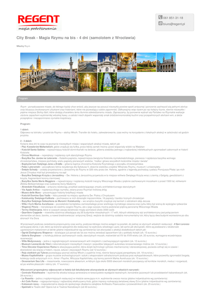 061 851-31-18 [email protected] City Break - Magia Rzymu na bis - 4 dni (samolotem z Wrocławia) Włochy Rzym Program Rzym - ponadczasowe miasto, do którego każdy chce wrócić, aby jeszcze raz poczuć niezwykły powiew epoki antycznej i ponownie zachwycić się pełnymi słońca oraz bluszczu brukowanymi uliczkami oraz historiami, które nie pozwalają o sobie zapomnieć. Odkrywajmy więc razem po raz kolejny liczne, równie niezwykłe i piękne miejsca Stolicy Italii, które dodają charakteru temu tłumnie odwiedzanemu miastu. Zapraszamy, by ponownie wybrali się Państwo na Rzymskie wakacje otulone zapachem wyśmienitej włoskiej kawy, a całości niech dopełni wspaniały smak śródziemnomorskiej kuchni oraz przepełnionych słońcem win, a także przepiękne i niezapomniane rzymskie krajobrazy. Program: 1 dzień: Odprawa na lotnisku i przelot do Rzymu – stolicy Włoch. Transfer do hotelu, zakwaterowanie, czas wolny na korzystanie z lokalnych atrakcji w zależności od godzin przylotu. 2 - 3 dzień: Kolejne dwa dni to czas na poznanie niezwykłych miejsc i wspaniałych atrakcji miasta, takich jak - Plac Kawalerów Maltańskich, gdzie znajduje się furtka, przez której zamek można ujrzeć wspaniały widok na Watykan - Kościół Santa Sabina – najważniejszy kościół dominikański na świecie, główna siedziba jednego z najbardziej intelektualnych zgromadzeń zakonnych w historii Kościoła - Circus Maximus – największy i najstarszy cyrk starożytnego Rzymu - Bazylika Św. Janów na Lateranie – Katedra papieża, najważniejsza świątynia Kościoła rzymskokatolickiego, pierwsza i najstarsza bazylika wolnego chrześcijaństwa, miejsce pochówku wielu papieży pierwszych wieków, “matka i głowa wszystkich kościołów miasta i świata” - Baptysterium Świętego Jana u Źródła – główna kaplica chrzcielna Kościoła Rzymskiego z początku chrześcijaństwa - Pałac Laterański – początkowo letnia rezydencja dla Sykstusa V, obecnie siedziba urzędów Wikariatu Rzymu, muzeum i uniwersytetu - Święte Schody – zostały przywiezione z Jerozolimy do Rzymu w 326 roku przez św. Helenę, zgodnie z legendą pochodzą z pałacu Poncjusza Piłata i po nich Jezus Chrystus miał być prowadzony na sąd - Bazylika Świętego Krzyża z Jerozolimy – Św. Helena z Jerozolimy przywiozła w to miejsce relikwie Świętego Krzyża wraz z ziemią z Golgoty, gwoździami z krzyża, fragmentami korony cierniowej - Bazylika Santa Maria Maggiore – najważniejszy i najstarszy kościół maryjny Wiecznego Miasta z pięknie zachowanymi mozaikami z przed 1500 lat, relikwiami Żłóbka Betlejemskiego oraz cudownej ikony Madonny - Akwedukt Klaudiusza – antyczny wodociąg, przykład zadziwiającego zmysłu architektonicznego starożytnych - Via Appia Antica – najstarsza droga rzymska, zwana przez Rzymian królową dróg - Museo delle Mura – prezentujące historię fortyfikacji miasta - Kościół Domine Quo Vadis – który powstał na miejscu spotkania Św. Piotra z Chrystusem - Katakumby Świętego Kaliksta – pochowano w nich dziesiątki męczenników, 16 papieży i bardzo licznych chrześcijan - Bazylika Świętego Sebastiana za Murami i Katakumby – we wnętrzu bazyliki znajduje się kamień z odciskiem stóp Jezusa - Willa i Cyrk Marka Aureliusza – pozostałości kompleksu zamieszkałego przez wielkiego rzymskiego cesarza oraz cyrku który był areną do wyścigów rydwanów - Wzgórze Pincio – nienależące do siedmiu wzgórz Rzymu, ale z jego szczytu można podziwiać piękną panoramę Wiecznego Miasta - Termy Dioklecjana, które w czasach swojej świetności mogły pomieścić około 3000 osób - Quartiere Coppede – niewielka dzielnica składająca się 26 budynków mieszkalnych i 17 willi, których eklektyczny styl architektoniczny jest połączeniem elementów art deco, baroku, a nawet średniowiecza i antycznej Grecji, wejście do dzielnicy ozdabia monumentalny łuk, który łączy dwa budynki wzniesione po obu stronach Via Dora W przerwach podczas zwiedzania proponujemy czas wolny, podczas którego można wstąpić na posiłek, do jednej ze słynnych włoskich restauracji - Il San Lorenzo serwującej dania z ryb, które są łowione specjalnie dla restauracji na wybrzeżu włoskiego Lazio, tak samo jak skorupiaki, które są podawane z doskonale ugotowanym makaronem al dente (płatne indywidualnie wg zamówienia) lub skorzystać z atrakcji dodatkowych takich jak: - Ogród Zoologiczny Bioparco – działające już ponad sto lat zoo można zwiedzać spacerkiem lub z pokładu kolejki (ok. 15 euro/os.) - Galeria Borghase – z kolekcją dobrze zachowanych rzeźb, starożytnych mozaik, malowideł od XV do XVIII wieku (ok. 20 euro/os, wymagana wcześniejsza rezerwacja) - Willa Medyceuszy – jedna z najpiękniejszych renesansowych willi miejskich z zachwycającym ogrodem (ok. 12 euro/os.) - Muzeum Leonardo da Vinci z rekonstrukcjami niezwykłych maszyn i pojazdów latających autorstwa renesansowego mistrza (ok. 12 euro/os.) - Time Elevator Experience Roma to ekscytująca podróż, która dzięki technologii cyfrowo-mechanicznej i stereoskopowej, pozwala cofnąć się w czasie i dowiedzieć się więcej o historii, nauce, sztuce i zwyczajach Rzymu (od 12 euro/os.) - Rejs statkiem po Tybrze pozwalający poznać stolicę Włoch z zupełnie innej, równie fascynującej perspektywy (ok. 18 euro/os.) - Muzea Kapitolińskie – grupa muzeów archeologicznych i sztuki z eksponatami odnalezionymi podczas prac wykopaliskowych, które pozwoliły zgromadzić bogatą kolekcję rzeźb antycznych m.in.: Amor i Psyche, Wilczyca Kapitolińska, czy konny pomnik Marka Aureliusza (ok. 15 euro/os.) - Oceanarium Sea Life – niesamowite, nowoczesne akwarium, w którym żyje około 5000 stworzeń morskich począwszy od koników morskich, meduz i rozgwiazd, aż po wielkie płaszczki i rekiny (ok. 17 euro/os.) Wieczorami proponujemy odpoczynek w hotelu lub fakultatywne skorzystanie z