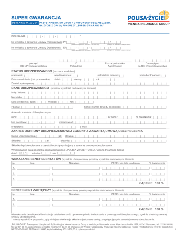 SUPER GWARANCJA D E K L A R AC JA Z G O DY P R Z YS TĄ P I E N I A D O U M O W Y G R U P O W E G O U B E Z P I E C Z E N I A N A Ż YC I E Z O P C JĄ F U N D U S Z Y „ S U P E R G WA R A N C JA” POLISA NR: - - * Nr wniosku o zawarcie Umowy Podstawowej: P/ - - / (data sporządzenia wniosku: dd-mm-rrrr) Nr wniosku o zawarcie Umowy Dodatkowej: D/ - - (data sporządzenia wniosku: dd-mm-rrrr) pieczęć RBH/Przedstawicielstwa ID Pośrednika (kolejny nr wniosku w danym dniu) / (kolejny nr wniosku w danym dniu) Rodzaj pośrednika Agent/Broker Data wpływu do RBH/Przedstawicielstwa STATUS UBEZPIECZANEGO (zaznacz właściwe): pracownik: współmałżonek: Data zatrudnienia (dot. pracownika) dzień: pełnoletnie dziecko: miesiąc: konkubent/ partner: rok: Zawód wykonywany: DANE UBEZPIECZANEGO (prosimy wypełniać drukowanymi literami) Imię / imiona: Nazwisko: Data urodzenia / dzień: miesiąc: rok: PESEL: Seria i numer dowodu osobistego: Adres do kontaktu z Ubezpieczanym: ulica: nr domu: kod pocztowy: – nr mieszkania: miejscowość: nr telefonu: e-mail: ZAKRES OCHRONY UBEZPIECZENIOWEJ ZGODNY Z ZAWARTĄ UMOWĄ UBEZPIECZENIA Suma Ubezpieczenia Składka zł: zł: słownie: słownie: Składka będzie opłacana z częstotliwością wynikającą z zawartej umowy ubezpieczenia. Wnioskowana data początku odpowiedzialnośći „POLISA-ŻYCIE” TU S.A. Vienna Insurance Group dzień: 0 1 miesiąc: rok: WSKAZANIE BENEFICJENTA / ÓW (wypełnia Ubezpieczany, prosimy wypełniać drukowanymi literami) Lp. Imię Nazwisko PESEL lub data urodzenia % świadczenia 1. 2. 3. ŁĄCZNIE 100 % BENEFICJENT ZASTĘPCZY (wypełnia Ubezpieczany, prosimy wypełniać drukowanymi literami) Lp. Imię Nazwisko PESEL lub data urodzenia % świadczenia 1. 2. ŁĄCZNIE 100 % Niewskazanie beneficjenta/ów skutkuje ustalaniem osób uprawnionych do świadczenia z tytułu zgonu Ubezpieczonego, zgodnie z treścią zawartej umowy ubezpieczenia. * należy wypełnić w przypadku, gdy niniejsza deklaracja składana jest przez osobę, przystępującą do zawartej umowy ubezpieczenia. „POLISA-ŻYCIE” Towarzystwo Ubezpieczeń Spółka Akcyjna Vienna Insurance Group z siedzibą w Warszawie, adres: Aleje Jerozolimskie 162A, 02-342 Warszawa, tel.: 22 501 68 88, fax: 22 501 68 77, zarejestrowane w Sądzie Rejonowym dla m. st. Warszawy XII Wydział Gospodarczy Krajowego Rejestru Sądowego, Rejestr Przedsiębiorców Nr KRS: 0000057533, NIP 525-10-01-382, REGON 011133445, kapitał zakładowy 57.313.250,00 zł, opłacony w całości. 1 OŚWIADCZENIA Wyrażam zgodę, aby ta deklaracja i zawarte w niej informacje były podstawą do objęcia mnie ochroną ubezpieczeniową. Przyjmuję do wiadomości, że niniejsza deklaracja podlega weryfikacji przed objęciem mnie ochroną ubezpieczeniową Przed podpisaniem niniejszej deklaracji, otrzymałem/ łam Ogólne Warunki Grupowego Ubezpieczenia na Życie z Opcją Funduszy „SUPER GWARANCJA”, Ogólne Warunki Umowy Dodatkowej do Umowy Grupowego Ubezpieczenia na Życie z Opcja Funduszy „SUPER GWARANCJA” 1), wskazane w umowie ubezpieczenia potwierdzonej polisą o numerze przywołanym w niniejszej deklaracji / we wniosku o zawarcie Umowy Podstawowej przywołanym w niniejszej deklaracji / wniosku o zawarcie Umowy Dodatkowej1) przywołanym w niniejszej deklaracji, Skorowidze określające istotne warunki ubezpieczenia, które stanowią załączniki do ww. Ogólnych Warunków Ubezpieczenia, inne dokumenty kształtujące treść umowy ubezpieczenia, Regulamin Uczestnictwa w Programie „Pakiet Usług Assistance” 2), a także Zasady rozpatrywania reklamacji w „POLISA-ŻYCIE” TU S.A. Vienna Insurance Group, z którymi się zapoznałem/ łam i których treść akceptuję. Wyrażam zgodę na udział w Programie „Pakiet Usług Assistance”, na podstawie ww. Regulaminu Uczestnictwa w Programie „Pakiet Usług Assistance”. Wyrażam równocześnie zgodę na przekazywanie moich danych osobowych AGA International S.A. Główny Oddział w Polsce z siedzibą w Warszawie przy ul. Domaniewskiej 50B, w celach związanych z realizacją Programu2). Przyjmuję do wiadomości, że Administratorami danych osobowych są: „POLISA-ŻYCIE” TU S.A. Vienna Insurance Group z siedzibą w Warszawie przy Alejach Jerozolimskich 162A oraz AGA International S.A. Główny Oddział w Polsce z siedzibą w Warszawie przy ul. Domaniewskiej 50B2). Celem zbierania danych jest wykonywanie umowy ubezpieczenia. Oświadczam, że w dniu podpisania niniejszej deklaracji nie jestem niezdolny do pracy z powodu choroby. Wyrażam zgodę na uzyskiwanie przez „POLISA-ŻYCIE” TU S.A. Vienna Insurance Group od podmiotów wykonujących działalność leczniczą, w tym zakładów opieki zdrowotnej, osób fizycznych wykonujących zawód medyczny, grupowych praktyk lekarskich, grupowych praktyk pielęgniarek oraz Zakładu Ubezpieczeń Społecznych, informacji o okolicznościach związanych z oceną ryzyka ubezpieczeniowego i weryfikacją podanych danych o stanie zdrowia Ubezpieczonego, ustaleniem prawa do świadczenia z umowy ubezpieczenia i wysokością tego świadczenia, a także informacji o przyczynie śmierci, z wyłączeniem wyników badań genetycznych. Przyjmuję do wiadomości, iż stopień trwałego uszczerbku na zdrowiu orzekany jest na podstawie Tabeli Norm Oceny Procentowej Trwałego Uszczerbku na zdrowiu w wyniku nieszczęśliwego wypadku, zatwierdzonej przez Zarząd „POLISA-ŻYCIE” TU S.A. Vienna Insurance Group którą otrzymałem/ łam. Pełnomocnictwo: Udzielam Ubezpieczającemu pełnomocnictwa do reprezentowania mnie, w tym składania wszelkich oświadczeń woli, koniecznych do zmian umowy ubezpieczenia, na które uprzednio wyraziłem/łam zgodę, w tym także sumy ubezpieczenia, zawartej na moją rzecz umowy Grupowego Ubezpieczenia na Życie z Opcją Funduszy „SUPER GWARANCJA”, do której niniejszym przystępuję. Wyrażam zgodę na przetwarzanie przez „POLISA-ŻYCIE” TU S.A. Vienna Insurance Group, obecnie or