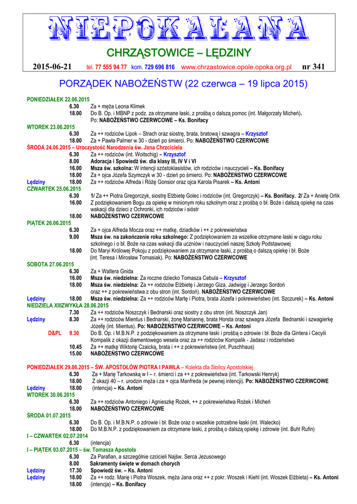 NIEPOKALANA CHRZĄSTOWICE – LĘDZINY 2015-06-21 tel. 77 555 94 77 kom. 729 696 816 www.chrzastowice.opole.opoka.org.pl nr 341 PORZĄDEK NABOŻEŃSTW (22 czerwca – 19 lipca 2015) PONIEDZIAŁEK 22.06.2015 6.30 Za + męża Leona Klimek 18.00 Do B. Op. i MBNP z podz. za otrzymane łaski, z prośbą o dalszą pomoc (int. Małgorzaty Micheń). Po: NABOŻEŃSTWO CZERWCOWE – Ks. Bonifacy WTOREK 23.06.2015 6.30 Za ++ rodziców Lipok – Strach oraz siostrę, brata, bratową i szwagra – Krzysztof 18.00 Za + Pawła Palmer w 30 - dzień po śmierci. Po: NABOŻEŃSTWO CZERWCOWE ŚRODA 24.06.2015 – Uroczystość Narodzenia św. Jana Chrzciciela 6.30 Za ++ rodziców (int. Woitschig) – Krzysztof 8.00 Adoracja i Spowiedź św. dla klasy III, IV V i VI 16.00 Msza św. szkolna: W intencji szóstoklasistów, ich rodziców i nauczycieli – Ks. Bonifacy 18.00 Za + ojca Józefa Szymczyk w 30 - dzień po śmierci. Po: NABOŻEŃSTWO CZERWCOWE Lędziny 18.00 Za ++ rodziców Alfreda i Różę Gonsior oraz ojca Karola Pisarek – Ks. Antoni CZWARTEK 25.06.2015 6.30 1/ Za ++ Piotra Gregorczyk, siostrę Elżbietę Golec i rodziców (int. Gregorczyk) – Ks. Bonifacy. 2/ Za + Anielę Orlik 16.00 Z podziękowaniem Bogu za opiekę w minionym roku szkolnym oraz z prośbą o bł. Boże i dalszą opiekę na czas wakacji dla dzieci z Ochronki, ich rodziców i sióstr 18.00 NABOŻEŃSTWO CZERWCOWE PIĄTEK 26.06.2015 6.30 Za + ojca Alfreda Mocza oraz ++ matkę, dziadków i ++ z pokrewieństwa 9.00 Msza św. na zakończenie roku szkolnego: Z podziękowaniem za wszelkie otrzymane łaski w ciągu roku szkolnego i o bł. Boże na czas wakacji dla uczniów i nauczycieli naszej Szkoły Podstawowej 18.00 Do Maryi Królowej Pokoju z podziękowaniem za otrzymane łaski, z prośbą o dalszą opiekę i bł. Boże (int. Teresa i Mirosław Tomasiak). Po: NABOŻEŃSTWO CZERWCOWE SOBOTA 27.06.2015 6.30 Za + Waltera Gnida 16.00 Msza św. niedzielna: Za roczne dziecko Tomasza Cebula – Krzysztof 18.00 Msza św. niedzielna: Za ++ rodziców Elżbietę i Jerzego Giza, Jadwigę i Jerzego Sordoń oraz ++ z pokrewieństwa z obu stron (int. Sordoń). NABOŻEŃSTWO CZERWCOWE Lędziny 18.00 Msza św. niedzielna: Za ++ rodziców Martę i Piotra, brata Józefa i pokrewieństwo (int. Szczurek) – Ks. Antoni NIEDZIELA XIIIZWYKŁA 28.06.2015 7.30 Za ++ rodziców Noszczyk i Bednarski oraz siostry z obu stron (int. Noszczyk Jan) Lędziny 8.30 Za ++ rodziców Mientus i Bednarski, żonę Mariannę, brata Horsta oraz szwagra Józefa Bednarski i szwagierkę Józefę (int. Mientus). Po: NABOŻEŃSTWO CZERWCOWE – Ks. Antoni D&PL 9.30 Do B. Op. i M.B.N.P. z podziękowaniem za otrzymane łaski i prośbą o zdrowie i bł. Boże dla Gintera i Cecylii Kompalik z okazji diamentowego wesela oraz za ++ rodziców Kompalik - Jadasz i rodzeństwo 10.45 Za ++ matkę Wiktorię Czaicką, brata i ++ z pokrewieństwa (int. Puschhaus) 15.00 NABOŻEŃSTWO CZERWCOWE PONIEDZIAŁEK 29.06.2015 – ŚW. APOSTOŁÓW PIOTRA I PAWŁA – Kolekta dla Stolicy Apostolskiej 6.30 Za + Marię Tarkowską w I – r. śmierci i za ++ z pokrewieństwa (int. Tarkowski Henryk) 18.00 Z okazji 40 – r. urodzin męża i za + ojca Manfreda (w pewnej intencji). Po: NABOŻEŃSTWO CZERWCOWE Lędziny 18.00 (intencja) – Ks. Antoni WTOREK 30.06.2015 6.30 Za ++ rodziców Antoniego i Agnieszkę Rożek, ++ z pokrewieństwa Rożek i Micheń 18.00 NABOŻEŃSTWO CZERWCOWE ŚRODA 01.07.2015 6.30 Do B. Op. i M.B.N.P. o zdrowie i bł. Boże oraz o wszelkie potrzebne łaski (int. Walecko) 18.00 Do M.B.N.P. z podziękowaniem za otrzymane łaski, z prośbą o dalszą opiekę i zdrowie (int. Buhl Rufin) I – CZWARTEK 02.07.2014 6.30 (intencja) I – PIĄTEK 03.07.2015 – św. Tomasza Apostoła 6.30 Za Parafian, a szczególnie czcicieli Najśw. Serca Jezusowego 8.00 Sakramenty święte w domach chorych Lędziny 17.30 Spowiedź św. – Ks. Antoni Lędziny 18.00 Za ++ rodz. Marię i Piotra Woszek, męża Jana oraz ++ z pokr. Woszek i Kiehl (int. Woszek Elżbieta) – Ks. Antoni 18.00 (intencja) – Ks. Bonifacy I – SOBOTA 04.07.2015 6.30 18.00 Lędziny 18.00 Za ++ rodziców Zofię i Wincentego Kornek, szwagra Jerzego i ++ z pokrewieństwa (int. Kornek). Medytacja Msza św. niedzielna: Za ++ Józefa Porada, rodziców Porada i Okos oraz ++ z pokrewieństwa – Ks. Bonifacy Msza św. niedzielna: Do B. Op. i M.B. Wspomożenia Wiernych z podz. za otrzymane łaski, z prośbą o dalszą opiekę i zdrowie w rodzinie Smieskol – Ks. Antoni NIEDZIELA XIV ZWYKŁA 05.07.2015 – Kolekta na potrzeby Kurii i Seminarium Duchownego w Opolu. Ofiara do puszek na ogrzewanie kościoła 7.30 Do B. Op. z podz. za otrzymane łaski i z prośbą o dalszą opiekę i zdrowie w rodzinie (int. Anny Cichoń) Lędziny 8.30 Za++rodz. Mrocheń i Fronia ++ siostrę, brata, szwagrów i zięcia Rudolfa i z pokr. Passoń (int.Juraszek) – Ks. Antoni D&PL 9.30 Za ++ rodziców Marię i Franciszka Kiehl, rodziców Bartek, siostrę i braci Ryszarda i Alfonsa (int. Bartek Emil) 10.45 (intencja wolna) – Ks. Bonifacy 20.00 Różaniec i Nabożeństwo Maryjne 21.00 Apel Jasnogórski PONIEDZIAŁEK 06.07.2015 – bł. Marii Teresy Ledóchowskiej 6.30 Za ++ rodziców Martynę i Wiktora Cioska, męża Zdzisława oraz o bł. Boże i zdrowie dla całej rodziny (int. Joanna Danecka) WTOREK 07.07.2015 6.30 Za ++ męża, rodziców Cichoń i Jaksy oraz rodzeństwo i pokrewieństwo (int. Jaksy Maria) ŚRODA 08.07.2015 – św. Jana z Dukli 6.30 Za + męża Ryszarda Grysko i ++ z pokrewieństwa Lędziny 18.00 Za + męża Wernera Gonsior – Ks. Antoni CZWARTEK 09.07.2015 6.30 Do B. Op. i M.B.N.P. z podz. za otrzymane łaski i z prośbą o dalszą opiekę (int. Świtała) PIĄTEK 10.07.2015 6.30 Za ++ Herberta Halupczok, rodziców Halupczok i Malek oraz ++ braci (int. Halupczok Maria) SOBOTA 11.07.2015 – św. Benedykta, patrona Europy 6.30 Za ++ Gabrielę i Bernharda Micheń oraz Anielę Orlik (int. Orlik Ewald) 18.00 Msza św. niedzielna: Z podz. za otr