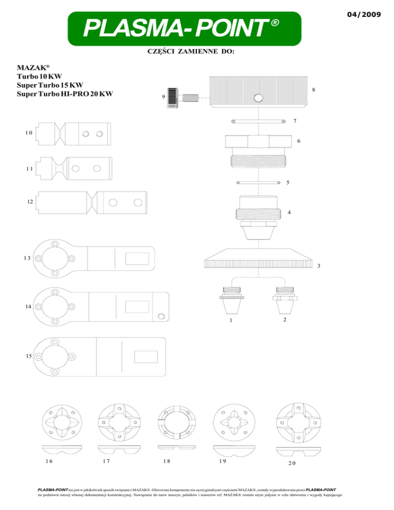 PLASMA- POINT 04/2009 ® CZĘŚCI ZAMIENNE DO: MAZAK® Turbo 10 KW Super Turbo 15 KW Super Turbo HI-PRO 20 KW 8 9 7 10 6 11 5 12 4 13 3 14 1 2 12345678901234567890 12345678901234567890 12345678901234567890 12345678901234567890 12345678901234567890 12345678901234567890 12345678901234567890 12345678901234567890 12345678901234567890 12345678901234567890 12345678901234567890 12345678901234567890 12345678901234567890 15 16 17 18 19 22 00 PLASMA-POINT nie jest w jakikolwiek sposób związana z MAZAK®. Oferowane komponenty nie są oryginalnymi częściami MAZAK®, zostały wyprodukowane przez PLASMA-POINT na podstawie naszej własnej dokumentacji konstrukcyjnej. Nawiązanie do nazw maszyn, palników i numerów ref. MAZAK® zostalo użyte jedynie w celu ułatwienia i wygody kupującego. PLASMA- POINT ® 04/2009 CZĘŚCI ZAMIENNE DO: MAZAK® Turbo 10 KW Super Turbo 15 KW Super Turbo HI-PRO 20 KW Poz. Numer ref. 1 46606330523 46606330523 46603350508 46603350511 46603350512 46603350515 46603350517 46603350520 46603350522 46603350525 46603350530 ------------------------------------------------------------------------------------------------------------------------------46683300030 46603350510 ------------------46523300080 46603350001 46603350002 46603300032 36682300280 36572300101 36602300550 36602300560 36602300580 36602350020 46572301043 46572301045 46512300520 46572301041 46602350080 46683301841 2 3 4 5 6 7 8 9 10 11 12 13 14 15 16 17 18 19 20 N/S Kod (std.) Kod (chrom.) Opis 46606330523 46606330523.15 46603350508 46603350511 46603350512 46603350520 46603350517 46603350522 46603350523 46603350525 46603350530 4660335052A 4660335052B 4660335052F 4660335052C 4660335052G 4660335052D 4660335052E ----------------------------------------46603350508C 46603350511C 46603350512C 46603350520C 46603350517C 46603350522C 46603350523C 46603350525C 46603350530C 4660335052A/C 4660335052B/C 4660335052F/C 4660335052C/C 4660335052G/C 4660335052D/C 4660335052E/C Dysza ø 0.8mm. - prysznic Dysza ø 1.5mm. - prysznic Dysza ø 0.8mm. Dysza ø 1.0mm. Dysza ø 1.2mm. Dysza ø 1.5mm. Dysza ø 1.7mm. Dysza ø 2.0mm. Dysza ø 2.2mm. Dysza ø 2.5mm. Dysza ø 3.0mm. Dysza podwójna ø 1,2mm. Dysza podwójna ø 1,5mm. Dysza podwójna ø 1,8mm. Dysza podwójna ø 2,0mm. Dysza podwójna ø 2,2mm. Dysza podwójna ø 2,5mm. Dysza podwójna ø 3,0mm. 46683300030 46603350510 46603350003 46523300080 46603350001 46683300930 46603300032 36682300280 36572300101 36602300550 36602300560 36602300580 36602350020 46572301043 46572301045 46512300520 46572301041 46602350080 46683301841 -------------------------------------------------------------------------------------------------------------------------------------- Dławica Adapter dyszy O-Ring ø 22x1.5 - (opak.10 szt.) cena za sztukę Baza O-Ring ø 31x2 - (opak.10 szt.) cena za sztukę Pierścień Śruba M5x0.5 - (opak.4 szt.) cena za sztukę Cięgno regulacyjne 60 mm. Cięgno regulacyjne 61 mm. Cięgno regulacyjne 89 mm. Ramie igielne Ramie igielne Ramie igielne Stopka igielna - stal 9 mm Stopka igielna - teflon 9 mm Stopka igielna - mosiądz 4 mm Stopka igielna - mosiądz 12 mm Stopka igielna - mosiądz 9 mm Osłona teflonowa PLASMA-POINT nie jest w jakikolwiek sposób związana z MAZAK®. Oferowane komponenty nie są oryginalnymi częściami MAZAK®, zostały wyprodukowane przez PLASMA-POINT na podstawie naszej własnej dokumentacji konstrukcyjnej. Nawiązanie do nazw maszyn, palników i numerów ref. MAZAK® zostalo użyte jedynie w celu ułatwienia i wygody kupującego..