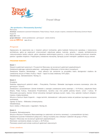 Travel Shop „Na spotkanie z Warszawską Syrenką” Warszawa Atrakcje: zwiedzanie Łazienek Królewskich, Pałac Kultury i Nauki, wizyta w sejmie, zwiedzanie Warszawy,Centrum Nauki Kopernik ilość dni: 3 dni grupa wiekowa: - szkoła podstawowa - gimnazjum - szkoła średnia cena od: 525 PLN (przy 45 os.) Program Zapraszamy do zapoznania się z miastem pełnym kontrastów, gdzie budowle historyczne sąsiadują z nowoczesną architekturą, gdzie po wojennych zniszczeniach zabytkowe pałace, kościoły, gmachy i zespoły architektoniczne zrekonstruowano bardzo wiernie, gdzie zabudowa wielkomiejska graniczy z dużą ilością otwartej przestrzeni skwerów, parków i ogrodów miejskich. Proponujemy zwiedzenie niezwykłej, tętniącej życiem metropolii i poddanie się jej urokowi. PROGRAM RAMOWY: Dzień 1 Wyjazd w godzinach porannych. Przyjazd do Warszawy we wczesnych godzinach popołudniowych. Zwiedzanie pięknego założenia pałacowo – parkowego w Wilanowie w formie lekcji muzealnych. Zwiedzanie Stadionu Narodowego – trasa piłkarza lub zamiennie (w przypadku braku dostępności stadionu do zwiedzania) wizyta w Pałacu Kultury i Nauki – wjazd na taras widokowy XXX piętro. Obiadokolacja. Zakwaterowanie. Nocleg (1). Dzień 2 Śniadanie. Siedziba najwyższych polskich władz – Prezydenta, Premiera i Belweder (wymagana wczesna rezerwacja, tylko dla gimnazjum i liceum). Zwiedzanie z przewodnikiem: Zamek Królewski z zewnątrz (zwiedzanie zamku wewnątrz + 15 PLN/os), zabytkowe Stare Miasto, Pałac Kultury, Krakowskie Przedmieście, Syrenka oraz inne perełki polskiej historii, sztuki i kultury. W Warszawie poczujemy również klimat kulturalnej metropolii tętniącej życiem: teatry, kina, splendor modnych sklepów i imprezy międzynarodowe. Wizyta w Centrum Nauki Kopernik – magia techniki, doświadczeń i odkrywania świata od podstaw (wymagana wczesna rezerwacja). Ogrody na Dachu – Biblioteka Uniwersytecka. Obiadokolacja. Quizz wiedzy o Warszawie z nagrodami. Nocleg (2). Dzień 3 Śniadanie. Wykwaterowanie. Wizyta w Muzeum Powstania Warszawskiego (w zależności od terminu rezerwacji –z przewodnikiem lub bez). Zwiedzanie Łazienek Królewskich połączone z lekcją muzealną oraz ciekawym zadaniem dla grupy w Parku. Wyjazd z Warszawy we wczesnych godzinach popołudniowych. Możliwość zamówienia obiadu na trasie (+ 20 PLN/os). Planowany powrót pod szkołę w późnych godzinach wieczornych. Cena zawiera Wygenerowane w systemie TravelShop 1/2 07-03-2017 20:25:14 Transport, 2 noclegi, 2 śniadania, 2 obiadokolacje, realizację programu , bilety wstępu do atrakcji wymienionych w programie, przewodnika miejskiego w Warszawie, opiekę i komentarz pilota Travel Shop, miejsca gratis dla 4 Opiekunów (przy 45 uczestnikach), ubezpieczenie NNW i KL, podatek VAT. CENA NIE ZAWIERA: Możliwość odwiedzenia Muzeum Historii Żydów Polskich – zwiedzanie z przewodnikiem + ok. 6 PLN/os. Ewentualnego obiadu w drodze powrotnej +20 PLN/os. Zwiedzanie Telewizji – tylko przy wczesnej rezerwacji + ok. 17 zł/os. Kolejność zwiedzania może ulec zmianie – wszelkie potencjalne zmiany wprowadzone będą po konsultacji z grupą Dodatkowe informacje Cena kalkulowana jest dla grup liczących 45 Uczestników, wyjeżdżających ze Szczecina. Kalkulacja dla konkretnej grupy (inna liczba uczestników, miejsce wyjazdu) na życzenie Klienta. Treść oferty nie stanowi oferty handlowej w rozumieniu art 66 § 1 kodeksu cywilnego oraz innych właściwych przepisów prawnych. Wygenerowane w systemie TravelShop 2/2 07-03-2017 20:25:14