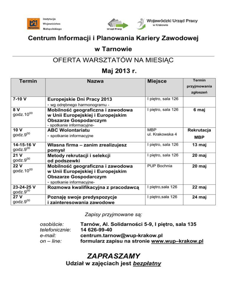 Centrum Informacji i Planowania Kariery Zawodowej w Tarnowie OFERTA WARSZTATÓW NA MIESIĄC Maj 2013 r. Termin Nazwa Miejsce Termin przyjmowania zgłoszeń 7-10 V 8V godz.1000 Europejskie Dni Pracy 2013 - wg odrębnego harmonogramu Mobilność geograficzna i zawodowa w Unii Europejskiej i Europejskim Obszarze Gospodarczym I piętro, sala 126 I piętro, sala 126 6 maj - spotkanie informacyjne- 10 V godz.900 ABC Wolontariatu - spotkanie informacyjne MBP ul. Krakowska 4 Rekrutacja 14-15-16 V godz.900 21 V godz.900 22 V godz.1000 Własna firma – zanim zrealizujesz pomysł Metody rekrutacji i selekcji od podszewki Mobilność geograficzna i zawodowa w Unii Europejskiej i Europejskim Obszarze Gospodarczym - spotkanie informacyjneRozmowa kwalifikacyjna z pracodawcą I piętro, sala 126 13 maj I piętro, sala 126 20 maj PUP Bochnia 20 maj I piętro,sala 126 22 maj Poznaję swoje predyspozycje i zainteresowania zawodowe I piętro,sala 126 24 maj 23-24-25 V godz.900 27 V godz.900 MBP Zapisy przyjmowane są: osobiście: telefonicznie: e-mail: on – line: Tarnów, Al. Solidarności 5-9, I piętro, sala 135 14 626-99-40 [email protected] formularz zapisu na stronie www.wup–krakow.pl ZAPRASZAMY Udział w zajęciach jest bezpłatny