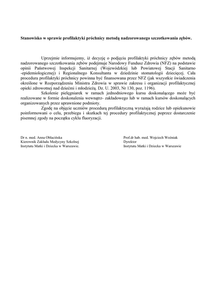 Stanowisko w sprawie profilaktyki próchnicy metodą nadzorowanego szczotkowania zębów. Uprzejmie informujemy, iż decyzję o podjęciu profilaktyki próchnicy zębów metodą nadzorowanego szczotkowania zębów podejmuje Narodowy Fundusz Zdrowia (NFZ) na podstawie opinii Państwowej Inspekcji Sanitarnej (Wojewódzkiej lub Powiatowej Stacji Sanitarno -epidemiologicznej) i Regionalnego Konsultanta w dziedzinie stomatologii dziecięcej. Cała procedura profilaktyki próchnicy powinna być finansowana przez NFZ (jak wszystkie świadczenia określone w Rozporządzeniu Ministra Zdrowia w sprawie zakresu i organizacji profilaktycznej opieki zdrowotnej nad dziećmi i młodzieżą. Dz. U. 2003, Nr 130, poz. 1196). Szkolenie pielęgniarek w ramach jednodniowego kursu doskonalącego może być realizowane w formie doskonalenia wewnątrz- zakładowego lub w ramach kursów doskonalących organizowanych przez uprawnione podmioty. Zgodę na objęcie uczniów procedurą profilaktyczną wyrażają rodzice lub opiekunowie poinformowani o celu, przebiegu i skutkach tej procedury profilaktycznej poprzez dostarczenie pisemnej zgody na początku cyklu fluoryzacji. Dr n. med. Anna Oblacińska Kierownik Zakładu Medycyny Szkolnej Instytutu Matki i Dziecka w Warszawie. Prof.dr hab. med. Wojciech Woźniak Dyrektor Instytutu Matki i Dziecka w Warszawie