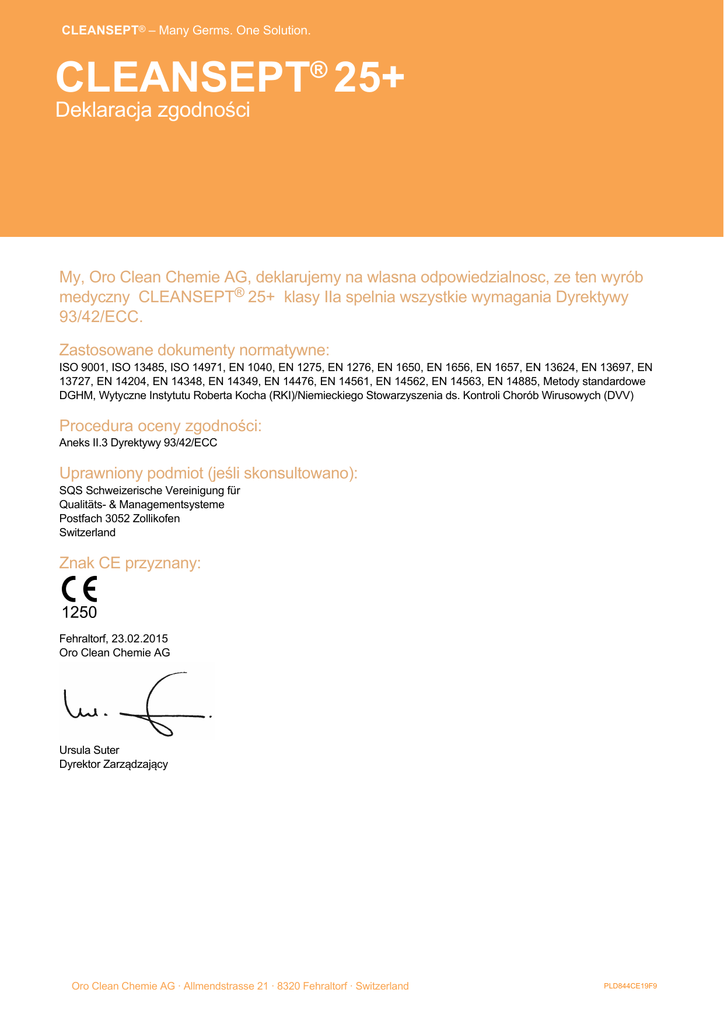 CLEANSEPT® – Many Germs. One Solution. CLEANSEPT® 25+ Deklaracja zgodności My, Oro Clean Chemie AG, deklarujemy na wlasna odpowiedzialnosc, ze ten wyrób medyczny CLEANSEPT® 25+ klasy IIa spelnia wszystkie wymagania Dyrektywy 93/42/ECC. Zastosowane dokumenty normatywne: ISO 9001, ISO 13485, ISO 14971, EN 1040, EN 1275, EN 1276, EN 1650, EN 1656, EN 1657, EN 13624, EN 13697, EN 13727, EN 14204, EN 14348, EN 14349, EN 14476, EN 14561, EN 14562, EN 14563, EN 14885, Metody standardowe DGHM, Wytyczne Instytutu Roberta Kocha (RKI)/Niemieckiego Stowarzyszenia ds. Kontroli Chorób Wirusowych (DVV) Procedura oceny zgodności: Aneks II.3 Dyrektywy 93/42/ECC Uprawniony podmiot (jeśli skonsultowano): SQS Schweizerische Vereinigung für Qualitäts & Managementsysteme Postfach 3052 Zollikofen Switzerland Znak CE przyznany: Fehraltorf, 23.02.2015 Oro Clean Chemie AG Ursula Suter Dyrektor Zarządzający Oro Clean Chemie AG · Allmendstrasse 21 · 8320 Fehraltorf · Switzerland PLD844CE19F9