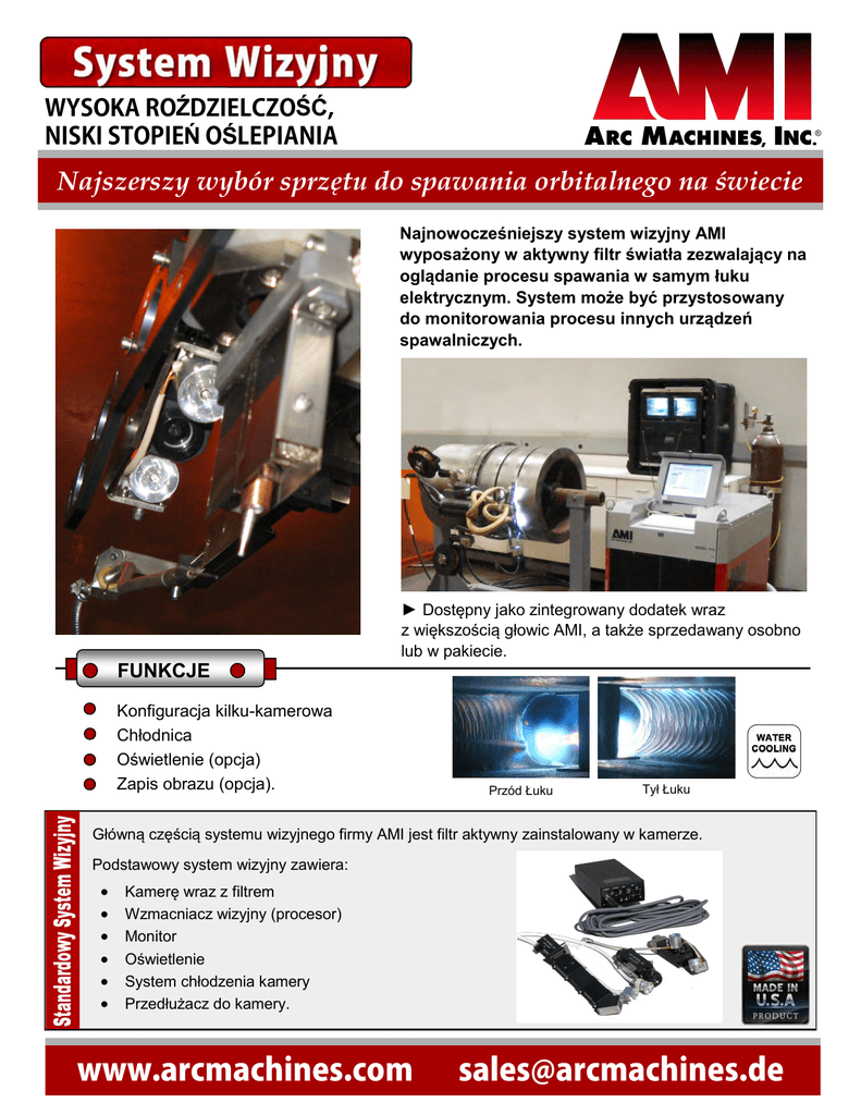 Ź Ń Ś ŚĆ Najszerszy wybór sprzętu do spawania orbitalnego na świecie Najnowocześniejszy system wizyjny AMI wyposażony w aktywny filtr światła zezwalający na oglądanie procesu spawania w samym łuku elektrycznym. System może być przystosowany do monitorowania procesu innych urządzeń spawalniczych. ► Dostępny jako zintegrowany dodatek wraz z większością głowic AMI, a także sprzedawany osobno lub w pakiecie. FUNKCJE Konfiguracja kilku-kamerowa Chłodnica Oświetlenie (opcja) Zapis obrazu (opcja). Przód Łuku Tył Łuku Główną częścią systemu wizyjnego firmy AMI jest filtr aktywny zainstalowany w kamerze. Podstawowy system wizyjny zawiera: Kamerę wraz z filtrem Wzmacniacz wizyjny (procesor) Monitor Oświetlenie System chłodzenia kamery Przedłużacz do kamery. WYPOSAŻENIE KAMERY Kamera CCD wyposażona jest w system geometrii wizji przystosowanej do danej aplikacji. Filtr optyczny o określonej długości fali świetlnej. Obiektyw powiększający obraz obszaru spawu. Obudowę kamery chłodzoną wodą. System optyki i filtracji światła. Zestawy optyki do konkretnych aplikacji ► System optyczny AMI wyposażony jest w aktywny filtr światła i nie wymaga dodatkowej automatyki kontrolującej obraz. ► Elektroniczna przysłona zezwala na automatyczną kontrolę jasności obrazu. SYSTEM KAMER AMI oferuje szeroki wachlarz kamer i optyki. Selekcja uzależniona jest od konkretnej aplikacji (zastosowania), np.: Odległości kamery od spawu, pozycji kamery do łuku. Wielkości powierzchni obserwowanej. Rodzaju gazu spawalniczego. Rodzaju palnika (kształtu) i odległości od spawu. System Wizyjny współpracujący ze Źródłem Prądu Model 415 i Głowicą Model 52. Liderzy i Innowatorzy w Dziedzinie Automatycznego Spawania Orbitalnego Więcej informacji znajdą Państwo na naszej stronie www lub dzwoniąc do naszego biura w Niemczech SIEDZIBA FIRMY Arc Machines, Inc. ODDZIAŁ W EUROPIE Arc Machines, Inc. BIURO W NIEMCZECH Arc Machines GmbH 10500 Orbital Way Pacoima, CA 91331 U.S.A. Tel: +1 / 818 / 896 / 9556 Fax: +1 / 818 / 890 / 3724 [email protected] Chemin du Lavasson 2, CH-1196 Gland, Szwajcaria Tel: +41 / 22 / 995 / 0051 Fax: +41 / 22 / 995 / 0059 [email protected] Markelsbach 2 D-53804 Much, Niemcy Tel: +49 / 2245 / 91680 Fax: +49 / 2245 / 916868 [email protected] MKT DVS / April, 2012 / PL BIURO W ANGLII Arc Machines UK Limited Unit 2 Lamport Court Heartlands Business Park Daventry, NN11 8UF, UK Tel: +44 / 1327 / 312787 Fax: +44 / 1327 / 315034 [email protected]