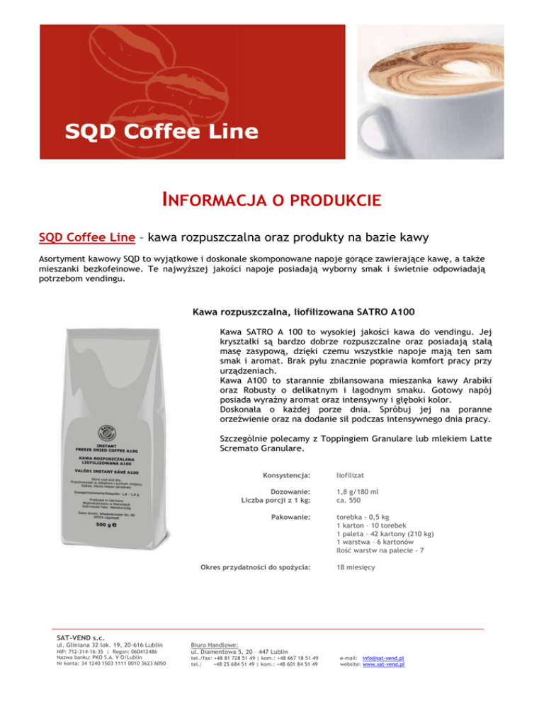 INFORMACJA O PRODUKCIE SQD Coffee Line – kawa rozpuszczalna oraz produkty na bazie kawy Asortyment kawowy SQD to wyjątkowe i doskonale skomponowane napoje gorące zawierające kawę, a także mieszanki bezkofeinowe. Te najwyższej jakości napoje posiadają wyborny smak i świetnie odpowiadają potrzebom vendingu. Kawa rozpuszczalna, liofilizowana SATRO A100 Kawa SATRO A 100 to wysokiej jakości kawa do vendingu. Jej kryształki są bardzo dobrze rozpuszczalne oraz posiadają stałą masę zasypową, dzięki czemu wszystkie napoje mają ten sam smak i aromat. Brak pyłu znacznie poprawia komfort pracy przy urządzeniach. Kawa A100 to starannie zbilansowana mieszanka kawy Arabiki oraz Robusty o delikatnym i łagodnym smaku. Gotowy napój posiada wyraźny aromat oraz intensywny i głęboki kolor. Doskonała o każdej porze dnia. Spróbuj jej na poranne orzeźwienie oraz na dodanie sił podczas intensywnego dnia pracy. Szczególnie polecamy z Toppingiem Granulare lub mlekiem Latte Scremato Granulare. Konsystencja: Dozowanie: Liczba porcji z 1 kg: Pakowanie: Okres przydatności do spożycia: liofilizat 1,8 g/180 ml ca. 550 torebka - 0,5 kg 1 karton – 10 torebek 1 paleta – 42 kartony (210 kg) 1 warstwa – 6 kartonów Ilość warstw na palecie - 7 18 miesięcy SAT-VEND s.c. ul. Gliniana 32 lok. 19, 20-616 Lublin NIP: 712-314-16-35 | Regon: 060412486 Nazwa banku: PKO S.A. V O/Lublin Nr konta: 34 1240 1503 1111 0010 3623 6050 Biuro Handlowe: ul. Diamentowa 5, 20 – 447 Lublin tel./fax: +48 81 728 51 49 | kom.: +48 667 18 51 49 tel.: +48 25 684 51 49 | kom.: +48 601 84 51 49 e-mail: [email protected] website: www.sat-vend.pl