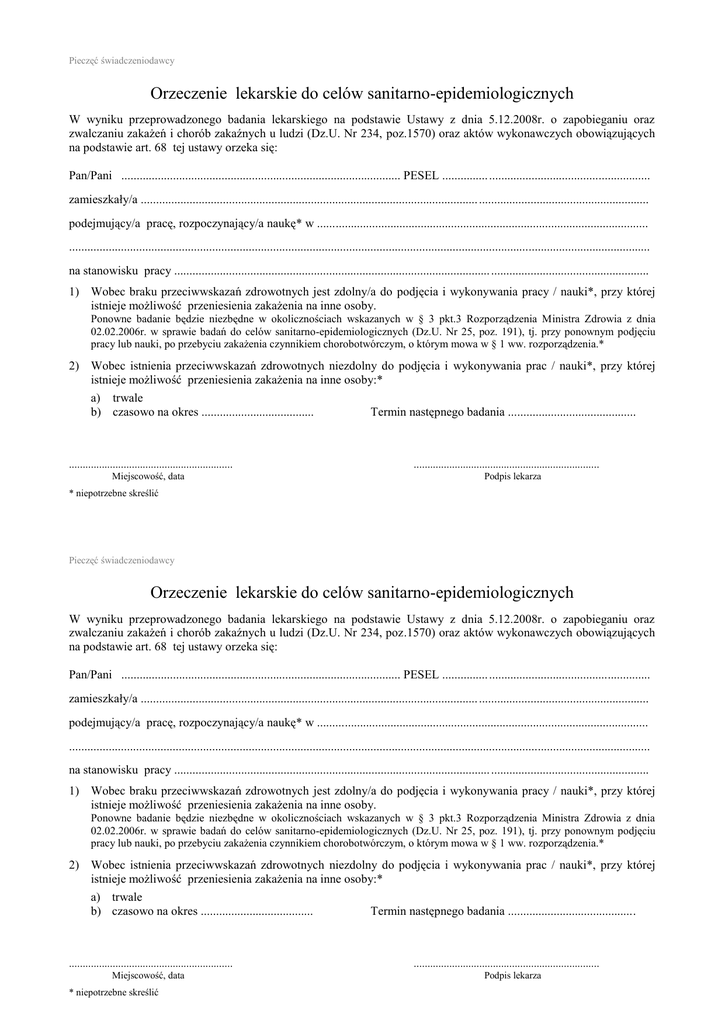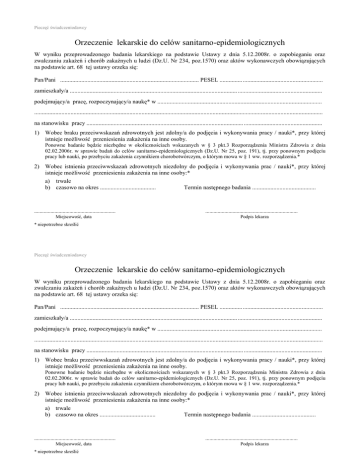 Pieczęć świadczeniodawcy Orzeczenie lekarskie do celów sanitarno-epidemiologicznych W wyniku przeprowadzonego badania lekarskiego na podstawie Ustawy z dnia 5.12.2008r. o zapobieganiu oraz zwalczaniu zakażeń i chorób zakaźnych u ludzi (Dz.U. Nr 234, poz.1570) oraz aktów wykonawczych obowiązujących na podstawie art. 68 tej ustawy orzeka się: Pan/Pani ............................................................................................ PESEL .................................................................... zamieszkały/a ............................................................................................................... ........................................................ podejmujący/a pracę, rozpoczynający/a naukę* w ............................................................................................................. ............................................................................................................................................................................................... na stanowisku pracy ........................................................................................................ .................................................... 1) Wobec braku przeciwwskazań zdrowotnych jest zdolny/a do podjęcia i wykonywania pracy / nauki*, przy której istnieje możliwość przeniesienia zakażenia na inne osoby. Ponowne badanie będzie niezbędne w okolicznościach wskazanych w § 3 pkt.3 Rozporządzenia Ministra Zdrowia z dnia 02.02.2006r. w sprawie badań do celów sanitarno-epidemiologicznych (Dz.U. Nr 25, poz. 191), tj. przy ponownym podjęciu pracy lub nauki, po przebyciu zakażenia czynnikiem chorobotwórczym, o którym mowa w § 1 ww. rozporządzenia.* 2) Wobec istnienia przeciwwskazań zdrowotnych niezdolny do podjęcia i wykonywania prac / nauki*, przy której istnieje możliwość przeniesienia zakażenia na inne osoby:* a) trwale b) czasowo na okres ..................................... ............................................................ Miejscowość, data Termin następnego badania .......................................... .................................................................... Podpis lekarza * niepotrzebne skreślić Pieczęć świadczeniodawcy Orzeczenie lekarskie do celów sanitarno-epidemiologicznych W wyniku przeprowadzonego badania lekarskiego na podstawie Ustawy z dnia 5.12.2008r. o zapobieganiu oraz zwalczaniu zakażeń i chorób zakaźnych u ludzi (Dz.U. Nr 234, poz.1570) oraz aktów wykonawczych obowiązujących na podstawie art. 68 tej ustawy orzeka się: Pan/Pani ............................................................................................ PESEL .................................................................... zamieszkały/a ............................................................................................................... ........................................................ podejmujący/a pracę, rozpoczynający/a naukę* w ............................................................................................................. ............................................................................................................................................................................................... na stanowisku pracy ........................................................................................................ .................................................... 1) Wobec braku przeciwwskazań zdrowotnych jest zdolny/a do podjęcia i wykonywania pracy / nauki*, przy której istnieje możliwość przeniesienia zakażenia na inne osoby. Ponowne badanie będzie niezbędne w okolicznościach wskazanych w § 3 pkt.3 Rozporządzenia Ministra Zdrowia z dnia 02.02.2006r. w sprawie badań do celów sanitarno-epidemiologicznych (Dz.U. Nr 25, poz. 191), tj. przy ponownym podjęciu pracy lub nauki, po przebyciu zakażenia czynnikiem chorobotwórczym, o którym mowa w § 1 ww. rozporządzenia.* 2) Wobec istnienia przeciwwskazań zdrowotnych niezdolny do podjęcia i wykonywania prac / nauki*, przy której istnieje możliwość przeniesienia zakażenia na inne osoby:* a) trwale b) czasowo na okres ..................................... Termin następnego badania .......................................... ............................................................ Miejscowość, data * niepotrzebne skreślić .................................................................... Podpis lekarza
