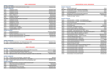 SPORT SAMOCHODOWY IMPREZY CENTRALNE 09 – 10.04. lub 07-08.05 XVI Grand Prix Fiat Auto Poland IMPREZY OKRĘGOWE 23.01. SUPEROES I Runda 20.02. SUPEROES II Runda 27.03. SUPEROES III Runda 24.04. SUPEROES IV Runda 8-9.05. STAR – TOUR 4 x 4 16.05. STAROES I Eliminacja 22.05. SUPEROES V Runda 28-29.05 III Kazimierski Rajd Pojazdów Terenowych 19.06. SUPEROES VI Runda 17.07. SUPEROES VII Runda 21.08. SUPEROES VIII Runda 12.09. STAROES II Eliminacja 18.09. SUPEROES IX Runda 16.10. SUPEROES X Runda FINAŁ 11.11. PUCHAR JESIENI – SUPEROES 11.12. ‘’SUPERBARBÓRKA 2010” IMPREZY KLUBOWE 17.01. Poślizg Kontrolowany 17.02 Poślizg Kontrolowany 06.03. Sportowa Jazda Sprawnościowa Pao 08.05. Sportowa Jazda Sprawnościowa „U Hutników” 09.05. Sportowa Jazda Sprawnościowa Pao SPORT KARTINGOWY IMPREZY CENTRALNE 05 – 07.08. Poland Championship + VII, VIII Runda Pucharu ROK 27 – 28.08. VII, VIII Runda Puchar Easykart + Easykart 50 SPORT POPULARNY IMPREZY CENTRALNE 22 - 23.05. VII Rajd Pojazdów Zabytkowych Szlakiem Republiki Partyzanckiej 12 - 13.06. VII Świętokrzyski Rajd Pojazdów Zabytkowych 19 - 20.06. Najstarsze Pojazdy Świata Szlakiem WAZY z Bronocic 25 - 27.06. Ogólnopolski Zlot „XXX Caravaningowe Świętojanki” 2010 i II El. OKC PZM IMPREZY OKRĘGOWE 23 – 25.07. Okręgowy Zlot Caravaningowy „Wąchock 2010” 20 – 22.08. XII Caravaningowy Zlot „Nad Kamienną” - Koło Sabat 24 – 26.09. Okręgowy Zlot „Zakooczenie Sezonu Caravaningowego 2010” IMPREZY KLUBOWE 16.05. Rajd Samochodowy „Poznajemy Zabytki Świętokrzyskie” 30.05 Mistrz Kierownicy Samorządowców 29.08. Zakooczenie lata 11.09. Jazda Sprawnościowa z Przyczepą 24.07. Caravaningowcy – Zmotoryzowanym BEZPIECZEŃSTWO RUCHU DROGOWEGO Miedzian Góra Miedziana Góra Miedziana Góra Miedziana Góra Miedziana Góra Starachowice Starachowice Miedziana Góra Kazimierza Wielka Miedziana Góra Miedziana Góra Miedziana Góra Starachowice Miedziana Góra Miedziana Góra Miedziana Góra Miedziana Góra Kazimierza Wielka Skarżysko Kam Skarżysko Kam. Ostrowiec Św. Ostrowiec Św. Miedziana Góra Miedziana Góra Kazimierza Wielka Kielce Kazimierza Wielka Miedziana Góra Wąchock Skarżysko Kam. Miedziana Góra Skarżysko Kam. Starachowice Kazimierza Wielka Skarżysko Kam. Miedziana Góra IMPREZY OKRĘGOWE 13.02 „Ratowad każdy może” 06-07.05. Turniej wiedzy o BRD – eliminacje wojewódzkie 15.05. Turniej Motoryzacyjny – eliminacje wojewódzkie 19.06. „I Ty możesz pomóc” 26.06. Okręgowe Mistrzostwa Ratowników Drogowych 10.10. Turniej Miast „Caruso Kierownicy 2010” 20.11. “Bezpieczna droga” konkurs Kielce Kielce Kielce Kielce Miedziana Góra Starachowice Kielce IMPREZY KLUBOWE 19.02. „Pierwsza pomoc – to łatwe” - dla młodzieży gimn. 26.02. „Pierwsza pomoc – to łatwe” - dla młodzieży ponadgimn. 06.03. Caruso Kierownicy Pao 19.03. „Na ratunek” - Konkurs BRD dla młodzieży 27.03. Caruso Kierownicy 08.04. Turniej BRD – etap gminny-miejski 10.04. Caruso Kierownicy 2010 - I Eliminacja 16.04. Konkurs wiedzy o BRD dla młodzieży gimn. 16.04. Turniej BRD – etap powiatowy (szk. Podst. I gimn.) 21.04. Młodzieżowy Turniej Motoryzacyjny – etap powiat.(szk.p-gimn.) 23.04. Konkurs wiedzy o BRD dla młodzieży ponadgimn. 29.05 Caruso Kierownicy 2010 - II Eliminacja 30.05. “Stop dziecko na drodze” - konkurs dla dziec. 01.06. Kryterium Młodego Rowerzysty 06.06. Caruso Kierownicy 2010 - I Eliminacja 12.06. Caruso Kierownicy 2010 - III Eliminacja 13.06. Konkurs Sportowy Bezpieczne Wakacje 18.06. Letnie Kryterium Rowerowe 05.09. Bezpieczna droga do szkoły 10.09. Sportowy Konkurs Sprawnościowy Młodego Kierowcy 11.09. Caruso Kierownicy 2010 - IV Eliminacja + Finał 19.09. Caruso Kierownicy 2010 - II Eliminacja 19.09. Caruso Kierownicy 2010- I Eliminacja 26.09. Caruso Kierownicy 2010 - II Eliminacja 26.09. Caruso Kierownicy 2010 - III Eliminacja 03.10. Caruso Kierownicy 2010 - III Eliminacja 10.10. Samochodowy Turniej Szkół Średnich Kielce Kielce Kielce Kielce Skarżysko Starachowice Kielce Kielce Starachowice Starachowice Kielce Miedziana Góra Skarżysko Kam. Starachowice Ostrowiec Św. Kielce Ostrowiec Św. Starachowice Ostrowiec Św. Ostrowiec Św. Miedziana Góra Ostrowiec Św. Starachowice Starachowice Ostrowiec Św. Starachowice Ostrowiec Św.