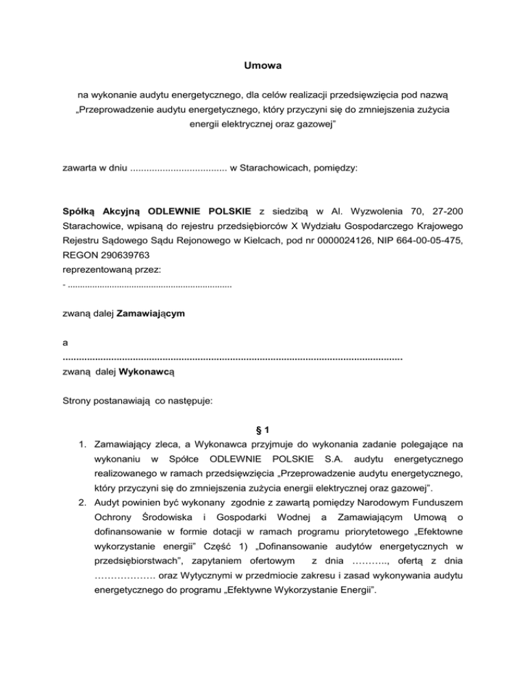 Umowa na wykonanie audytu energetycznego, dla celów realizacji przedsięwzięcia pod nazwą „Przeprowadzenie audytu energetycznego, który przyczyni się do zmniejszenia zużycia energii elektrycznej oraz gazowej” zawarta w dniu .................................... w Starachowicach, pomiędzy: Spółką Akcyjną ODLEWNIE POLSKIE z siedzibą w Al. Wyzwolenia 70, 27-200 Starachowice, wpisaną do rejestru przedsiębiorców X Wydziału Gospodarczego Krajowego Rejestru Sądowego Sądu Rejonowego w Kielcach, pod nr 0000024126, NIP 664-00-05-475, REGON 290639763 reprezentowaną przez: - ................................................................... zwaną dalej Zamawiającym a .............................................................................................................................. zwaną dalej Wykonawcą Strony postanawiają co następuje: §1 1. Zamawiający zleca, a Wykonawca przyjmuje do wykonania zadanie polegające na wykonaniu w Spółce ODLEWNIE POLSKIE S.A. audytu energetycznego realizowanego w ramach przedsięwzięcia „Przeprowadzenie audytu energetycznego, który przyczyni się do zmniejszenia zużycia energii elektrycznej oraz gazowej”. 2. Audyt powinien być wykonany zgodnie z zawartą pomiędzy Narodowym Funduszem Ochrony Środowiska i Gospodarki Wodnej a Zamawiającym Umową o dofinansowanie w formie dotacji w ramach programu priorytetowego „Efektowne wykorzystanie energii” Część 1) „Dofinansowanie audytów energetycznych w przedsiębiorstwach”, zapytaniem ofertowym z dnia ……….., ofertą z dnia ………………. oraz Wytycznymi w przedmiocie zakresu i zasad wykonywania audytu energetycznego do programu „Efektywne Wykorzystanie Energii”. 3. Zakres rzeczowy zadania, o którym mowa w ust.1, obejmuje wykonanie: a) audytu energetycznego procesów technologicznych, b) audytu energetycznego źródeł energii ciepła, energii elektrycznej i chłodu. §2 1. Zamawiający jest zobowiązany do niezwłocznego, jednak nie później niż w ciągu 7 dni od podpisania niniejszej umowy a także na żądanie Wykonawcy, dostarczenia wszelkiej posiadanej dokumentacji, informacji i danych wskazanych przez Wykonawcę koniecznych do wykonania usług świadczonych w ramach Umowy. 2. Wykonawca lub podmiot przez niego upoważniony ma obowiązek weryfikacji danych i informacji uzyskanych od Zamawiającego w drodze bezpośrednich oględzin lub poprzez sprawdzenie dokumentacji technicznej, a Zamawiający na powyższe wyraża zgodę. 3. Wykonawca opiera się na materiałach dostarczonych przez Zamawiającego. W przypadku braku możliwości weryfikacji danych i informacji, o której mowa w ust.2, Wykonawca nie ponosi odpowiedzialności z tytułu niewykonania lub nienależytego wykonania usług, jeżeli szkoda pozostaje w związku z uzyskaniem od Zamawiającego jakiejkolwiek informacji niezgodnej ze stanem faktycznym lub prawnym a także nieotrzymaniem ich w uzgodnionym terminie. §3 1. Wykonawca może podzlecać wykonanie zadań wynikających z niniejszej Umowy osobom, które wskazał w złożonej w dniu …… ofercie na własny koszt i ryzyko. 2. W razie konieczności zlecenia wykonania zadania osobom, które nie zostały ujęte w ofercie, zlecenie może być udzielone po uzyskaniu zgody Zamawiającego . §4 1. Strony postanawiają, iż całość zadań stanowiących Przedmiot umowy wymieniony w § 1 będzie wykonany w terminie do dnia ……………….. 2014 roku. 2. Wykonawca zobowiązuje się przekazać Zamawiającemu przedmiot umowy w trzech egzemplarzach w formie pisemnej i w formie elektronicznej. 3. Wykonanie przedmiotu umowy zostanie stwierdzone podpisaniem przez Strony protokołu odbioru. Protokół odbioru zostanie podpisany po zapoznaniu się z audytem energetycznym i stwierdzeniu jego zgodności z dokumentami, o których mowa w § kompletności. Data podpisania protokołu odbioru jest dniem wykonania przedmiotu umowy przez Wykonawcę. 4. W przypadku stwierdzenia przez Zamawiającego nienależytego wykonania przedmiotu umowy, Wykonawca jest zobowiązany do nieodpłatnego usunięcia wad w terminie 5 dni od daty ich zgłoszenia Wykonawcy. Na wniosek wykonawcy Zamawiający może wyrazić zgodę na usuniecie wad przez Wykonawcę w innym terminie. Po upływie tego terminu Zamawiający będzie mógł domagać się zwrotu poniesionych kosztów na zasadach określonych w § 7. §5 1. Audyt energetyczny zostanie przekazany do Narodowego Funduszu Ochrony Środowiska i Gospodarki Wodnej w celu jego akceptacji. 2. W przypadku stwierdzenia przez Narodowy Fundusz ochrony Środowiska i Gospodarki Wodnej nienależytego wykonania audytu Wykonawca usunie wady w terminie i na zasadach, o których mowa w § 4 ust. 4 ale nie później niż do dnia 10 lipca 2014 roku. 3. W razie zaakceptowania audytu przez Narodowy Fundusz Ochrony Środowiska i Gospodarki Wodnej Strony podpiszą protokół odbioru końcowego. §6 1. Strony za wykonanie przedmiotu zamówienia ustalają wynagrodzenie ryczałtowe w wysokości ……………… zł netto (słownie: …………………………………). 2. Kwota wynagrodzenia, o którym mowa w ust. 2 zostanie powiększona o podatek VAT, według stawki obowiązującej w dniu wystawienia faktury. 3. Wynagrodzenie, o którym mowa w ust. 1 zostanie zapłacone w następujący sposób: a) zaliczka w kwocie ……………………….. płatna w terminie 14 dni od dnia zawarcia umowy, b) kwota …………………………….. płatna w terminie 14 dni od dnia podpisania protokołu odbioru, c) Kwota …………………………….. płatna w terminie 14 dni od dnia otrzymania z NFOŚiGW informacji o zweryfikowaniu i zatwierdzeniu audytu (protokół odbioru końcowego). §7 1. Wykonawca zapłaci Zamawiającemu kary umowne: a) z tytułu odstąpienia od umowy z przyczyn leżących po stronie Wykonawcy w wysokości 20% wartości wynagrodzenia ryczałtowego, o którym mowa w § 5 umowy, b) w razie nieterminowego wykonania umowy z winy