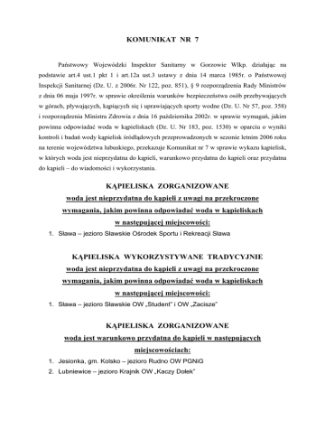 KOMUNIKAT NR 7 Państwowy Wojewódzki Inspektor Sanitarny w Gorzowie Wlkp. działając na podstawie art.4 ust.1 pkt 1 i art.12a ust.3 ustawy z dnia 14 marca 1985r. o Państwowej Inspekcji Sanitarnej (Dz. U. z 2006r. Nr 122, poz. 851), § 9 rozporządzenia Rady Ministrów z dnia 06 maja 1997r. w sprawie określenia warunków bezpieczeństwa osób przebywających w górach, pływających, kąpiących się i uprawiających sporty wodne (Dz. U. Nr 57, poz. 358) i rozporządzenia Ministra Zdrowia z dnia 16 października 2002r. w sprawie wymagań, jakim powinna odpowiadać woda w kąpieliskach (Dz. U. Nr 183, poz. 1530) w oparciu o wyniki kontroli i badań wody kąpielisk śródlądowych przeprowadzonych w sezonie letnim 2006 roku na terenie województwa lubuskiego, przekazuje Komunikat nr 7 w sprawie wykazu kąpielisk, w których woda jest nieprzydatna do kąpieli, warunkowo przydatna do kąpieli oraz przydatna do kąpieli – do wiadomości i wykorzystania. KĄPIELISKA ZORGANIZOWANE woda jest nieprzydatna do kąpieli z uwagi na przekroczone wymagania, jakim powinna odpowiadać woda w kąpieliskach w następującej miejscowości: 1. Sława – jezioro Sławskie Ośrodek Sportu i Rekreacji Sława KĄPIELISKA WYKORZYSTYWANE TRADYCYJNIE woda jest nieprzydatna do kąpieli z uwagi na przekroczone wymagania, jakim powinna odpowiadać woda w kąpieliskach w następującej miejscowości: 1. Sława – jezioro Sławskie OW „Student” i OW „Zacisze” KĄPIELISKA ZORGANIZOWANE woda jest warunkowo przydatna do kąpieli w następujących miejscowościach: 1. Jesionka, gm. Kolsko – jezioro Rudno OW PGNiG 2. Lubniewice – jezioro Krajnik OW „Kaczy Dołek” KĄPIELISKA WYKORZYSTYWANE TRADYCYJNIE woda jest warunkowo przydatna do kąpieli w następującej miejscowości: 1. Uście, gm. Kolsko – jezioro Rudno pole namiotowe KĄPIELISKA ZORGANIZOWANE woda jest przydatna do kąpieli w następujących miejscowościach: 1. Borowy Młyn, gm. Pszczew – jezioro Chłop OW UZZ 2. Bronków, gm. Bobrowice – jezioro Błaszczno OW „Magnolia” 3. Bronków – Kołatka, gm. Bobrowice – jezioro Błaszczno OW „Temar" 4. Chycina, gm. Bledzew – jezioro Chycińskie OW AWF 5. Dąbie – jezioro Wielkie OW „Temar” 6. Długie, gm. Strzelce Krajeńskie – jezioro Lipie 7. Głębokie, gm. Międzyrzecz – jezioro Głębokie OW „Archimedes” 8. Głębokie, gm. Międzyrzecz – jezioro Głębokie OW „Głębokie I” 9. Gościm, gm. Drezdenko – jezioro Soleckie ORW Gościm 10. Gryżyna, gm. Bytnica – jezioro Wapienne OW „Gryżyna” 11. Karnin, gm. Deszczno – wyrobisko pożwirowe 12. Kłodawa – jezioro Kłodawskie PGH „Fenicja” 13. Kosarzyn, gm. Gubin – jezioro Borek OW „Nad Borkiem" 14. Kosarzyn, gm. Gubin – jezioro Borek OW „Leśny" 15. Kosarzyn, gm. Gubin – jezioro Borek OW „Oaza” 16. Lgiń, gm. Wschowa – jezioro Lgiń OSiR Wschowa 17. Lipy, gm. Kłodawa – jezioro Lubie OW „Stilon” 18. Lubiatów, gm. Sława – jezioro Sławskie OW „Sława” 19. Lubikowo, gm. Przytoczna – jezioro Lubikowskie OW „Lubikowo” 20. Lubniewice – jezioro Lubiąż OW „Pod Basztą” 21. Lubniewice – jezioro Lubiąż „Plaża Miejska” 22. Lubniewice – jezioro Lubiąż OW „Stilon” 23. Lubniewice – jezioro Lubiąż OW „ZPS Zielona Góra” 24. Łochowice, gm. Krosno Odrzańskie – jezioro Glibiel 25. Niesulice, gm. Skąpe – jezioro Niesłysz OW MSW 26. Niesulice, gm. Skąpe – jezioro Niesłysz OW „Elterma” 27. Nowa Sól – staw „Koserz” 28. Osiek, gm. Dobiegniew – jezioro Osiek 29. Ostrów, gm. Sulęcin – jezioro Ostrowskie SOKSiR Sulęcin 30. Ośno Lubuskie – jezioro Reczynek ZGKiM w Ośnie Lubuskim 31. Przełazy, gm. Lubrza – jezioro Niesłysz Centrum Promocji i Szkolenia Województwa Lubuskiego 32. Pszczew – jezioro Szarcz Centrum Relaksu 33. Pszczew – jezioro Szarcz OW „Karina” 34. Radzyń, gm. Sława – jezioro Sławskie OW „VICTORIA” 35. Rokitno, gm. Przytoczna – jezioro Rokitniańskie OW „Bielbaw” 36. Różanki, gm. Kłodawa – jezioro Nierzym OSiR Gorzów Wlkp. 37. Świerczów, gm. Lubniewice – jezioro Lubniewsko OW „Laguna” 38. Tarnów Jezierny, gm. Sława – jezioro Tarnowskie Duże OW „Miedziak” 39. Tanów Jezierny, gm. Sława – jezioro Tarnowskie Duże OW „Relaks” 40. Zdroisk, gm. Kłodawa – jezioro Wełmino KĄPIELISKA WYKORZYSTYWANE TRADYCYJNIE woda jest przydatna do kąpieli w następujących miejscowościach: 1. Bobowicko, gm. Międzyrzecz – jezioro Bobowicko 2. Borowy Młyn, gm. Pszczew – jezioro Chłop OW RUCH 3. Bronków, gm. Bobrowice – jezioro Piaseczno 4. Drzecin, gm. Słubice – sztuczny zbiornik „Ranczo” 5. Garbicz, gm. Torzym – jezioro Wielkie Pałac „Magnat” 6. Glinik, gm. Deszczno – jezioro Glinik 7. Głębokie, gm. Międzyrzecz – jezioro Głębokie OW „Głębokie II” 8. Gościm, gm. Drezdenko – jezioro Gostomie kąpielisko Gościraj 9. Grotów, gm. Drezdenko – jezioro Lubowo kąpielisko Grotów ZHP 10. Gryżyce, gm. Żagań – sztuczny zbiornik „Gryżyce” 11. Jodłów, gm. Nowa Sól – jezioro Tarnowskie Duże kąpielisko „Na cyplu” 12. Kęszyca Leśna, gm. Międzyrzecz – jezioro Krzewie 13. Kożuchów – glinianka 14. Krzeczkowo, gm. Lubrza – jezioro Niesłysz „Plaża Borowska” 15. Krzeczkowo, gm. Lubrza – jezioro Niesłysz „Plaża Gminna” 16. Krzeczkowo, gm. Lubrza – jezioro Niesłysz pole namiotowe „POM” 17. Krzeczkowo, gm. Lubrza – jezioro Niesłysz pole namiotowe „Pod Bukami” 18. Linie, gm. Kargowa – jezioro Liny 19. Lubiatów, gm. Sława – jezioro Sławskie OW „Master” 20. Lubiatów, gm. Sława – jezioro Sławskie OW „Sabat” 21. Lubiewo, gm. Drezdenko – jezioro Łubowo 22. Lubogoszcz, gm. Maszewo – jezioro Graniczne 23. Lubrza – jezioro Goszcza OW „Goszcza” 24. Łagów – jezioro Łagowskie OW „Mundi Recra” 25. Łagów – jezioro Trześniowskie „Plaża Gminna” 26. Mironice, 