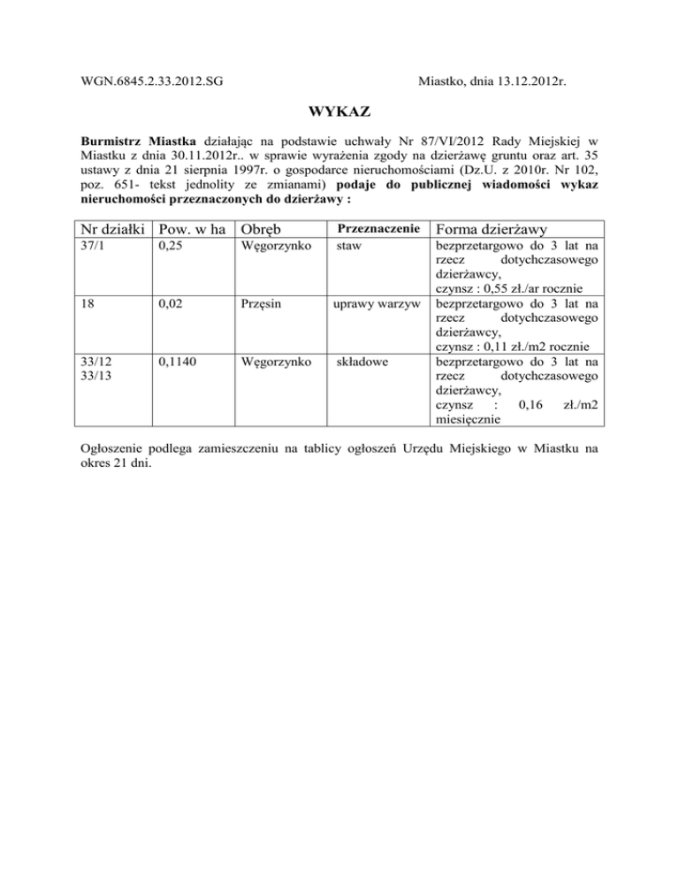 WGN.6845.2.33.2012.SG Miastko, dnia 13.12.2012r. WYKAZ Burmistrz Miastka działając na podstawie uchwały Nr 87/VI/2012 Rady Miejskiej w Miastku z dnia 30.11.2012r.. w sprawie wyrażenia zgody na dzierżawę gruntu oraz art. 35 ustawy z dnia 21 sierpnia 1997r. o gospodarce nieruchomościami (Dz.U. z 2010r. Nr 102, poz. 651- tekst jednolity ze zmianami) podaje do publicznej wiadomości wykaz nieruchomości przeznaczonych do dzierżawy : 37/1 0,25 Węgorzynko Przeznaczenie staw 18 0,02 Przęsin uprawy warzyw 33/12 33/13 0,1140 Węgorzynko składowe Nr działki Pow. w ha Obręb Forma dzierżawy bezprzetargowo do 3 lat na rzecz dotychczasowego dzierżawcy, czynsz : 0,55 zł./ar rocznie bezprzetargowo do 3 lat na rzecz dotychczasowego dzierżawcy, czynsz : 0,11 zł./m2 rocznie bezprzetargowo do 3 lat na rzecz dotychczasowego dzierżawcy, czynsz : 0,16 zł./m2 miesięcznie Ogłoszenie podlega zamieszczeniu na tablicy ogłoszeń Urzędu Miejskiego w Miastku na okres 21 dni.