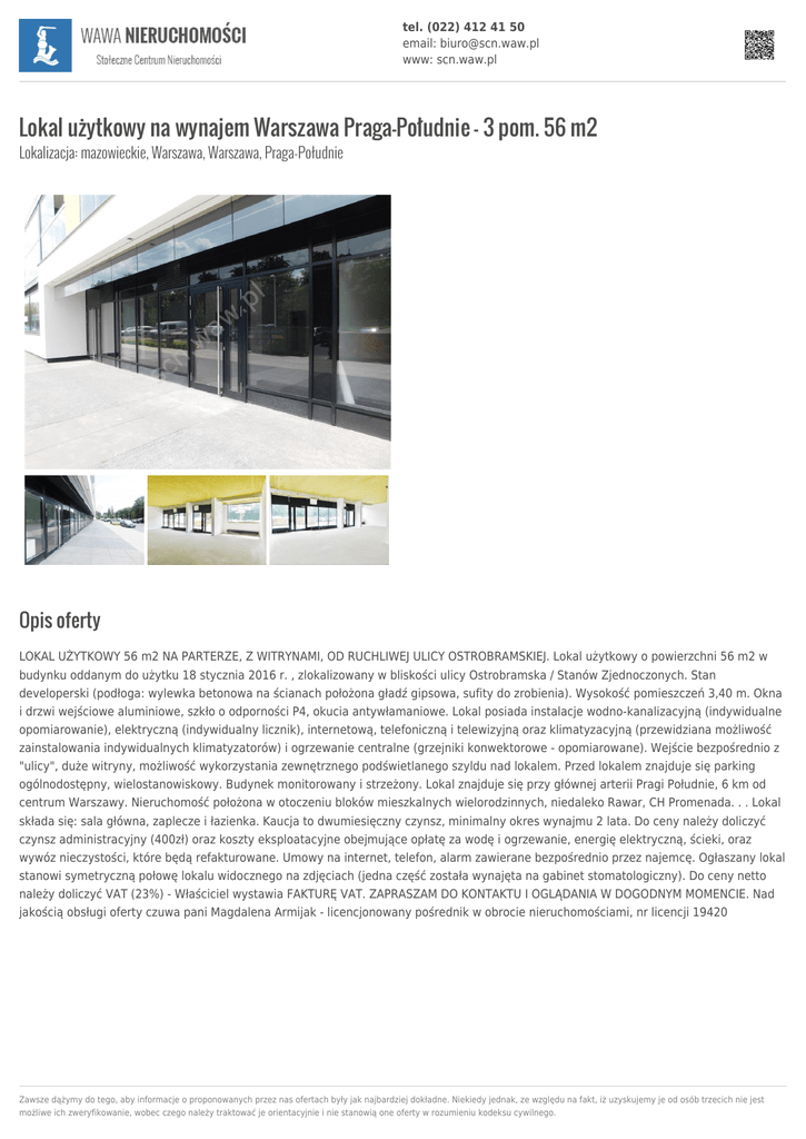 tel. (022) 412 41 50 email: [email protected] www: scn.waw.pl Lokal użytkowy na wynajem Warszawa Praga-Południe - 3 pom. 56 m2 Lokalizacja: mazowieckie, Warszawa, Warszawa, Praga-Południe Opis oferty LOKAL UŻYTKOWY 56 m2 NA PARTERZE, Z WITRYNAMI, OD RUCHLIWEJ ULICY OSTROBRAMSKIEJ. Lokal użytkowy o powierzchni 56 m2 w budynku oddanym do użytku 18 stycznia 2016 r. , zlokalizowany w bliskości ulicy Ostrobramska / Stanów Zjednoczonych. Stan developerski (podłoga: wylewka betonowa na ścianach położona gładź gipsowa, sufity do zrobienia). Wysokość pomieszczeń 3,40 m. Okna i drzwi wejściowe aluminiowe, szkło o odporności P4, okucia antywłamaniowe. Lokal posiada instalacje wodno-kanalizacyjną (indywidualne opomiarowanie), elektryczną (indywidualny licznik), internetową, telefoniczną i telewizyjną oraz klimatyzacyjną (przewidziana możliwość zainstalowania indywidualnych klimatyzatorów) i ogrzewanie centralne (grzejniki konwektorowe - opomiarowane). Wejście bezpośrednio z "ulicy", duże witryny, możliwość wykorzystania zewnętrznego podświetlanego szyldu nad lokalem. Przed lokalem znajduje się parking ogólnodostępny, wielostanowiskowy. Budynek monitorowany i strzeżony. Lokal znajduje się przy głównej arterii Pragi Południe, 6 km od centrum Warszawy. Nieruchomość położona w otoczeniu bloków mieszkalnych wielorodzinnych, niedaleko Rawar, CH Promenada. . . Lokal składa się: sala główna, zaplecze i łazienka. Kaucja to dwumiesięczny czynsz, minimalny okres wynajmu 2 lata. Do ceny należy doliczyć czynsz administracyjny (400zł) oraz koszty eksploatacyjne obejmujące opłatę za wodę i ogrzewanie, energię elektryczną, ścieki, oraz wywóz nieczystości, które będą refakturowane. Umowy na internet, telefon, alarm zawierane bezpośrednio przez najemcę. Ogłaszany lokal stanowi symetryczną połowę lokalu widocznego na zdjęciach (jedna część została wynajęta na gabinet stomatologiczny). Do ceny netto należy doliczyć VAT (23%) - Właściciel wystawia FAKTURĘ VAT. ZAPRASZAM DO KONTAKTU I OGLĄDANIA W DOGODNYM MOMENCIE. Nad jakością obsługi oferty czuwa pani Magdalena Armijak - licencjonowany pośrednik w obrocie nieruchomościami, nr licencji 19420 Zawsze dążymy do tego, aby informacje o proponowanych przez nas ofertach były jak najbardziej dokładne. Niekiedy jednak, ze względu na fakt, iż uzyskujemy je od osób trzecich nie jest możliwe ich zweryfikowanie, wobec czego należy traktować je orientacyjnie i nie stanowią one oferty w rozumieniu kodeksu cywilnego. tel. (022) 412 41 50 email: [email protected] www: scn.waw.pl Lokalizacja Osoba kontaktowa Magdalena Alboszta województwo mazowieckie powiat Warszawa [email protected] miasto Warszawa dzielnica Praga-Południe Chętnie udzielę dodatkowych informacji związanych z tą ofertą. Zapraszam do kontaktu! tel. 509 000 093 Zawsze dążymy do tego, aby informacje o proponowanych przez nas ofertach były jak najbardziej dokładne. Niekiedy jednak, ze względu na fakt, iż uzyskujemy je od osób trzecich nie jest możliwe ich zweryfikowanie, wobec czego należy traktować je orientacyjnie i nie stanowią one oferty w rozumieniu kodeksu cywilnego.