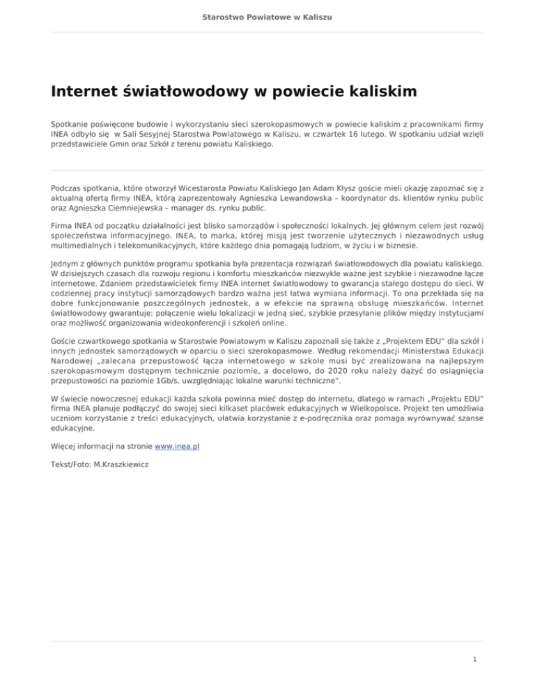 Starostwo Powiatowe w Kaliszu Internet światłowodowy w powiecie kaliskim Spotkanie poświęcone budowie i wykorzystaniu sieci szerokopasmowych w powiecie kaliskim z pracownikami firmy INEA odbyło się w Sali Sesyjnej Starostwa Powiatowego w Kaliszu, w czwartek 16 lutego. W spotkaniu udział wzięli przedstawiciele Gmin oraz Szkół z terenu powiatu Kaliskiego. Podczas spotkania, które otworzył Wicestarosta Powiatu Kaliskiego Jan Adam Kłysz goście mieli okazję zapoznać się z aktualną ofertą firmy INEA, którą zaprezentowały Agnieszka Lewandowska – koordynator ds. klientów rynku public oraz Agnieszka Ciemniejewska – manager ds. rynku public. Firma INEA od początku działalności jest blisko samorządów i społeczności lokalnych. Jej głównym celem jest rozwój społeczeństwa informacyjnego. INEA, to marka, której misją jest tworzenie użytecznych i niezawodnych usług multimedialnych i telekomunikacyjnych, które każdego dnia pomagają ludziom, w życiu i w biznesie. Jednym z głównych punktów programu spotkania była prezentacja rozwiązań światłowodowych dla powiatu kaliskiego. W dzisiejszych czasach dla rozwoju regionu i komfortu mieszkańców niezwykle ważne jest szybkie i niezawodne łącze internetowe. Zdaniem przedstawicielek firmy INEA internet światłowodowy to gwarancja stałego dostępu do sieci. W codziennej pracy instytucji samorządowych bardzo ważna jest łatwa wymiana informacji. To ona przekłada się na dobre funkcjonowanie poszczególnych jednostek, a w efekcie na sprawną obsługę mieszkańców. Internet światłowodowy gwarantuje: połączenie wielu lokalizacji w jedną sieć, szybkie przesyłanie plików między instytucjami oraz możliwość organizowania wideokonferencji i szkoleń online. Goście czwartkowego spotkania w Starostwie Powiatowym w Kaliszu zapoznali się także z „Projektem EDU” dla szkół i innych jednostek samorządowych w oparciu o sieci szerokopasmowe. Według rekomendacji Ministerstwa Edukacji Narodowej „zalecana przepustowość łącza internetowego w szkole musi być zrealizowana na najlepszym szerokopasmowym dostępnym technicznie poziomie, a docelowo, do 2020 roku należy dążyć do osiągnięcia przepustowości na poziomie 1Gb/s, uwzględniając lokalne warunki techniczne”. W świecie nowoczesnej edukacji każda szkoła powinna mieć dostęp do internetu, dlatego w ramach „Projektu EDU” firma INEA planuje podłączyć do swojej sieci kilkaset placówek edukacyjnych w Wielkopolsce. Projekt ten umożliwia uczniom korzystanie z treści edukacyjnych, ułatwia korzystanie z e-podręcznika oraz pomaga wyrównywać szanse edukacyjne. Więcej informacji na stronie www.inea.pl Tekst/Foto: M.Kraszkiewicz 1