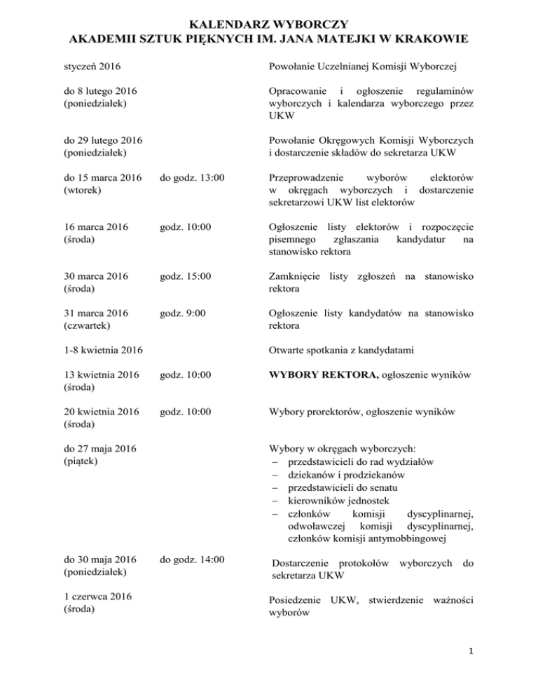 KALENDARZ WYBORCZY AKADEMII SZTUK PIĘKNYCH IM. JANA MATEJKI W KRAKOWIE styczeń 2016 Powołanie Uczelnianej Komisji Wyborczej do 8 lutego 2016 (poniedziałek) Opracowanie i ogłoszenie regulaminów wyborczych i kalendarza wyborczego przez UKW do 29 lutego 2016 (poniedziałek) Powołanie Okręgowych Komisji Wyborczych i dostarczenie składów do sekretarza UKW do 15 marca 2016 (wtorek) do godz. 13:00 Przeprowadzenie wyborów elektorów w okręgach wyborczych i dostarczenie sekretarzowi UKW list elektorów 16 marca 2016 (środa) godz. 10:00 Ogłoszenie listy elektorów i rozpoczęcie pisemnego zgłaszania kandydatur na stanowisko rektora 30 marca 2016 (środa) godz. 15:00 Zamknięcie listy zgłoszeń na stanowisko rektora 31 marca 2016 (czwartek) godz. 9:00 Ogłoszenie listy kandydatów na stanowisko rektora 1-8 kwietnia 2016 Otwarte spotkania z kandydatami 13 kwietnia 2016 (środa) godz. 10:00 WYBORY REKTORA, ogłoszenie wyników 20 kwietnia 2016 (środa) godz. 10:00 Wybory prorektorów, ogłoszenie wyników Wybory w okręgach wyborczych: przedstawicieli do rad wydziałów dziekanów i prodziekanów przedstawicieli do senatu kierowników jednostek członków komisji dyscyplinarnej, odwoławczej komisji dyscyplinarnej, członków komisji antymobbingowej do 27 maja 2016 (piątek) do 30 maja 2016 (poniedziałek) 1 czerwca 2016 (środa) do godz. 14:00 Dostarczenie protokołów wyborczych do sekretarza UKW Posiedzenie UKW, stwierdzenie ważności wyborów 1