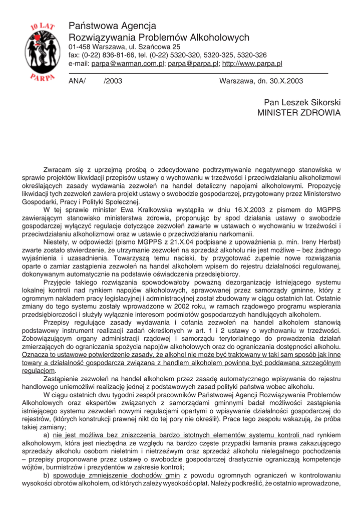 Państwowa Agencja Rozwiązywania Problemów Alkoholowych 01-458 Warszawa, ul. Szańcowa 25 fax: (0-22) 836-81-66, tel. (0-22) 5320-320, 5320-325, 5320-326 e-mail: [email protected]; [email protected]; http://www.parpa.pl ANA/ /2003 Warszawa, dn. 30.X.2003 Pan Leszek Sikorski MINISTER ZDROWIA Zwracam się z uprzejmą prośbą o zdecydowane podtrzymywanie negatywnego stanowiska w sprawie projektów likwidacji przepisów ustawy o wychowaniu w trzeźwości i przeciwdziałaniu alkoholizmowi określających zasady wydawania zezwoleń na handel detaliczny napojami alkoholowymi. Propozycję likwidacji tych zezwoleń zawiera projekt ustawy o swobodzie gospodarczej, przygotowany przez Ministerstwo Gospodarki, Pracy i Polityki Społecznej. W tej sprawie minister Ewa Kralkowska wystąpiła w dniu 16.X.2003 z pismem do MGPPS zawierającym stanowisko ministerstwa zdrowia, proponując by spod działania ustawy o swobodzie gospodarczej wyłączyć regulacje dotyczące zezwoleń zawarte w ustawach o wychowaniu w trzeźwości i przeciwdziałaniu alkoholizmowi oraz w ustawie o przeciwdziałaniu narkomanii. Niestety, w odpowiedzi (pismo MGPPS z 21.X.04 podpisane z upoważnienia p. min. Ireny Herbst) zwarte zostało stwierdzenie, że utrzymanie zezwoleń na sprzedaż alkoholu nie jest możliwe – bez żadnego wyjaśnienia i uzasadnienia. Towarzyszą temu naciski, by przygotować zupełnie nowe rozwiązania oparte o zamiar zastąpienia zezwoleń na handel alkoholem wpisem do rejestru działalności regulowanej, dokonywanym automatycznie na podstawie oświadczenia przedsiębiorcy. Przyjęcie takiego rozwiązania spowodowałoby poważną dezorganizację istniejącego systemu lokalnej kontroli nad rynkiem napojów alkoholowych, sprawowanej przez samorządy gminne, który z ogromnym nakładem pracy legislacyjnej i administracyjnej został zbudowany w ciągu ostatnich lat. Ostatnie zmiany do tego systemu zostały wprowadzone w 2002 roku, w ramach rządowego programu wspierania przedsiębiorczości i służyły wyłącznie interesom podmiotów gospodarczych handlujących alkoholem. Przepisy regulujące zasady wydawania i cofania zezwoleń na handel alkoholem stanowią podstawowy instrument realizacji zadań określonych w art. 1 i 2 ustawy o wychowaniu w trzeźwości. Zobowiązującym organy administracji rządowej i samorządu terytorialnego do prowadzenia działań zmierzających do ograniczania spożycia napojów alkoholowych oraz do ograniczania dostępności alkoholu. Oznacza to ustawowe potwierdzenie zasady, że alkohol nie może być traktowany w taki sam sposób jak inne towary a działalność gospodarcza związana z handlem alkoholem powinna być poddawana szczególnym regulacjom. Zastąpienie zezwoleń na handel alkoholem przez zasadę automatycznego wpisywania do rejestru handlowego uniemożliwi realizację jednej z podstawowych zasad polityki państwa wobec alkoholu. W ciągu ostatnich dwu tygodni zespół pracowników Państwowej Agencji Rozwiązywania Problemów Alkoholowych oraz ekspertów związanych z samorządami gminnymi badał możliwości zastąpienia istniejącego systemu zezwoleń nowymi regulacjami opartymi o wpisywanie działalności gospodarczej do rejestrów, (których konstrukcji prawnej nikt do tej pory nie określił). Prace tego zespołu wskazują, że próba takiej zamiany; a) nie jest możliwa bez zniszczenia bardzo istotnych elementów systemu kontroli nad rynkiem alkoholowym, która jest niezbędna ze względu na bardzo częste przypadki łamania prawa zakazującego sprzedaży alkoholu osobom nieletnim i nietrzeźwym oraz sprzedaż alkoholu nielegalnego pochodzenia – przepisy proponowane przez ustawę o swobodzie gospodarczej drastycznie ograniczają kompetencje wójtów, burmistrzów i prezydentów w zakresie kontroli; b) spowoduje zmniejszenie dochodów gmin z powodu ogromnych ograniczeń w kontrolowaniu wysokości obrotów alkoholem, od których zależy wysokość opłat. Należy podkreślić, że ostatnio wprowadzone, przez ustawę o zatrudnieniu socjalnym, zmiany zakładają, że z tych pieniędzy mają być także finansowane nowe zadania – wspieranie zatrudnienia socjalnego osób uzależnionych od alkoholu, pozalekcyjne zajęcia sportowe dla dzieci i młodzieży a także dożywianie dzieci uczestniczących w programach opiekuńczowychowawczych i socjoterapeutycznych. Nie ulega wątpliwości, że proponowane obecnie zmiany zostaną wykorzystane przez przedsiębiorców do minimalizacji wnoszonych opłat; c) spowoduje ogromny chaos w działalności kontrolno-administracyjnej gmin, które aktualnie wydają około 165 tysięcy zezwoleń, na okres od dwu do czterech lat. Próba zmiany istniejącego systemu i rozliczenia od nowa wniesionych opłat będzie wymagała ogromnej pracy tysięcy urzędników gminnych oraz dodatkowych kosztów. Należy podkreślić, że w ciągu ostatnich dwu lat podejmowane są kolejne decyzje uszkadzające polski system rozwiązywania problemów alkoholowych i tworzące zagrożenia dla zdrowia publicznego i porządku publicznego. Między innymi: a) Obniżenie w 2002 roku stawek podatku akcyzowego i wynikająca z tego obniżka cen wyrobów spirytusowych, spowodowały, że w I półroczu 2003 spożycie tych wyrobów wzrosło o 25%. Największy wzrost spożycia zanotowano wśród uczniów, studentów i osób o niskich dochodach. O ponad 30% wzrosła populacja osób pijących patologicznie, której wielkość można oszacować aktualnie na około 3 mln osób. b) Wprowadzone w 2003 roku zmiany w ustawie o wychowaniu w trzeźwości zmniejszyły w istotny sposób ograniczenia w reklamowaniu alkoholu i sponsoringu, co utrudnia realizację ustawowej zasady ograniczania spożycia. Mimo zapisu o obowiązku wpłacania 10% wpływów z reklamy na fundusz prowadzony przez Ministra Edukacji Narodowej i Sportu nie pojawiły się żadne środki, które miały być przeznaczone na dofinansowanie sportowych zajęć pozalekcyjnych. Te zjawiska uzyskują dodatkowe zna