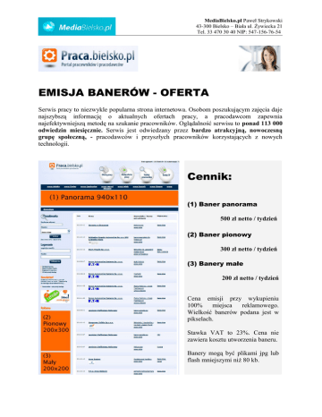 MediaBielsko.pl Paweł Strykowski 43-300 Bielsko – Biała ul. Żywiecka 21 Tel. 33 470 30 40 NIP: 547-156-76-54 EMISJA BANERÓW - OFERTA Serwis pracy to niezwykle popularna strona internetowa. Osobom poszukującym zajęcia daje najszybszą informację o aktualnych ofertach pracy, a pracodawcom zapewnia najefektywniejszą metodę na szukanie pracowników. Oglądalność serwisu to ponad 113 000 odwiedzin miesięcznie. Serwis jest odwiedzany przez bardzo atrakcyjną, nowoczesną grupę społeczną, - pracodawców i przyszłych pracowników korzystających z nowych technologii. Cennik: (1) Baner panorama 500 zł netto / tydzień (2) Baner pionowy 300 zł netto / tydzień (3) Banery małe 200 zł netto / tydzień Cena emisji przy wykupieniu 100% miejsca reklamowego. Wielkość banerów podana jest w pikselach. Stawka VAT to 23%. Cena nie zawiera kosztu utworzenia baneru. Banery mogą być plikami jpg lub flash mniejszymi niż 80 kb. MediaBielsko.pl Paweł Strykowski 43-300 Bielsko – Biała ul. Żywiecka 21 Tel. 33 470 30 40 NIP: 547-156-76-54 Serwis www.praca.biala.pl, to skuteczny portal zarówno dla osób, które poszukują pracy jak i dla pracodawców. To miejsce gdzie można znaleźć największą liczbę aktualnych ofert pracy z całego Podbeskidzia. Serwis podzielony jest na moduły związane z miastami. Moduły tematyczne związane z miastami: • • • • Praca Bielsko Praca Żywiec Praca Czechowice Praca Ustroń • • • • Praca Wisła Praca Szczyrk Praca Cieszyn Praca Skoczów Statystyki: Statystyki popularności i oglądalności (grudzień 2010): • • • • • • • liczba ogłoszeń w bazie danych: 1139 liczba CV dodanych przez potencjalnych pracowników: 485 liczba osób czytających oferty w formie mail'i: 7325 miesięczna liczba odwiedzin:113 tysięcy miesięczna liczba odsłon: 434 tysiące pierwsza pozycja w Google: "praca bielsko", "praca bielsko – biała" na życzenie klienta udostępniamy statystyki: Google Statistics. W sprawie reklamy prosimy o kontakt: Elżbieta Pysz tel./fax.: 33 470 30 42, tel. 783 223 018 email: [email protected] W sprawie publikacji ogłoszeń oraz płatności prosimy o kontakt: Edyta Fołta tel./fax.: 33 470 30 40, tel. 692 796 308 email: [email protected]