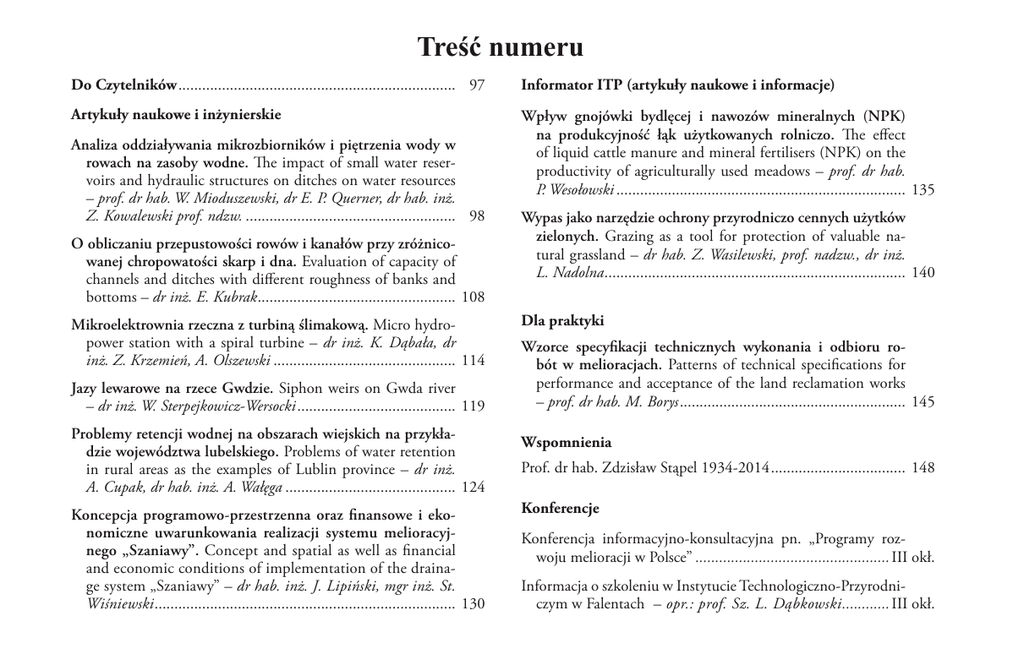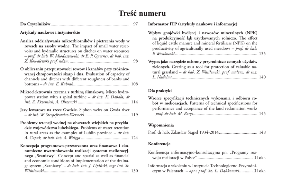 TreĞü numeru Do Czytelników ...................................................................... 97 Informator ITP (artykuły naukowe i informacje) Artykuły naukowe i inżynierskie Wpływ gnojówki bydlęcej i nawozów mineralnych (NPK) na produkcyjność łąk użytkowanych rolniczo. The effect of liquid cattle manure and mineral fertilisers (NPK) on the productivity of agriculturally used meadows – prof. dr hab. P. Wesołowski ......................................................................... 135 Analiza oddziaływania mikrozbiorników i piętrzenia wody w rowach na zasoby wodne. The impact of small water reservoirs and hydraulic structures on ditches on water resources – prof. dr hab. W. Mioduszewski, dr E. P. Querner, dr hab. inż. Z. Kowalewski prof. ndzw. ..................................................... 98 O obliczaniu przepustowości rowów i kanałów przy zróżnicowanej chropowatości skarp i dna. Evaluation of capacity of channels and ditches with different roughness of banks and bottoms – dr inż. E. Kubrak.................................................. 108 Mikroelektrownia rzeczna z turbiną ślimakową. Micro hydropower station with a spiral turbine – dr inż. K. Dąbała, dr inż. Z. Krzemień, A. Olszewski .............................................. 114 Jazy lewarowe na rzece Gwdzie. Siphon weirs on Gwda river – dr inż. W. Sterpejkowicz-Wersocki ........................................ 119 Problemy retencji wodnej na obszarach wiejskich na przykładzie województwa lubelskiego. Problems of water retention in rural areas as the examples of Lublin province – dr inż. A. Cupak, dr hab. inż. A. Wałęga ........................................... 124 Koncepcja programowo-przestrzenna oraz finansowe i ekonomiczne uwarunkowania realizacji systemu melioracyjnego „Szaniawy”. Concept and spatial as well as financial and economic conditions of implementation of the drainage system „Szaniawy” – dr hab. inż. J. Lipiński, mgr inż. St. Wiśniewski ............................................................................ 130 Wypas jako narzędzie ochrony przyrodniczo cennych użytków zielonych. Grazing as a tool for protection of valuable natural grassland – dr hab. Z. Wasilewski, prof. nadzw., dr inż. L. Nadolna ............................................................................ 140 Dla praktyki Wzorce specyfikacji technicznych wykonania i odbioru robót w melioracjach. Patterns of technical specifications for performance and acceptance of the land reclamation works – prof. dr hab. M. Borys ......................................................... 145 Wspomnienia Prof. dr hab. Zdzisław Stąpel 1934-2014 .................................. 148 Konferencje Konferencja informacyjno-konsultacyjna pn. „Programy rozwoju melioracji w Polsce” ................................................. III okł. Informacja o szkoleniu w Instytucie Technologiczno-Przyrodniczym w Falentach – opr.: prof. Sz. L. Dąbkowski ............ III okł.