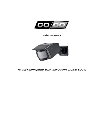 WAŻNE INFORMACJE PIR-2050 ZEWNĘTRZNY BEZPRZEWODOWY CZUJNIK RUCHU KOMPATYBILNOŚĆ Nadajnik ten pracuje ze wszystkimi nadajnikami COCO. FUNKCJONALNOŚĆ Zewnętrzny czujnik ruchu do sterowania jednym lub więcej odbiornikami on/off. Jest on kompatybilny z dzwonkiem do drzwi COCO. DANE TECHNICZNE • • • • • • • Baterie: Radiowa częstotliwość pracy: Zasięg pracy: Zakres wykrywania: Poziomy kąt wykrywania: Programowalne wyłączanie opóźnienia: Programowalny poziom intensywności światła: 3 x 1,5 V AA (alkaliczne) 433,92 MHz Do 30 m wewnątrz/ 70 m na zewnątrz do 10 m 20° do 110° 15, 30, 45 sekund, 1, 2, 3, 4 minut ustawienia własne UWAGI • • • Unikać łączenia tego bezprzewodowego czujnika ruchu z regulatorem oświetlenia COCO. Należy pamiętać, że czynniki zewnętrzne (pochmurna lub deszczowa pogoda, światła samochodowe, światła uliczne) mogą wpływać na obserwowane natężenie oświetlenia. Upewnić się, że odbiorniki, które bedą sterowane są w zasięgu zasięgu bezprzewodowego czujnika. BEZPRZEWODOWY SYGNAŁ O CZĘSTOTLIWOŚĆI RADIOWEJ • • • • Sygnał radiowy o częstotliwości 433,92 MHz przechodzi przez ściany, okna i drzwi Zasięg pracy wewnątrz: aż do 30 m . zasięg pracy na zewnątrz: 70 m (optymalne warunki) Zasięg pracy silnie zależy od lokalnych warunków takich jak obecność metali. Na przykład cienka metalowa powłoka w nisko-emisyjnym szkle ma negatywny wpływ na zasięg sygnały radiowego. Mogą istnieć ograniczenia w stosowaniu tego urządzenia poza Unią Europejską. W stosownych przypadkach sprawdzić, czy to urządzenie jest zgodne z lokalnymi dyrektywami. Przeczytaj te proste wskazówki. Nieprzestrzeganie tych wytycznych może być niebezpieczne,a niewłaściwa instalacja spowoduje unieważnienie gwarancji , która może mieć zastosowanie do tego produktu. 2 BATERIA Wyjmij baterię, jeśli produkt nie będzie używany przez dłuższy czasu. Ekstremalne temperatury zmniejszają pojemność oraz żywotność baterii. Wydajność baterii jest szczególnie niska w temperaturach poniżej 0° C. Należy wymienić baterię, gdy zasięg nadajnika zacznie spadać. Nie rzucać, palić lub łamać baterii. Wyrzucaj baterię zgodnie z lokalnymi przepisami. O ile to możliwe oddaj baterię do recyklingu. Nie wyrzucaj razem z odpadami komunalnymi. NAPRAWA Nie próbować naprawiać tego urządzenia. Nie ma żadnych części wymagających obsługi wewnątrz. WODOODPORNOŚĆ Produkt ten jest wodoodporny w klasie IP44. CZYSZCZENIE Należy używać suchego materiału do czyszczenia tego urządzenia. Nie używać żrących chemikaliów, rozpuszczalników oraz silnych detergentów. OBSŁUGA Nie rzucać, uderzać lub potrząsać urządzeniem. Nieostrożne obchodzenie się z tym urządzeniem może spowodować uszkodzenia wewnętrznych podzespołów elektronicznych i delikatnych mechanizmów. PODTRZYMYWANIE ŻYCIA Nigdy nie używać produktów COCO do systemów podtrzymywania życia oraz innych aplikacji, w których awarie urządzenia może powodować konsekwencje zagrażające życiu. ZAKŁÓCENIA Wszystkie bezprzewodowe urządzenia mogą być podatne na zakłócenia, które mogą wpływać na jakość pracy. Minimalna odległość pomiędzy dwoma odbiornikami powinna wynosić co najmniej 50 m. ŚRODOWISKO Nie należy narażać tego produktu na nadmierne ciepło lub zimno, ponieważ może to spowodować skrócenie życia elektronicznych podzespołów. 3