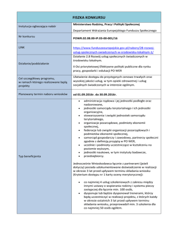 FISZKA KONKURSU Instytucja ogłaszająca nabór Ministerstwo Rodziny, Pracy i Polityki Społecznej Departament Wdrażania Europejskiego Funduszu Społecznego Nr konkursu LINK POWR.02.08.00-IP.03-00-001/16 https://www.funduszeeuropejskie.gov.pl/nabory/28-rozwojuslug-spolecznych-swiadczonych-w-srodowisku-lokalnym-1/ Działanie 2.8 Rozwój usług społecznych świadczonych w środowisku lokalnym. Działanie/poddziałanie II Osi priorytetowej Efektywne polityki publiczne dla rynku pracy, gospodarki i edukacji PO WER Cel szczegółowy programu, w ramach którego realizowane będą projekty Ułatwienie dostępu do przystępnych cenowo trwałych oraz wysokiej jakości usług, w tym opieki zdrowotnej i usług socjalnych świadczonych w interesie ogólnym. Planowany termin naboru wniosków od 01.09.2016r. do 30.09.2016r. Typ beneficjenta administracja rządowa i jej jednostki podległe oraz nadzorowane, jednostki samorządu terytorialnego i ich jednostki organizacyjne, stowarzyszenia i związki jednostek samorządu terytorialnego, organizacje pozarządowe, podmioty ekonomii społecznej, federacje lub związki organizacji pozarządowych i podmiotów ekonomii społecznej, samorząd gospodarczy i zawodowy, partnerzy społeczni zgodnie z definicją przyjętą w PO WER, uczelnie i podmioty uczestniczące w kształceniu na poziomie wyższym, jednostki naukowe, w tym instytuty badawcze, przedsiębiorcy. Jednocześnie Wnioskodawca łącznie z partnerami (jeżeli dotyczy) posiada udokumentowane doświadczenie w realizacji w okresie 3 lat przed upływem terminu składania wniosku (Kryterium dostępu nr 1 karty oceny merytorycznej): co najmniej 4 usług szkoleniowych z zakresu między innymi ustawy o wspierania rodziny i systemu pieczy zastępczej dla łącznie min. 100 osób, dysponuje lub będzie dysponował trenerami, którzy będą uczestniczyć w realizacji projektu, z których każdy w okresie ostatnich 3 lat przed upływem terminu składania wniosku, przeprowadził min. 3 szkolenia dla co najmniej 50 osób ogółem. Planowana alokacja (PLN)/ Maksymalna wartość projektu Wymagany wkład własny 21 654 000 PLN (makroregion centralny (województwa: łódzkie, mazowieckie, kujawsko-pomorskie) - 5 416 000 PLN). Każdy Projektodawca składa nie więcej niż 1 wniosek o dofinansowanie w ramach danego konkursu na kwotę nie mniejszą niż 500 000 PLN. Wymagany wkład własny Wnioskodawcy do realizacji projektu wynosi co najmniej 3,00 % wartości projektu. Typy projektów przewidziane do realizacji w ramach konkursu Przedmiotem konkursu jest dofinansowanie projektów, mających na celu przeprowadzenie szkoleń dla przedstawicieli jednostek systemu wspierania rodziny i pieczy zastępczej, w tym również podmiotów, którym zlecono realizację zadań z zakresu ustawy o wspieraniu rodziny i systemu pieczy zastępczej oraz służb zaangażowanych w realizację zadań wynikających z ustawy o wspieraniu rodziny i systemie pieczy zastępczej funkcjonujących na wszystkich szczeblach samorządu terytorialnego, jak również pracowników instytucji uczestniczących zarówno w działaniach skierowanych bezpośrednio na wsparcie rodziny i pieczy zastępczej, jak i bezpośrednio pracujących z i na rzecz rodzin biologicznych. ZAKŁADANE EFEKTY KONKURSU WYRAŻONE WSKAŹNIKAMI WSKAŹNIKI REZULTATU Liczba pracowników instytucji systemu wspierania rodziny i pieczy zastępczej, którzy podnieśli kompetencje w zakresie wspierania rodziny i systemu pieczy zastępczej. WSKAŹNIKI PRODUKTU Liczba pracowników instytucji systemu wspierania rodziny i pieczy zastępczej objętych wsparciem w zakresie wspierania rodziny i systemu pieczy zastępcze. SZCZEGÓŁOWE KRYTERIA WYBORU PROJEKTÓW FORMALNE KRYTERIA DOSTĘPU MERYTORYCZNE KRYTERIA DOSTĘPU Wydatki w projekcie o wartości nieprzekraczającej wyrażonej w PLN równowartości kwoty 100 000 EUR wkładu publicznego6 są rozliczane uproszczonymi metodami. 1. Czy okres realizacji projektu nie jest dłuższy niż 36 miesięcy? 2. Czy Wnioskodawca złożył nie więcej niż 1 wniosek o dofinansowanie w ramach danego konkursu na kwotę nie mniejszą niż 500 000 PLN? 3. Czy w przypadku realizacji projektu w partnerstwie, liczba partnerów nie przekroczyła czterech? 4. Czy do dofinansowania zostanie wybrany projekt, dla którego negocjacje zakończyły się wynikiem pozytywnym? 1. Czy Projektodawca łącznie z partnerami (jeżeli dotyczy) posiada udokumentowane doświadczenie w realizacji co najmniej 4 usług szkoleniowych z zakresu między innymi ustawy o wspierania rodziny i systemu pieczy zastępczej dla łącznie min. 100 osób, zrealizowanych w okresie 3 lat przed upływem terminu składania wniosku, oraz dysponuje lub będzie dysponował trenerami, z których każdy w okresie ostatnich 3 lat przed upływem terminu składania wniosku, przeprowadził minimum 3 szkolenia dla co najmniej 50 osób ogółem. 2. Czy merytoryczny zakres szkoleń obejmie między innymi następujące obszary: organizację polityki społecznej, pracę z rodziną, organizację pieczy zastępczej, problematykę psychologii rozwojowej dzieci i młodzieży, metodykę pracy z dzieckiem i rodziną, prawa dziecka? 3. Czy Projektodawca zapewnił, że szkolenie zostanie zrealizowane co najmniej w zakresie określonym przez IOK w załączniku 12 do Regulaminu konkursu? 4. Czy Projektodawca zapewnił, iż dostosuje zakres, formułę szkoleń do potrzeb poszczególnych grup odbiorców/uczestników. Projektodawca zapewni już na etapie uszczegóławiania poszczególnych bloków tematycznych, przeprowadzanie diagnozy potrzeb uczestników, w efekcie dostosowując ostatecznie tematy i zakres szkoleń do rzeczywistych wyników badania potrzeb uczestników. 5. Czy Projektodawca zapewni przeprowadzenie szkoleń dla przedstawicieli jednostek systemu wspierania rodziny i pieczy zastępczej, w tym również podmiotów, którym zlecono realizację zadań z zakresu ustawy o wspieraniu rodziny i systemu pieczy zastępczej oraz s