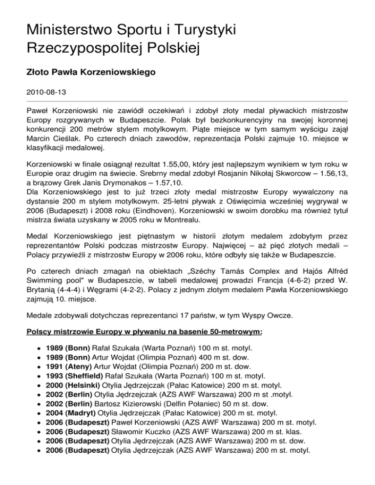 Ministerstwo Sportu i Turystyki Rzeczypospolitej Polskiej Złoto Pawła Korzeniowskiego 2010-08-13 Paweł Korzeniowski nie zawiódł oczekiwań i zdobył złoty medal pływackich mistrzostw Europy rozgrywanych w Budapeszcie. Polak był bezkonkurencyjny na swojej koronnej konkurencji 200 metrów stylem motylkowym. Piąte miejsce w tym samym wyścigu zajął Marcin Cieślak. Po czterech dniach zawodów, reprezentacja Polski zajmuje 10. miejsce w klasyfikacji medalowej. Korzeniowski w finale osiągnął rezultat 1.55,00, który jest najlepszym wynikiem w tym roku w Europie oraz drugim na świecie. Srebrny medal zdobył Rosjanin Nikołaj Skworcow – 1.56,13, a brązowy Grek Janis Drymonakos – 1.57,10. Dla Korzeniowskiego jest to już trzeci złoty medal mistrzostw Europy wywalczony na dystansie 200 m stylem motylkowym. 25-letni pływak z Oświęcimia wcześniej wygrywał w 2006 (Budapeszt) i 2008 roku (Eindhoven). Korzeniowski w swoim dorobku ma również tytuł mistrza świata uzyskany w 2005 roku w Montrealu. Medal Korzeniowskiego jest piętnastym w historii złotym medalem zdobytym przez reprezentantów Polski podczas mistrzostw Europy. Najwięcej – aż pięć złotych medali – Polacy przywieźli z mistrzostw Europy w 2006 roku, które odbyły się także w Budapeszcie. Po czterech dniach zmagań na obiektach „Széchy Tamás Complex and Hajós Alfréd Swimming pool" w Budapeszcie, w tabeli medalowej prowadzi Francja (4-6-2) przed W. Brytanią (4-4-4) i Węgrami (4-2-2). Polacy z jednym złotym medalem Pawła Korzeniowskiego zajmują 10. miejsce. Medale zdobywali dotychczas reprezentanci 17 państw, w tym Wyspy Owcze. Polscy mistrzowie Europy w pływaniu na basenie 50-metrowym: 1989 (Bonn) Rafał Szukała (Warta Poznań) 100 m st. motyl. 1989 (Bonn) Artur Wojdat (Olimpia Poznań) 400 m st. dow. 1991 (Ateny) Artur Wojdat (Olimpia Poznań) 200 m st. dow. 1993 (Sheffield) Rafał Szukała (Warta Poznań) 100 m st. motyl. 2000 (Helsinki) Otylia Jędrzejczak (Pałac Katowice) 200 m st. motyl. 2002 (Berlin) Otylia Jędrzejczak (AZS AWF Warszawa) 200 m st .motyl. 2002 (Berlin) Bartosz Kizierowski (Delfin Połaniec) 50 m st. dow. 2004 (Madryt) Otylia Jędrzejczak (Pałac Katowice) 200 m st. motyl. 2006 (Budapeszt) Paweł Korzeniowski (AZS AWF Warszawa) 200 m st. motyl. 2006 (Budapeszt) Sławomir Kuczko (AZS AWF Warszawa) 200 m st. klas. 2006 (Budapeszt) Otylia Jędrzejczak (AZS AWF Warszawa) 200 m st. dow. 2006 (Budapeszt) Otylia Jędrzejczak (AZS AWF Warszawa) 200 m st. motyl. 2006 (Budapeszt) Bartosz Kizierowski (Polonia Warszawa) 50 m st. dow. 2008 (Eindhoven) Paweł Korzeniowski (AZS AWF Warszawa) 200 m st. motyl. 2010 (Budapeszt) Paweł Korzeniowski (AZS AWF Warszawa) 200 m st. motyl.