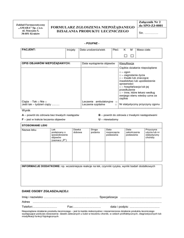 Zakład Farmaceutyczny „AMARA” Sp. z o.o. ul. Stacyjna 5, 30-851 Kraków FORMULARZ ZGŁOSZENIA NIEPOŻĄDANEGO DZIAŁANIA PRODUKTU LECZNICZEGO Załącznik Nr 2 do SPO-ZJ-0001 Str. ………… - POUFNE PACJENT: Inicjały Data urodzenia/wiek Płeć: K M Masa ciała □ □ OPIS OBJAWÓW NIEPOŻĄDANYCH: Data wystąpienia objawów ................................. Klasyfikacja Ciężkie działanie niepożądane □ – zgon □ – zagrożenie życia □ – trwałe lub znaczące inwalidztwo lub upośledzenie sprawności □ – hospitalizacja lub jej przedłużenie □ – inne, które lekarz według swojego stanu wiedzy uzna za ciężkie Leczenie ambulatoryjne □ Leczenie szpitalne □ Nr statystyczny przyczyny zgonu .................................................... Ciąża - Tak □ Nie □ Jeśli tak – tydzień ciąży .......... Wynik A – powrót do zdrowia bez trwałych następstw B – powrót do zdrowia z trwałymi następstwami F – jest w trakcie leczenia objawów U – niewiadomy STOSOWANE LEKI Nazwa leku Lek podejrzany o spowodowanie objawów (zaznacz „P”) Dawka dobowa Droga podania Data rozpoczęcia podawania Data zakończenia podawania Przyczyna użycia lub nr statystyczny choroby INFORMACJE DODATKOWE: np. wcześniejsze reakcje na lek, czynniki ryzyka, wyniki badań dodatkowych DANE OSOBY ZGŁASZAJĄCEJ: Imię i nazwisko ................................................................ Specjalizacja ................................................ Adres ...................................................................................................................................................... Telefon:............................ Fax:................................ data i podpis: ................................... Niepożądane działanie produktu leczniczego – jest to każde niekorzystne i niezamierzone działanie produktu leczniczego występujące podczas stosowania dawek zalecanych u ludzi w leczeniu chorób, w celach profilaktycznych, diagnostycznych lub modyfikacji funkcji fizjologicznych. Osoba odpowiedzialna za nadzór nad bezpieczeństwem farmakoterapii w ZF AMARA Mgr farm. Filip Półtoranos tel. 012 657 40 40 faks 012 658 80 49 tel. kom. 600 466 701 WYDZIAŁ MONITOROWANIA NIEPOŻĄDANYCH DZIAŁAŃ PRODUKTÓW LECZNICZYCH URZĄD REJESTRACJI PRODUKTÓW LECZNICZYCH, WYROBÓW MEDYCZNYCH I PRODUKTÓW BIOBÓJCZYCH ul. Ząbkowska 41 03-736 Warszawa Tel. 022 49 21 301 Faks 022 49 21 309