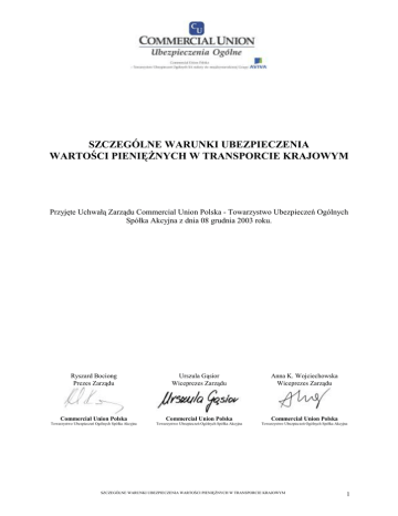 SZCZEGÓLNE WARUNKI UBEZPIECZENIA WARTOŚCI PIENIĘŻNYCH W TRANSPORCIE KRAJOWYM Przyjęte Uchwałą Zarządu Commercial Union Polska - Towarzystwo Ubezpieczeń Ogólnych Spółka Akcyjna z dnia 08 grudnia 2003 roku. Ryszard Bociong Prezes Zarządu Urszula Gąsior Wiceprezes Zarządu Anna K. Wojciechowska Wiceprezes Zarządu Commercial Union Polska Commercial Union Polska Commercial Union Polska Towarzystwo Ubezpieczeń Ogólnych Spółka Akcyjna Towarzystwo Ubezpieczeń Ogólnych Spółka Akcyjna Towarzystwo Ubezpieczeń Ogólnych Spółka Akcyjna SZCZEGÓLNE WARUNKI UBEZPIECZENIA WARTOŚCI PIENIĘŻNYCH W TRANSPORCIE KRAJOWYM 1 SPIS TREŚCI Postanowienia wstępne ..................................................................................................... Definicje ............................................................................................................................. Przedmiot ubezpieczenia ................................................................................................... Zakres ubezpieczenia ....................................................................................................... Minimalne środki bezpieczeństwa ..................................................................................... Suma ubezpieczenia .......................................................................................................... Wyłączenia ogólne ............................................................................................................ Wyłączenia szczegółowe .................................................................................................. Zawarcie umowy ubezpieczenia ....................................................................................... Składka ubezpieczeniowa ................................................................................................ Czas trwania umowy ubezpieczenia .................................................................................. Obowiązki ubezpieczającego w razie powstania szkody ................................................. Tryb dochodzenia roszczeń .............................................................................................. Ustalenie wysokości szkody .............................................................................................. Ustalenie wysokości odszkodowania ................................................................................ Wypłata odszkodowania ................................................................................................... Zabezpieczenie prawa do regresu ..................................................................................... Postanowienia dodatkowe ................................................................................................ Właściwość sądowa .......................................................................................................... Postanowienia końcowe ..................................................................................................... SZCZEGÓLNE WARUNKI UBEZPIECZENIA WARTOŚCI PIENIĘŻNYCH W TRANSPORCIE KRAJOWYM 3 3 4 4 4 5 5 5 6 6 6 7 7 8 8 8 8 8 9 9 2 SZCZEGÓLNE WARUNKI UBEZPIECZENIA WARTOŚCI PIENIĘŻNYCH W TRANSPORCIE KRAJOWYM §1. Postanowienia wstępne 1. 2. Niniejsze szczególne warunki ubezpieczenia wartości pieniężnych w transporcie krajowym (zwane dalej szczególnymi warunkami) stanowią podstawę do zawierania umów ubezpieczenia wartości pieniężnych w transporcie krajowym pomiędzy Commercial Union Polska Towarzystwem Ubezpieczeń Ogólnych SA (zwanym dalej Commercial Union) a osobami fizycznymi, osobami prawnymi lub jednostkami organizacyjnymi nieposiadającymi osobowości prawnej (zwanymi dalej Ubezpieczającym). Umowa ubezpieczenia może zostać zawarta również na rzecz innej osoby (Ubezpieczonego). W takim przypadku postanowienia niniejszych szczególnych warunków dotyczące Ubezpieczającego maja zastosowanie odpowiednio do osoby, na rzecz której zawarto umowę. 3) §2. Definicje 1. Ilekroć w niniejszych szczególnych warunkach, wniosku o zawarcie umowy ubezpieczenia, a także polisie lub innym dokumencie potwierdzającym zawarcie umowy ubezpieczenia oraz w innych pismach i oświadczeniach składanych w związku z zawarciem lub wykonywaniem tej umowy używa się wymienionych poniżej terminów, należy przez nie rozumieć: 1) jednostka obliczeniowa (j.o.) - jednostka użyta do określenia limitu przewożonych wartości pieniężnych wynosząca 120-krotność średniego wynagrodzenia miesięcznego w 6 działach gospodarki narodowej za ubiegły kwartał określonego w komunikacie kwartalnym Głównego Urzędu Statystycznego, 2) środek transportu - samochód specjalny - dostawczy lub ciężarowy - przystosowany do przewozu wartości pieniężnych, spełniający łącznie następujące wymagania: a) posiadający opancerzony przedział osobowy z 5 miejscami oraz całkowicie odrębny przedział ładunkowy wzmocniony przy użyciu blachy stalowej o grubości min. 1 mm wykonanej ze stali konstrukcyjnej wyższej jakości, łączonej w sposób trwały; b) wyposażony w: urządzenia łączności radiowej, sygnał alarmowy dwutonowy mocowany w przedziale silnikowym; włączenie alarmu powinno być łatwo dostępne przez kierowcę lub członka załogi oraz samoczynnie włączające się przy próbie niepowołanego otwarcia każdych drzwi, elektromechaniczny zawór odcinający dopływ paliwa lub inne urządzenie dające ten sam skutek, c) przedział osobowy, zbiornik paliwa, oszklenie kabiny odporne na przestrzelenie pociskami kalibru 7,62 mm wystrzeliwanymi z karabinka AK-47, d) przedział ładunkowy oświetlony tak, aby istniała możliwość jego obserwacji przez szklany wziernik o średnicy 60 mm z przedziału osobowego oraz posiadający tylko jedne drzwi zewnętrzne, z zawiasami o sworzniach zabezpieczonych przed wybiciem; drzwi powinny być wyposażone w 