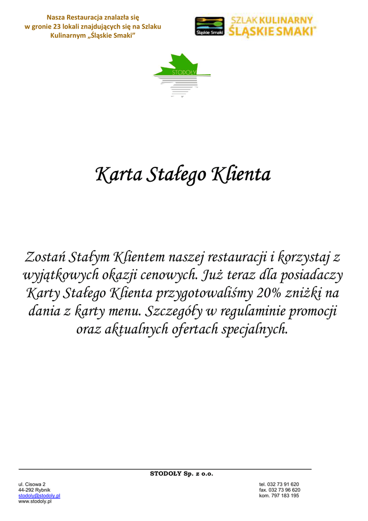 Nasza Restauracja znalazła się w gronie 23 lokali znajdujących się na Szlaku Kulinarnym „Śląskie Smaki” Karta Stałego Klienta Zostań Stałym Klientem naszej restauracji i korzystaj z wyjątkowych okazji cenowych. Już teraz dla posiadaczy Karty Stałego Klienta przygotowaliśmy 20% zniżki na dania z karty menu. Szczegóły w regulaminie promocji oraz aktualnych ofertach specjalnych. ______________________________________________________________________________________________ STODOŁY Sp. z o.o. ul. Cisowa 2 44-292 Rybnik [email protected] www.stodoly.pl tel. 032 73 91 620 fax. 032 73 96 620 kom. 797 183 195 KARTA STAŁEGO KLIENTA RESTAURACJI STODOŁY Regulamin Posiadacza Karty Stałego Klienta (KSK) §1 Wystawca i właściciel karty 1. Wystawcą i właścicielem Karty Stałego Klienta Restauracji STODOŁY jest firma: STODOŁY Sp. z o.o. ul. Jana Dekreta 24, 30-703 Kraków §2 Użytkownik Karty Stałego Klienta 1. Użytkownikiem Karty Stałego Klienta może być osoba fizyczna lub firma, która wypełniła formularz KSK oraz zobowiązała się do zaakceptowania i przestrzegania postanowień niniejszego regulaminu. 2. Użytkownik KSK wyraża zgodę na przetwarzanie i przechowywanie danych osobowych oraz na ich wykorzystywanie do celów promocyjnych i marketingowych przez Właściciela Karty. §3 Osoby uprawnione do korzystania z rabatu 1. Kartą Stałego Klienta może posługiwać się wyłącznie osoba, której odręczny podpis widnieje w Formularzu Karty Stałego Klienta. 2. Karty nie można odstępować, nie podlega odsprzedaży, ani nie ma możliwości cesji na inną osobę. 3. Karta nie jest kartą kredytową, płatniczą ani bankomatową i może być używana tylko zgodnie z Regulaminem Posiadacza Karty. §4 Przywileje i ograniczenia związane z kartą 1. Karta upoważnia do korzystania z ofert specjalnych i czasowych restauracji STODOŁY. 2. Oferty specjalne i czasowe są objęte odrębnym regulaminem. 3. Klienci zostaną poinformowani o bieżących ofertach e-mailem, oferty zostaną umieszczone także na stronie internetowej www.stodoly.pl oraz www.facebook.pl/stodoly §5 Termin ważności karty 1. Wystawca Karty Stałego Klienta ma prawo unieważnić kartę w przypadku zmiany ogólnych zasad programu „Karta Stałego Klienta. 2. Wystawca Karty Stałego Klienta zastrzega sobie prawo do zakończenia programu „Karta Stałego Klienta” w każdej chwili bez podania przyczyny. 3. W przypadku uszkodzenia, zniszczenia, zgubienia lub kradzieży Wystawca KSK nie jest zobowiązany do wystawienia duplikatu karty. ______________________________________________________________________________________________ STODOŁY Sp. z o.o. ul. Cisowa 2 44-292 Rybnik [email protected] www.stodoly.pl tel. 032 73 91 620 fax. 032 73 96 620 kom. 797 183 195 Oferta specjalna 20 % rabatu na dania z karty 1. Oferta obowiązuje od 2 listopada 2014 do 30 marca 2015 roku. 2. Promocja upoważnia klienta do 20% rabatu na dania z karty menu. 3. Rabat przyznawany jest na ogólną sumę rachunku wyłączając kwoty za napoje alkoholowe. 4. Rabat nie zostanie uznany w przypadku zamówienia wyłącznie napoi. 5. Warunkiem przyznania zniżki jest okazanie Karty Stałego Klienta obsłudze restauracji przed wydrukiem rachunku za usługę. 6. Rabat nie działa wstecz. 7. Zniżka nie łączy się z innymi promocjami i rabatami okazjonalnymi. 8. Rabat nie dotyczy imprez okolicznościowych. ______________________________________________________________________________________________ STODOŁY Sp. z o.o. ul. Cisowa 2 44-292 Rybnik [email protected] www.stodoly.pl tel. 032 73 91 620 fax. 032 73 96 620 kom. 797 183 195