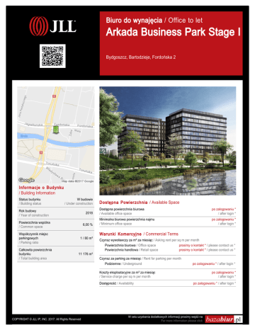 Biuro do wynajęcia / Office to let Arkada Business Park Stage I Bydgoszcz, Bartodzieje, Fordońska 2 Informacje o Budynku / Building Information Status budynku / Building status W budowie / Under construction Rok budowy / Year of construction 2018 Powierzchnia wspólna / Common space Współczynnik miejsc parkingowych / Parking ratio Całkowita powierzchnia budynku / Total building area 6,00 % 1 / 80 m² Dostępna Powierzchnia / Available Space Dostępna powierzchnia biurowa / Available office space po zalogowaniu * / after login * Minimalna biurowa powierzchnia najmu / Minimum office space po zalogowaniu * / after login * Warunki Komercyjne / Commercial Terms Czynsz wywoławczy za m² za miesiąc / Asking rent per sq m per month Powierzchnia biurowa / Office space prosimy o kontakt * / please contact us * Powierzchnia handlowa / Retail space prosimy o kontakt * / please contact us * 11 176 m² Czynsz za parking za miesiąc / Rent for parking per month Podziemne / Underground po zalogowaniu * / after login * Koszty eksploatacyjne za m² za miesiąc / Service charge per sq m per month Dostępność / Availability COPYRIGHT © JLL IP, INC. 2017. All Rights Reserved po zalogowaniu * / after login * po zalogowaniu * / after login * W celu uzyskania dodatkowych informacji prosimy wejdź na For more information please click Dostępna Powierzchnia / Available Space Piętro / Floor Powierzchnia wolna / Vacant space Dostępność / Availability 0 ** prosimy o kontakt * / please contact us * prosimy o kontakt * / please contact us * 1 prosimy o kontakt * / please contact us * prosimy o kontakt * / please contact us * 5 prosimy o kontakt * / please contact us * prosimy o kontakt * / please contact us * 6 prosimy o kontakt * / please contact us * prosimy o kontakt * / please contact us * 7-8 prosimy o kontakt * / please contact us * prosimy o kontakt * / please contact us * 9 prosimy o kontakt * / please contact us * prosimy o kontakt * / please contact us * Razem / Total po zalogowaniu * / after login * (**) Powierzchnia biurowa-handlowa / Office-retail space Standardowe Wykończenie / Standard Fit-Out Typowy Plan Piętra / Typical Floor Plan Klimatyzacja / Air conditioning Podnoszone podłogi / Raised floor Podwieszany sufit / Suspended ceiling Okablowanie telefoniczne / Telephone cabling Okablowanie komputerowe / Computer cabling Okablowanie elektryczne / Power cabling Tryskacze / Sprinklers Czujniki dymu / Smoke detectors Wykładzina / Carpeting Podział powierzchni ściankami (opcja) / Wall partitioning (option) Recepcja / Reception Ochrona budynku / Security Kable światłowodowe / Fiber optics Kontrola dostępu do budynku / Access control Uchylne okna / Openable windows Dwustronne zasilanie / Emergency power supply BMS / BMS W celu uzyskania dodatkowych informacji lub zorganizowania spotkania prosimy o kontakt: / For more information or to arrange a viewing please contact: +48 58 350 62 62 Niniejsze warunki mają charakter wyłącznie informacyjny i nie stanowią części wiążącej oferty lub umowy. / The Property Particulars are for information purposes only and do not form any part of binding offer or contract. COPYRIGHT © JLL IP, INC. 2017. All Rights Reserved W celu uzyskania dodatkowych informacji prosimy wejdź na For more information please click